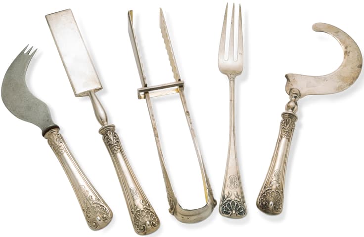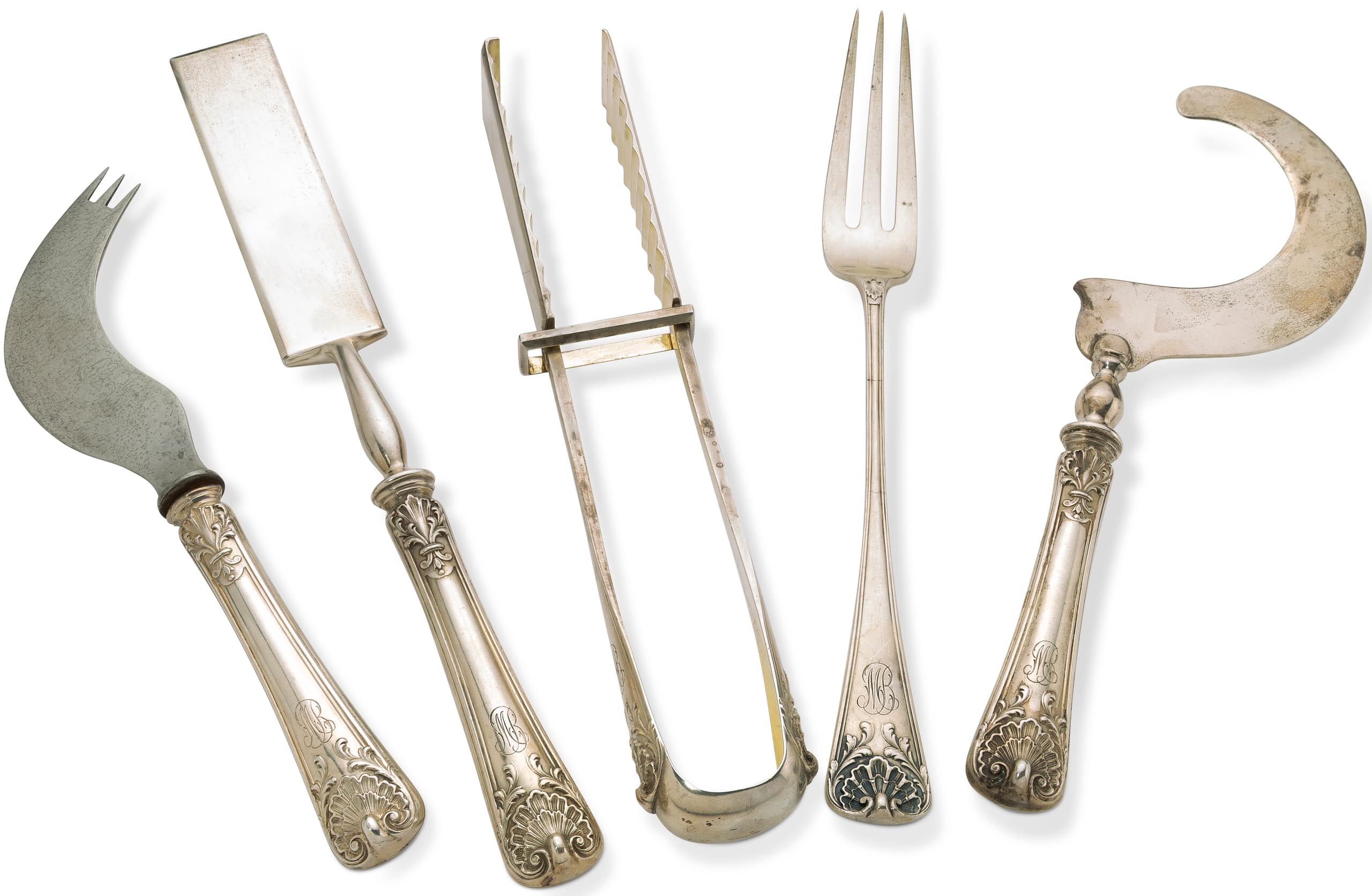 FABERGÉ SILVER AND SILVER-GUILT CUTLERY SET ADORNED WITH SHELLS, ACANTHUS LEAVES AND MONOGRAMMED ‘MB’, 5 PIECES House of Fabergé, Supplier to the Court of His Imperial Majesty, Moscow, 1908-1917