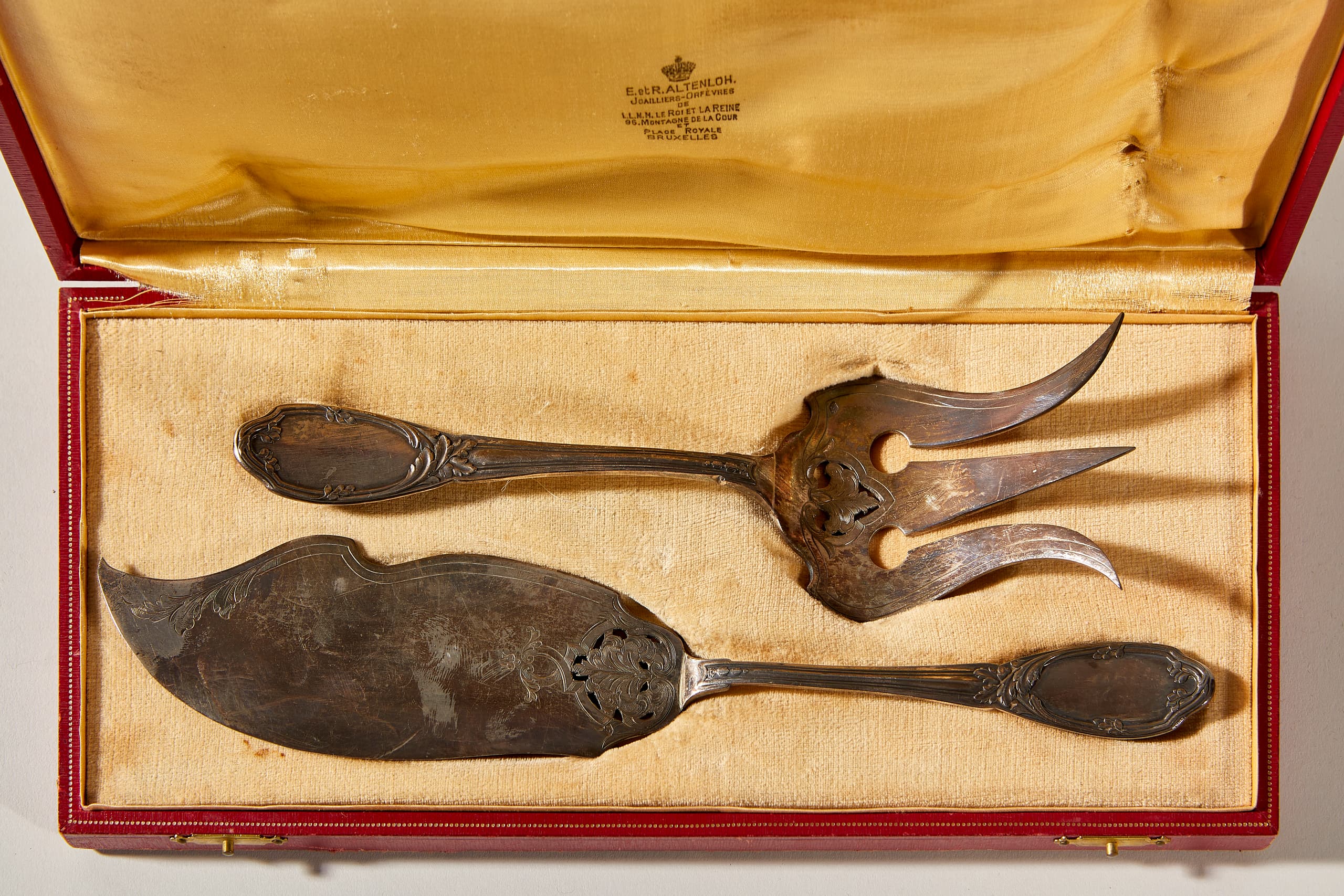 silver fish service cutlrey decorated with nets and acanthus leaves comprising :