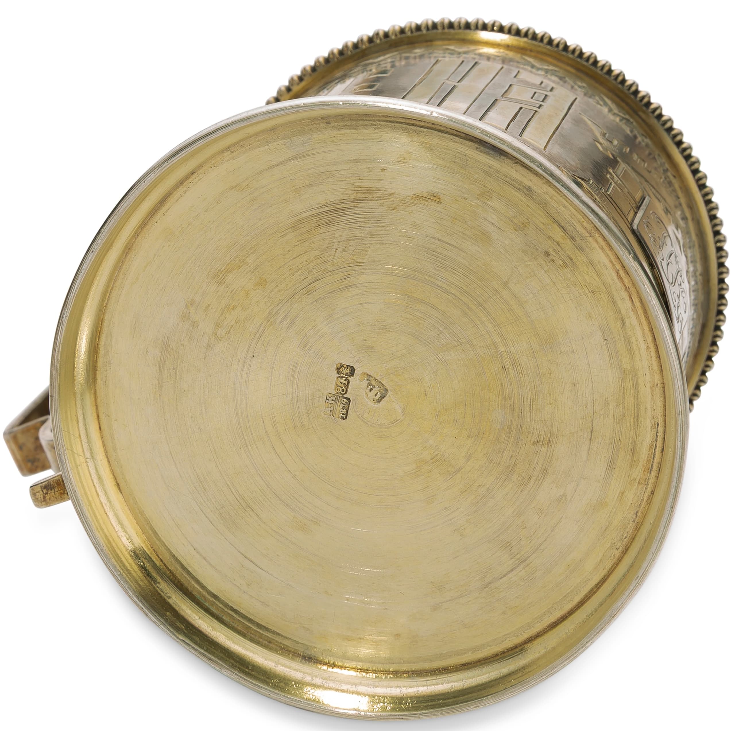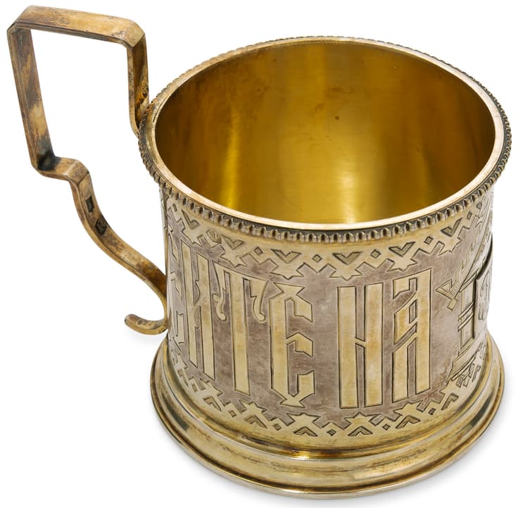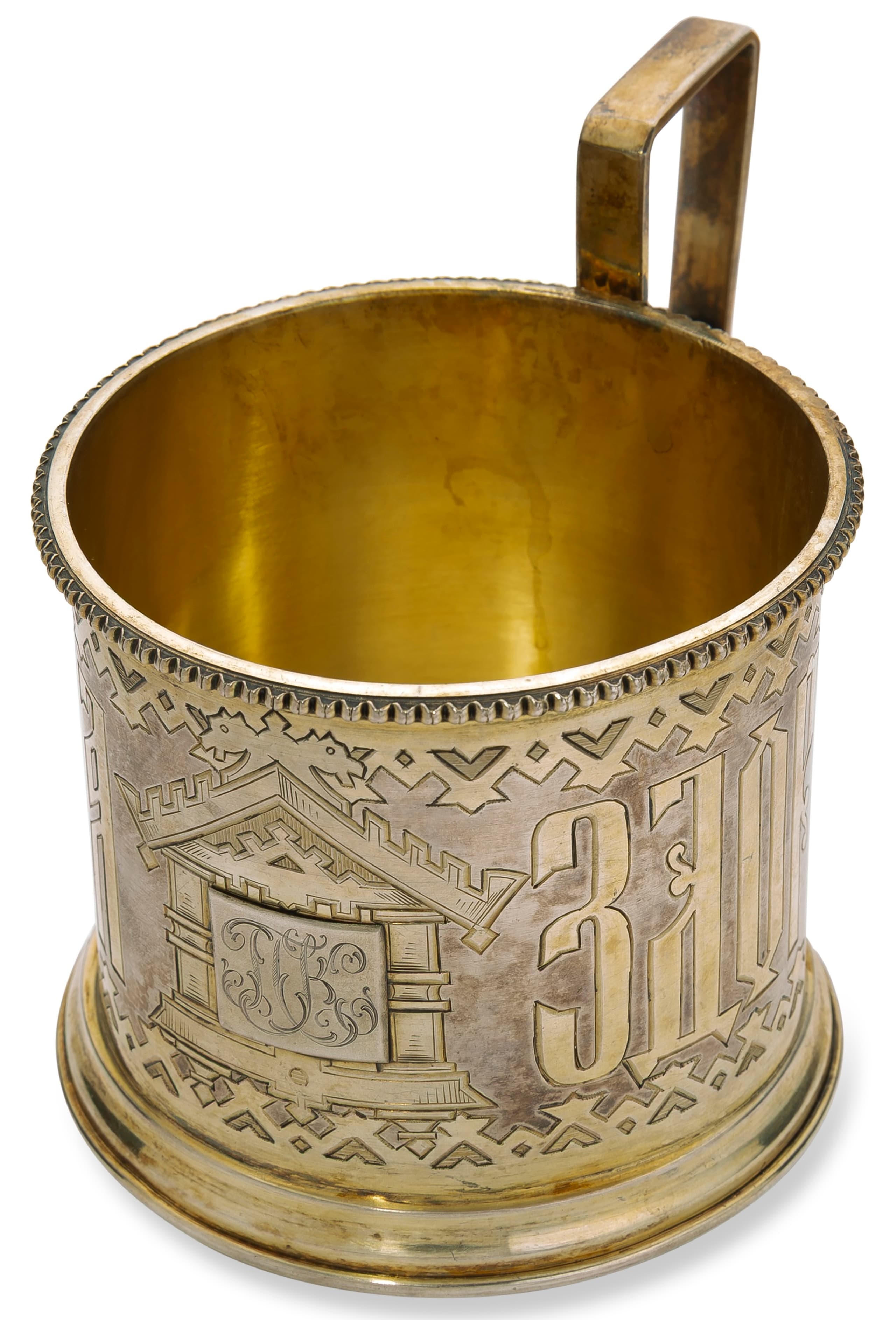 RUSSIAN SILVER GILT TEA GLASS HOLDER ‘DRINK TO YOUR HEALTH’