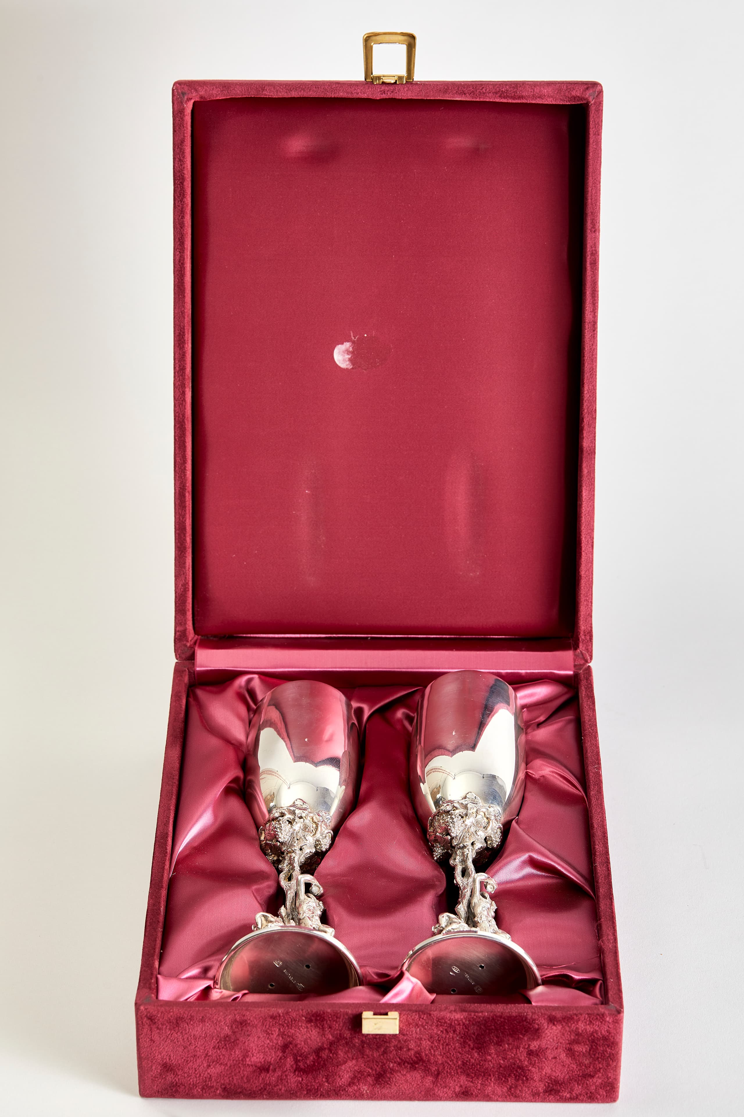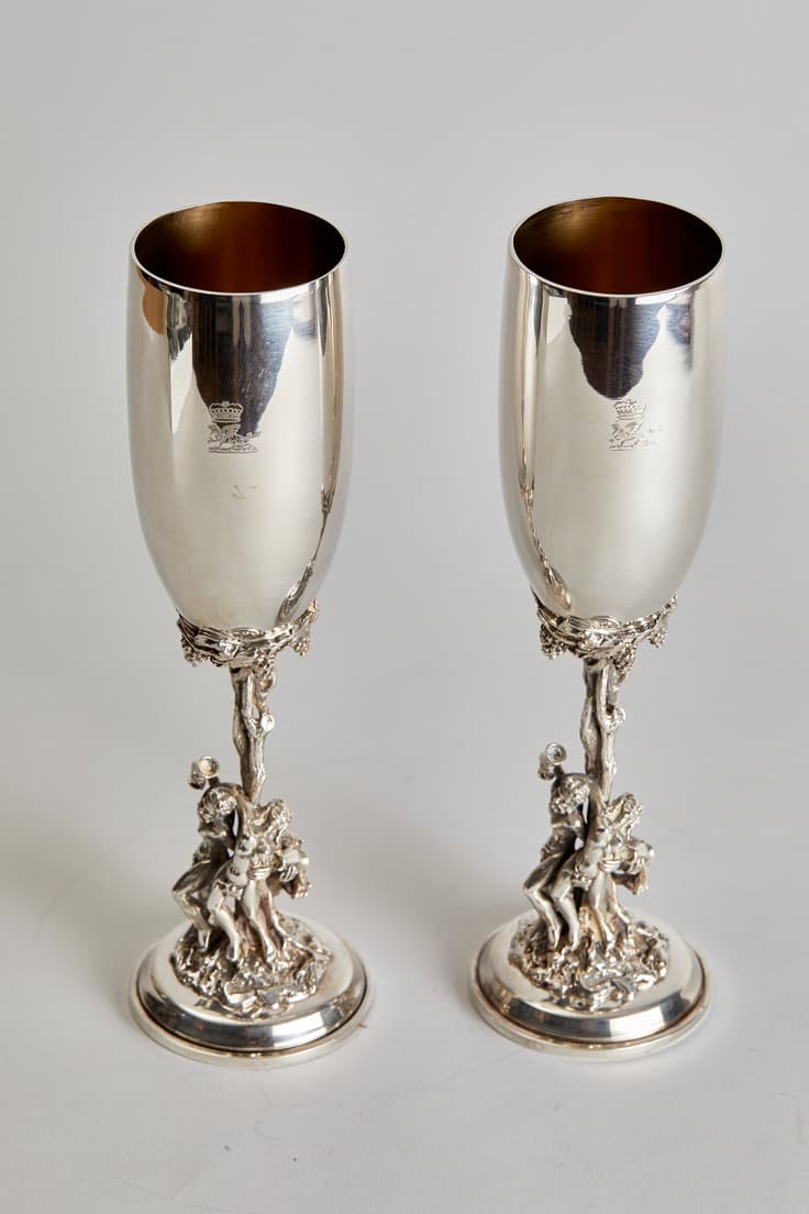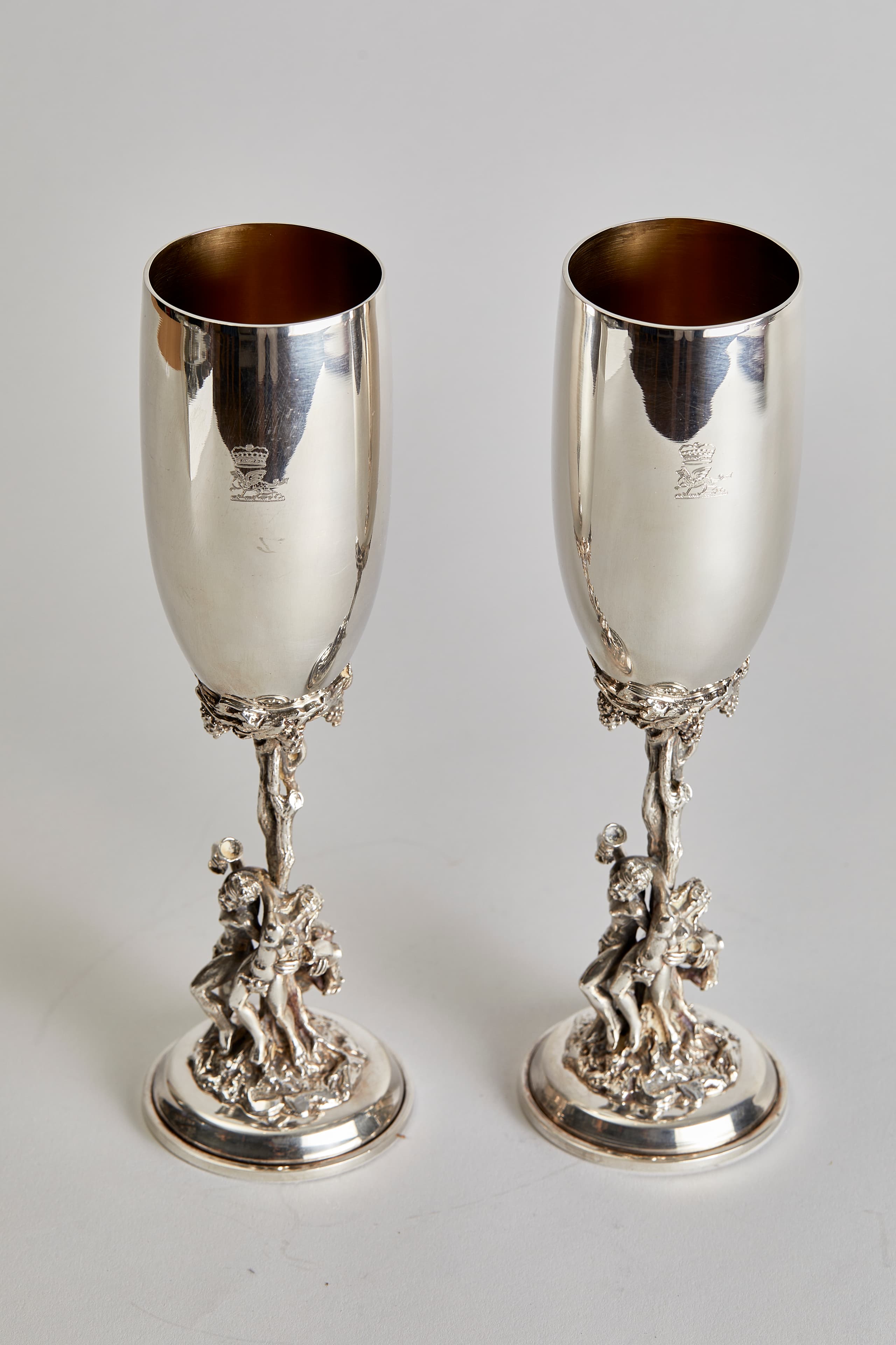 he stems feature a finely engraved bacchanalian scene. Each goblet is decorated with a winged lion beneath a crown. Interior silver-gilt