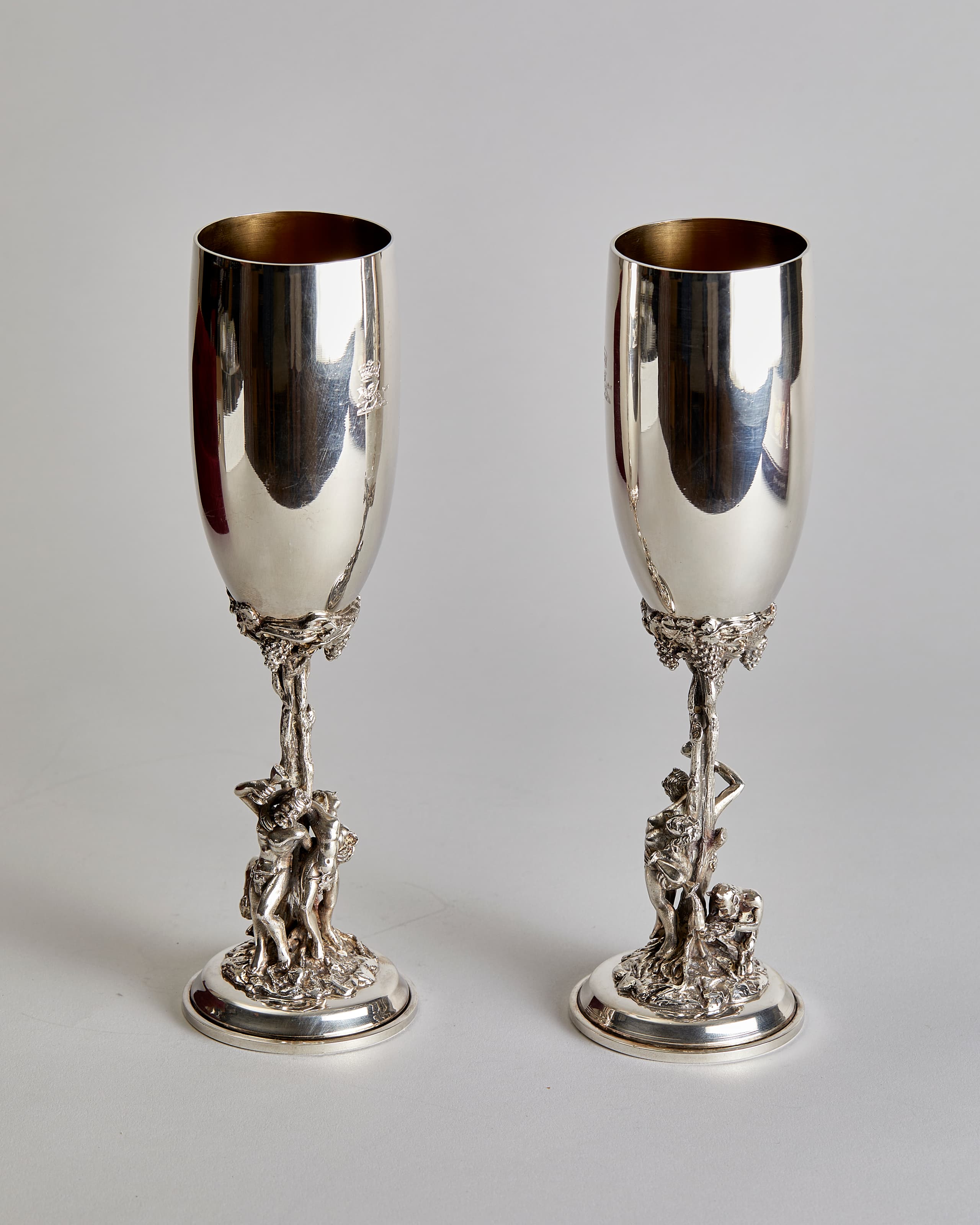 PAIR OF SOLID SILVER CHAMPAGNE FLUTES, ENGRAVED STEM AND GILDED INTERIOR