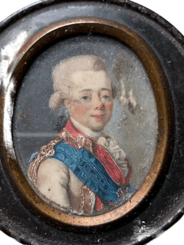 An oval portrait miniature of Emperor Paul I (1754–1801), depicted chest-length, wearing the moiré sash of the Order of St. Andrew the First-Called