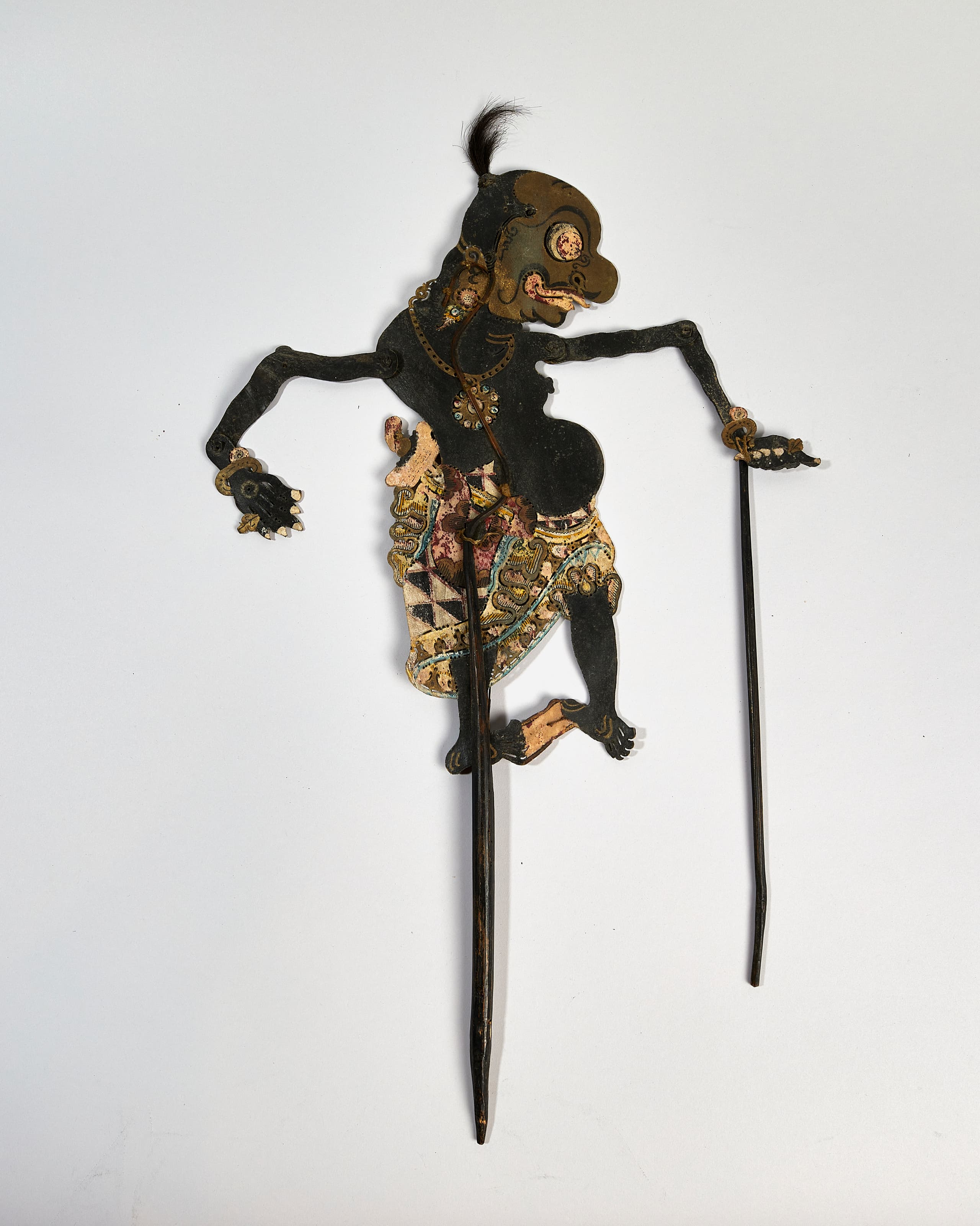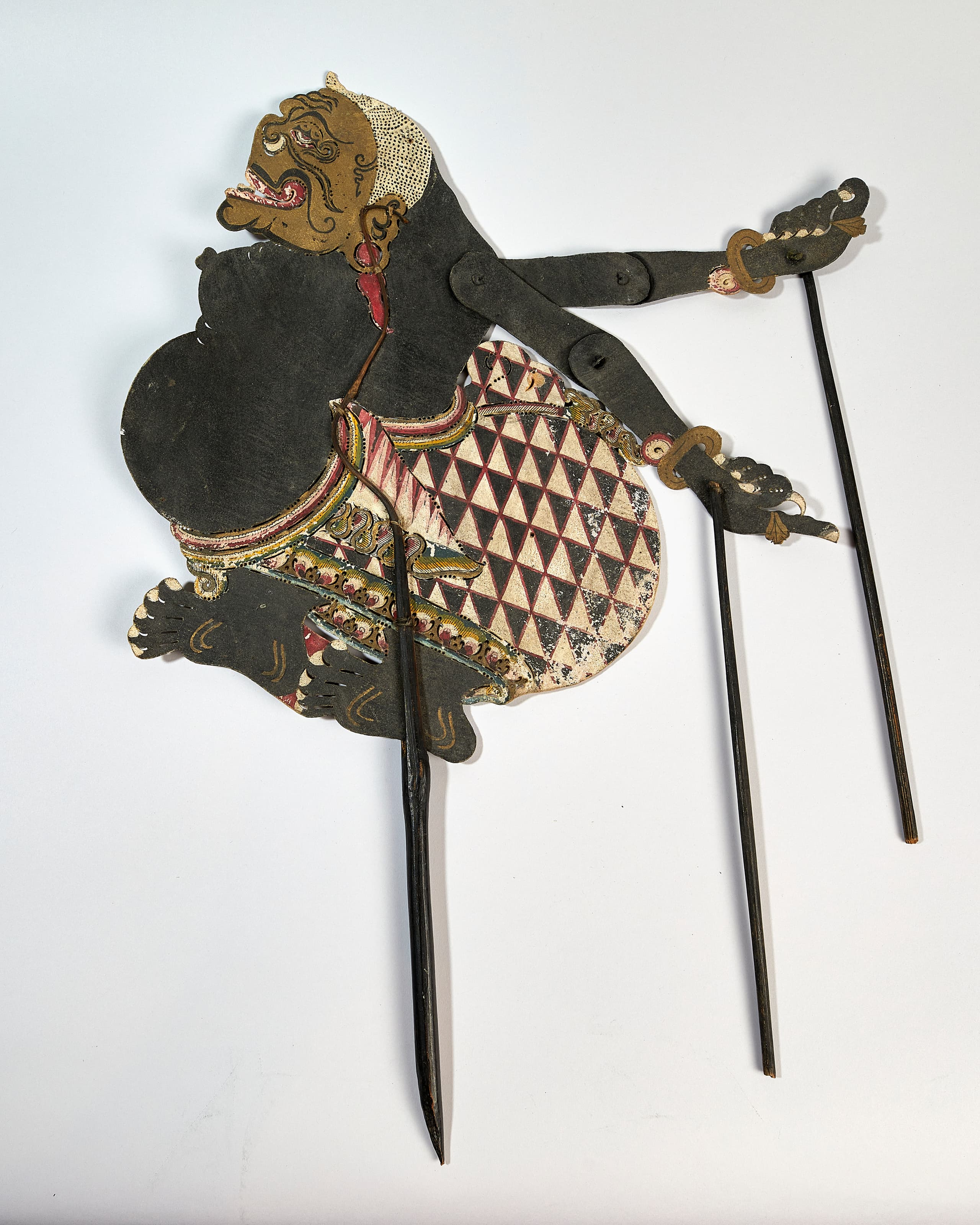 Each crafted from polychrome-painted leather with carved wooden handles, depicting characters from traditional Javanese theatre