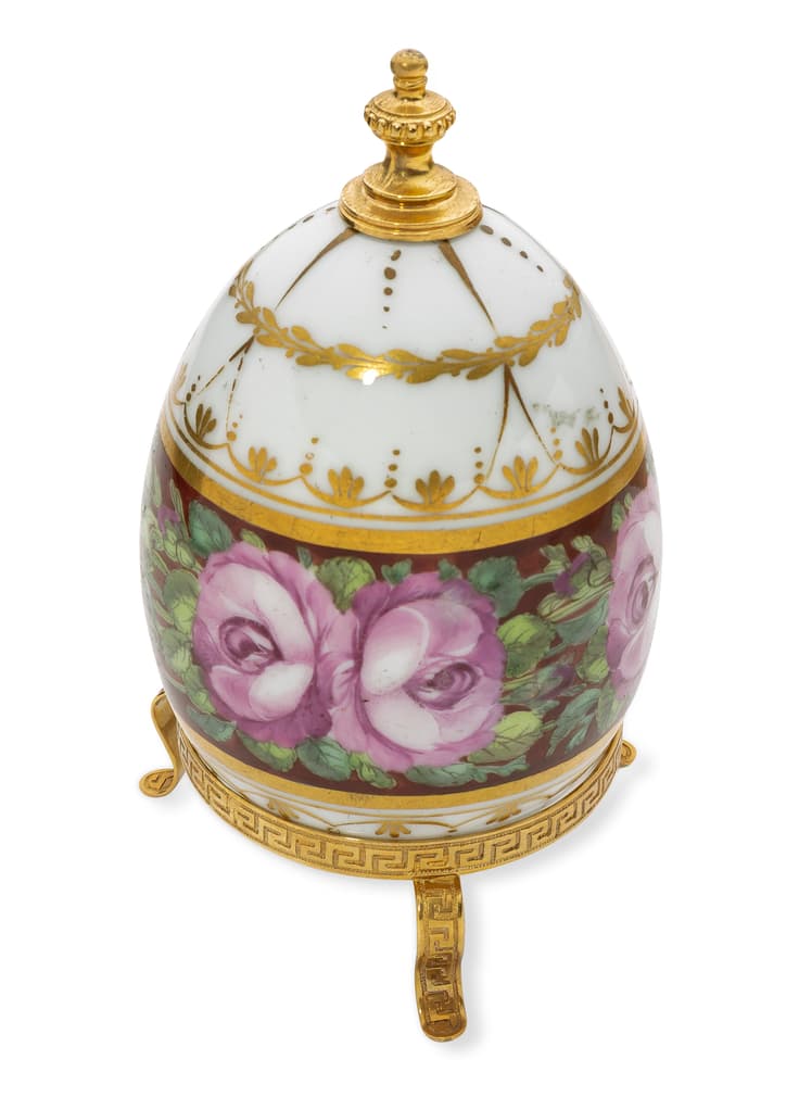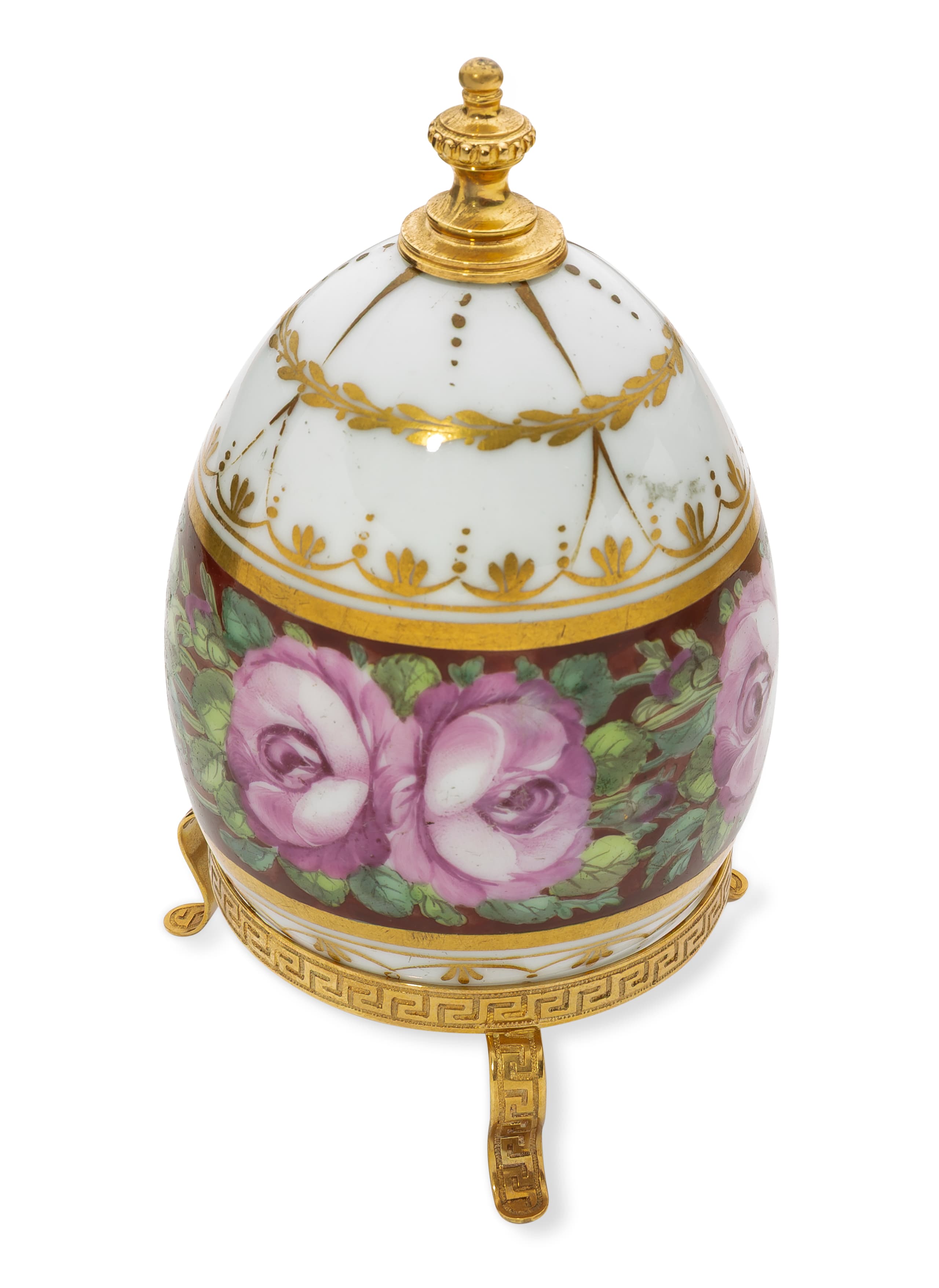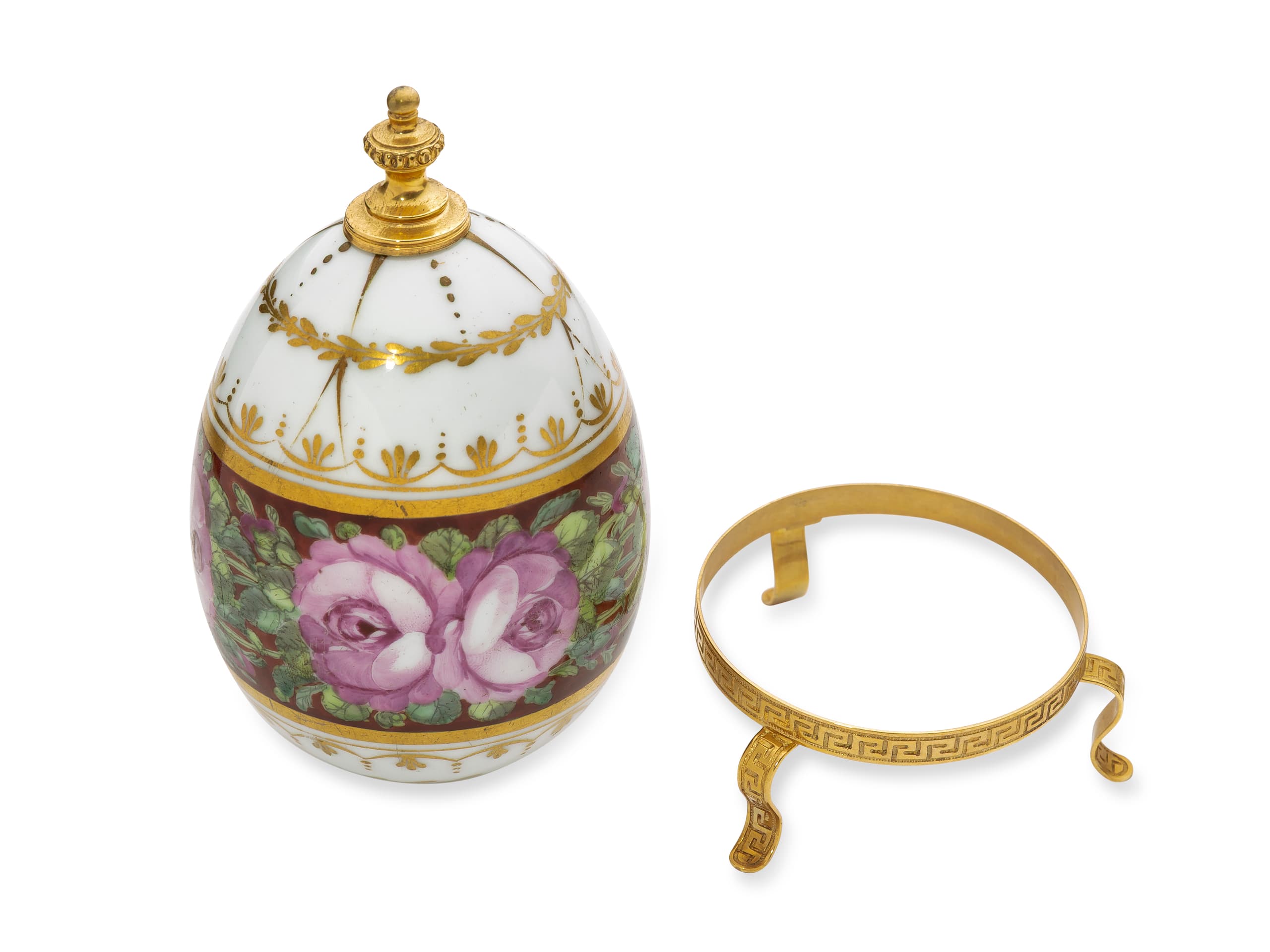 RUSSIAN PORCELAIN EASTER EGG IN MOUNTED GILT METAL STAND Private porcelain factory, late 19th century