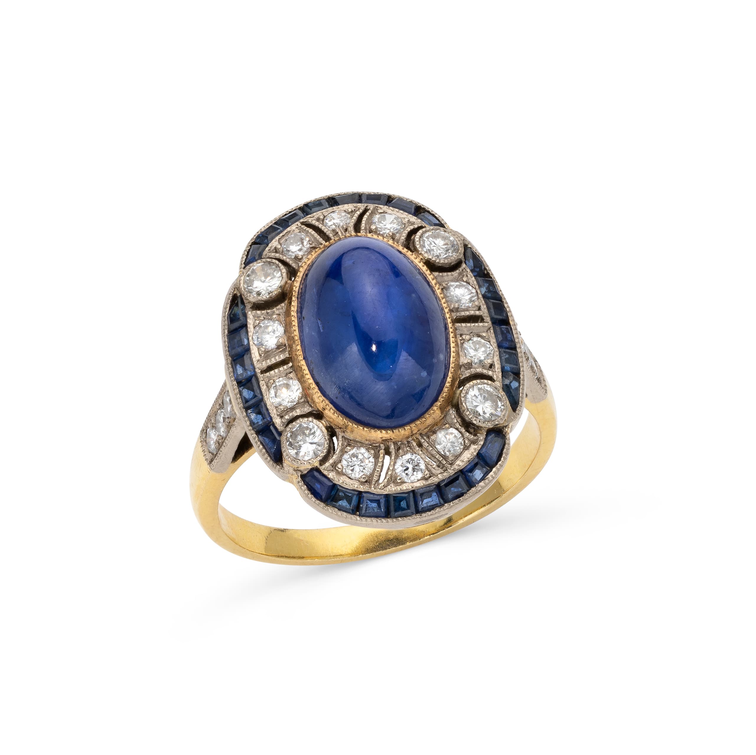 Art Deco style ring in 18k white and yellow gold set with a sapphire cabochon weighing approximately 2.20 ct. surrounded with brilliant-cut diamonds weighing approximately 0.50 ct. and framed with calibrated sapphires weighing approximately 0.30 ct. size 52 gross weight : 5.17 gr.