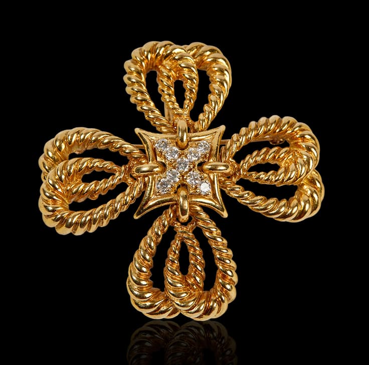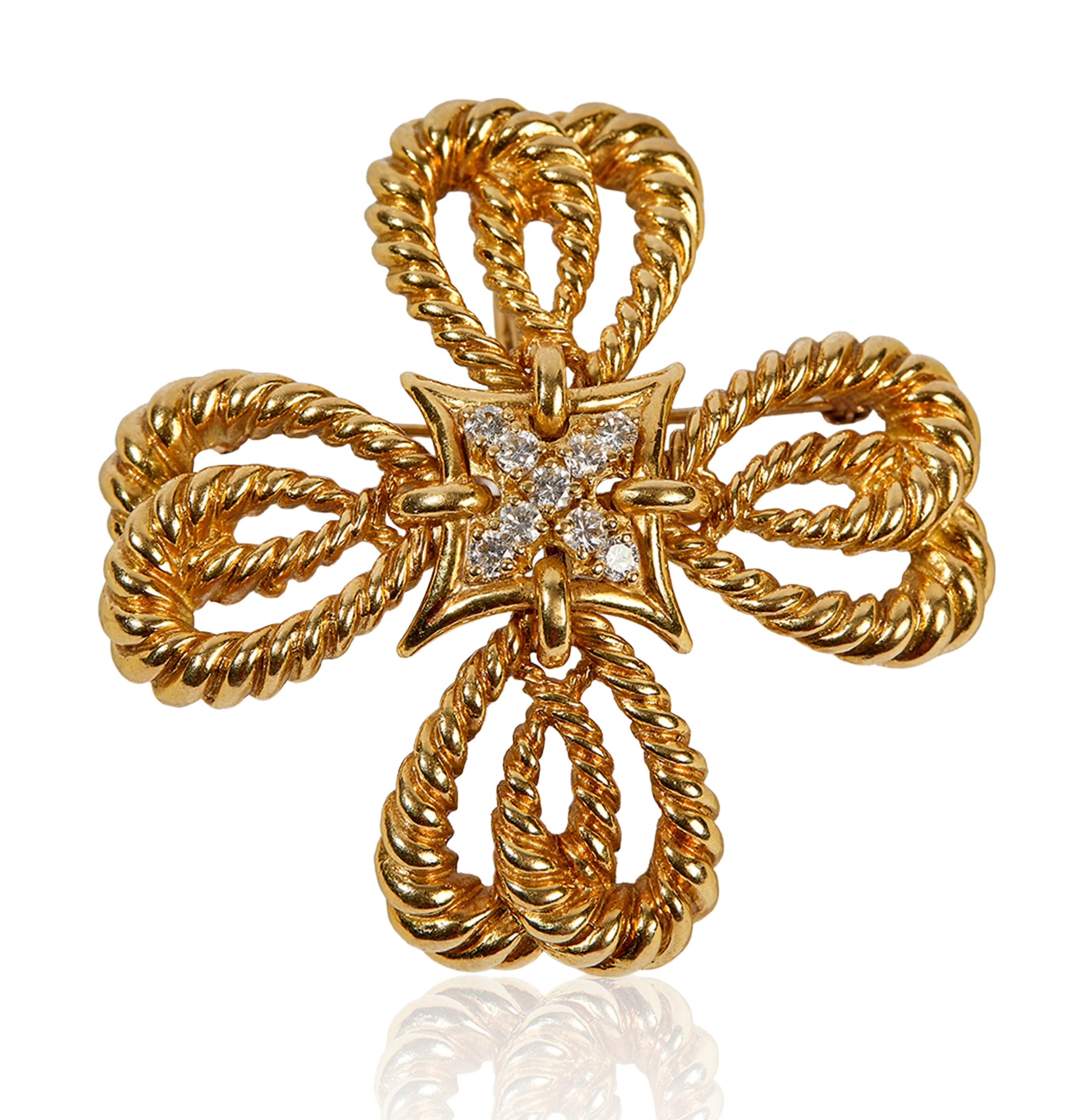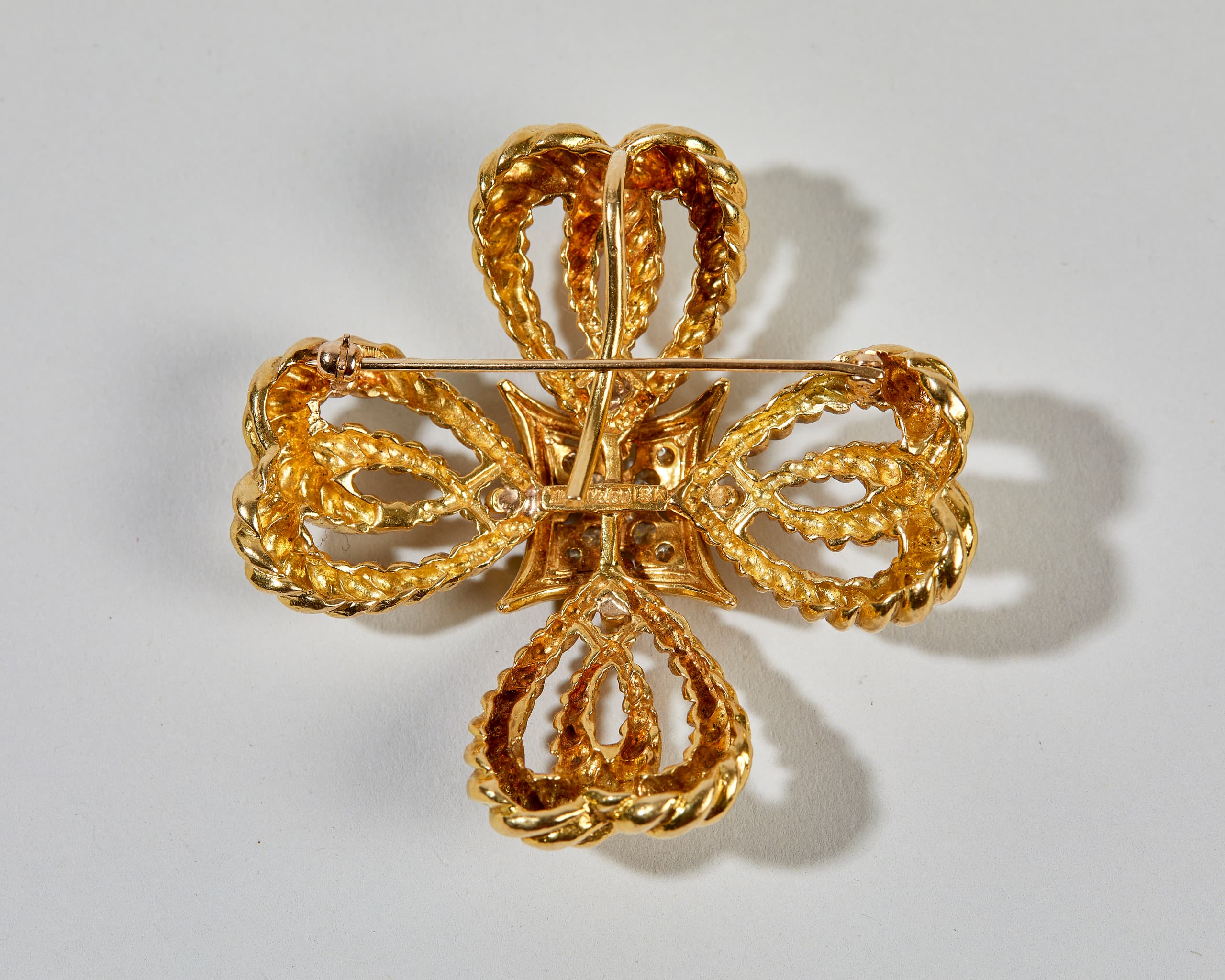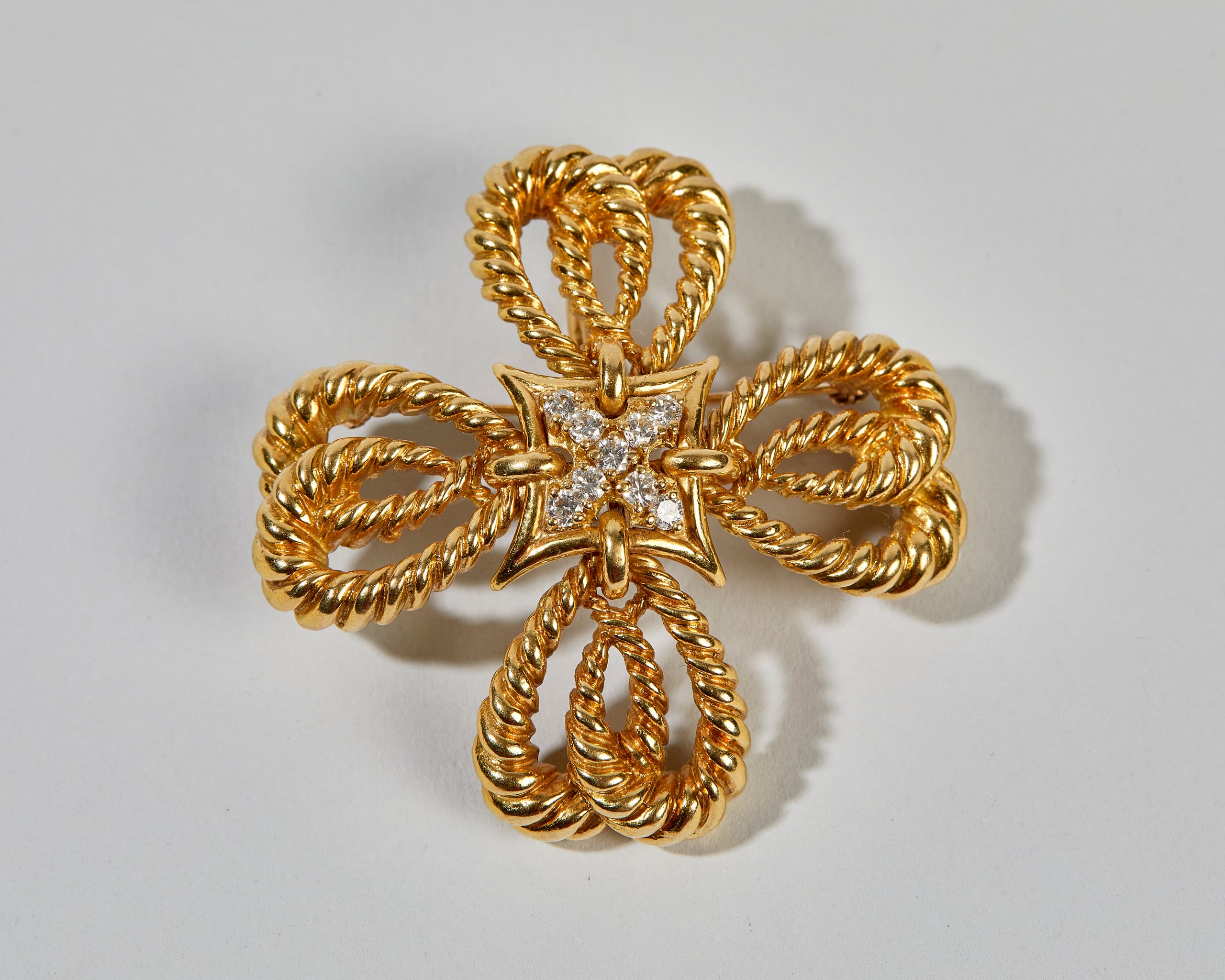 Tiffany & Co brooch ‘clover’ made in 18k yellow gold textured set with 9 brilliant-cut diamonds weighing approximately 0,8 ct.
