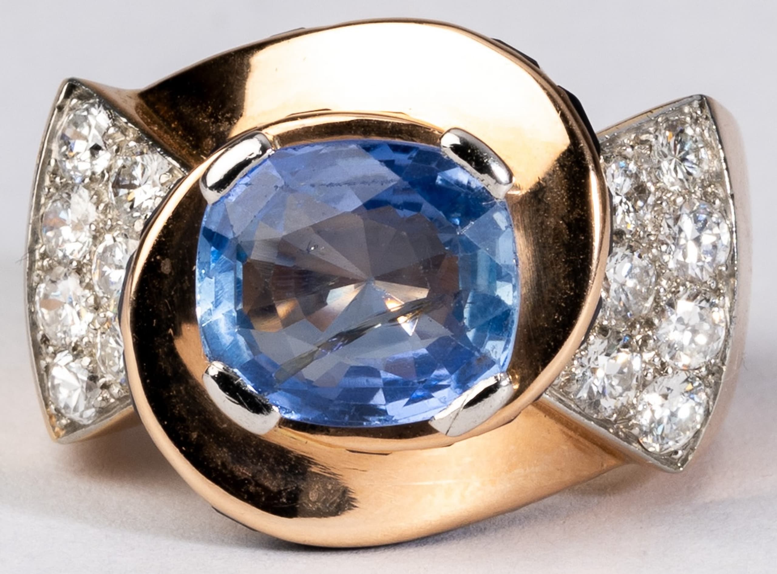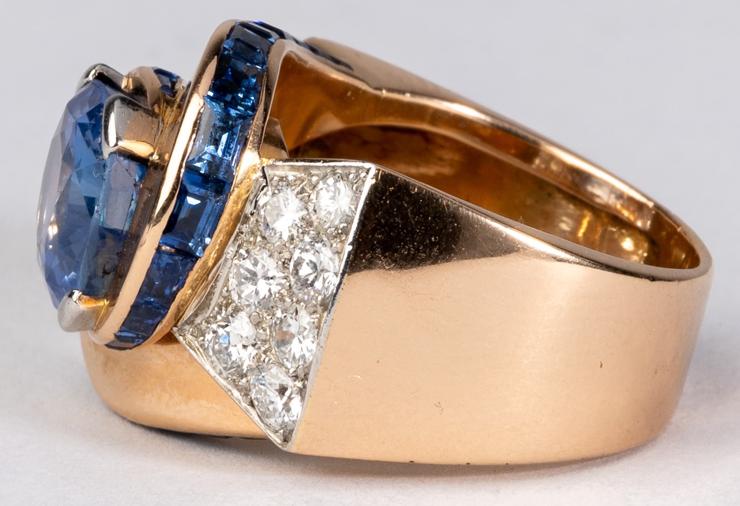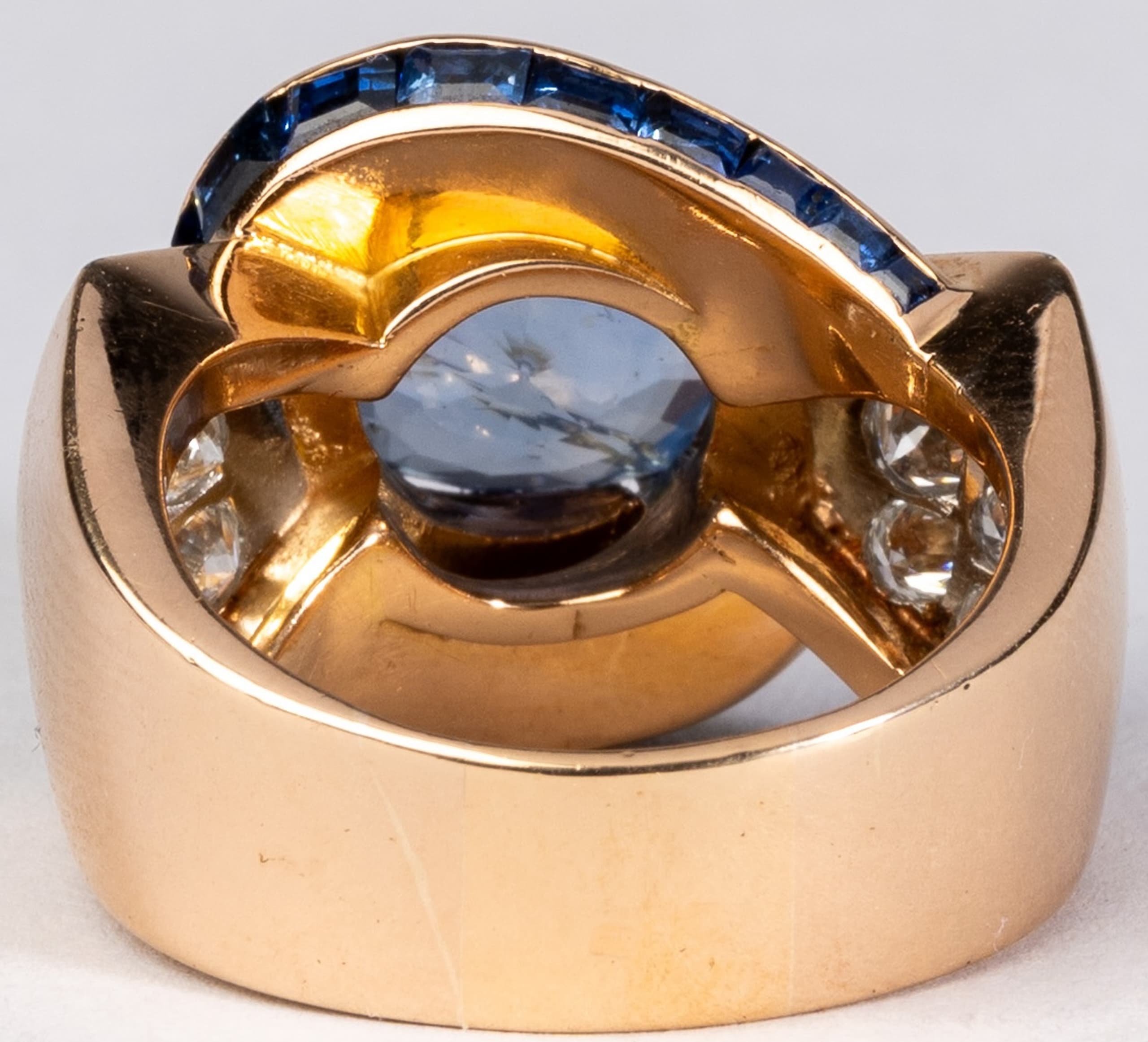 tank ring in 18k rose gold centered with a cushion-cut sapphire weighing approximately 6 ct. enhanced with brilliant-cut diamonds weighing approximately 2,7 ct. and calibrated sapphires weighing approximately 0,6 ct. Hallmarks : ‘750’ ‘owl’ size 60 circa 1950 gross weight : 17,8 grams.