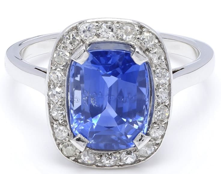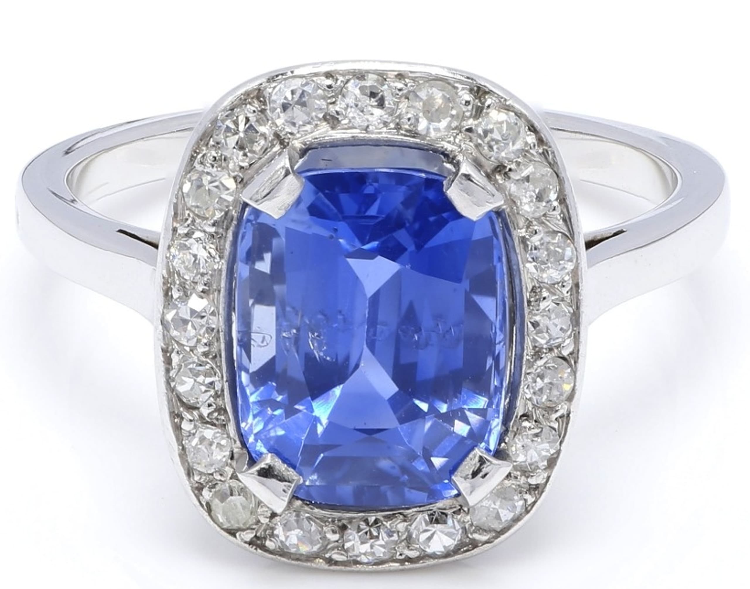 18K white gold ring set with antique cushion, brilliant/step cut Kashmir sapphire weighing 4.1 ct. framed with old-cut diamonds weighing approximately 0.60 ct.