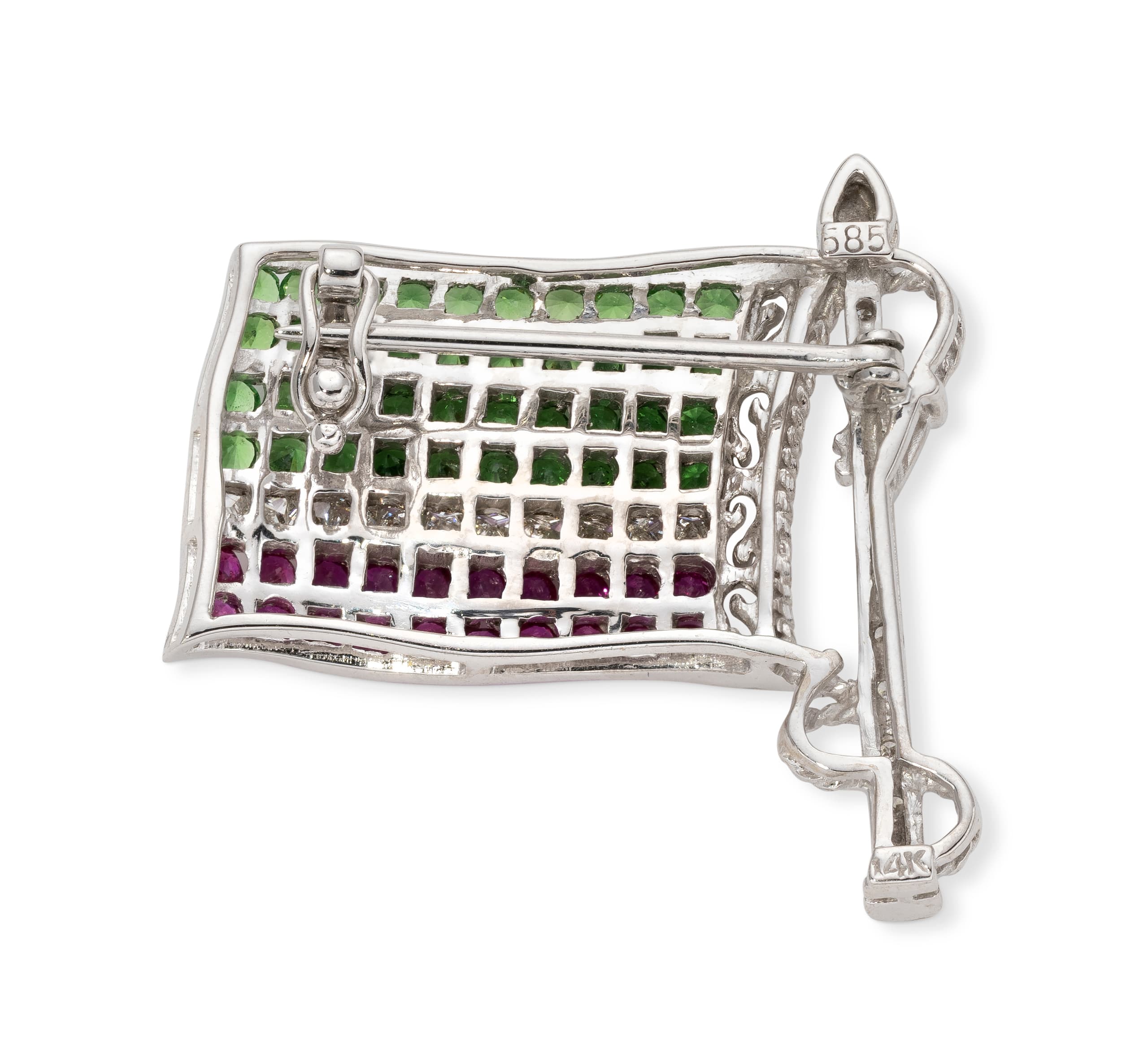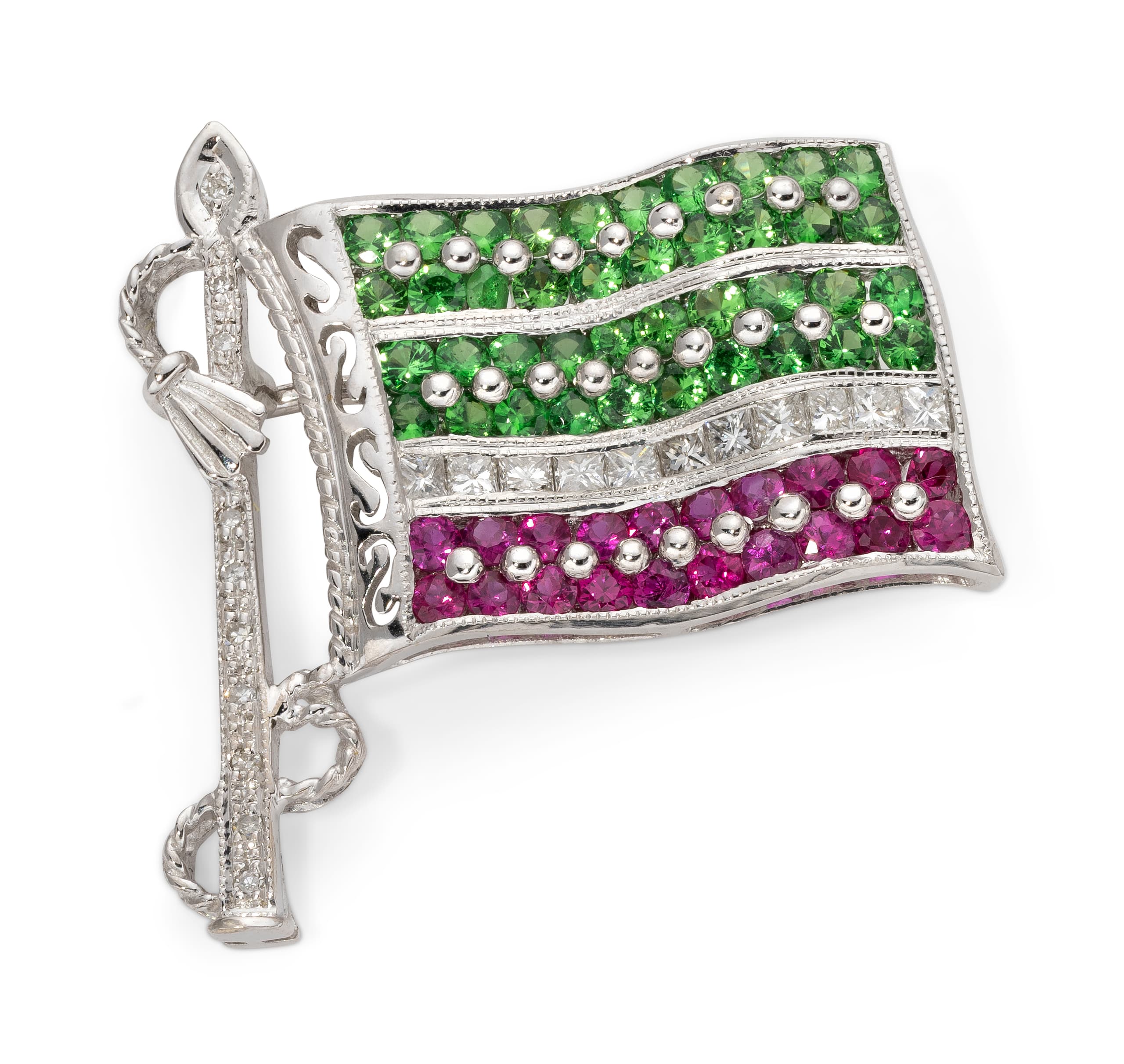 brooch in 18k white gold depicting the tchetchene flag with stripes set with brilliant-cut diamonds weighing approximately 0,30 ct., rubies weighing approximately 0,35 ct. and emeralds weighing approximately 0,70 ct.