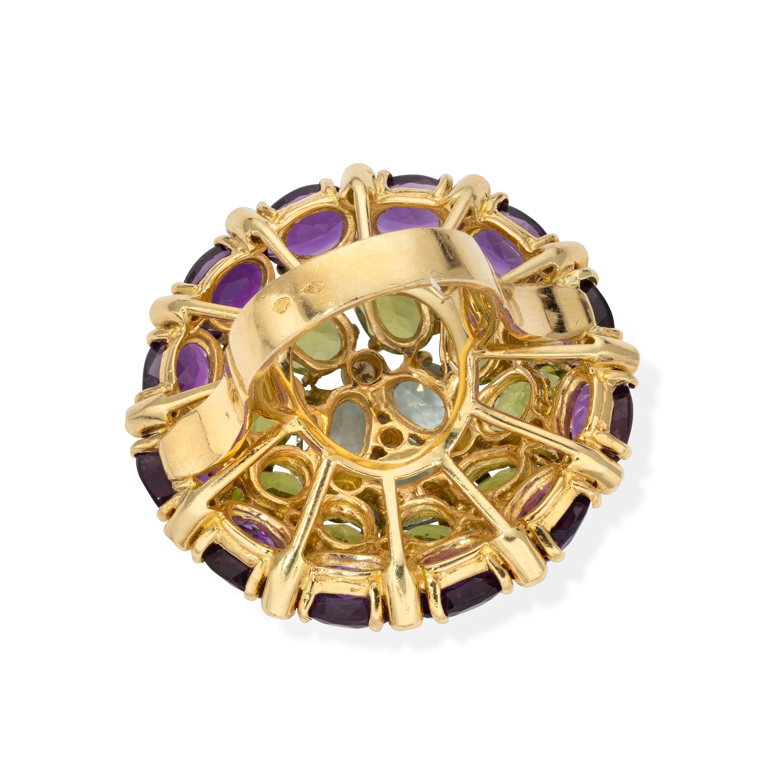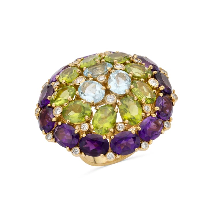 cocktail ring in 18k yellow gold set with amethyst weighing approximately 9 ct., peridots weighing approximately 9 ct., aquamarines weighing approximately 2,20 ct. and ponctuated with brilliant-cut diamonds weighing approximately 0,80 ct.