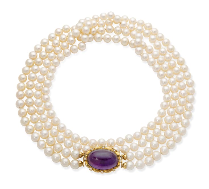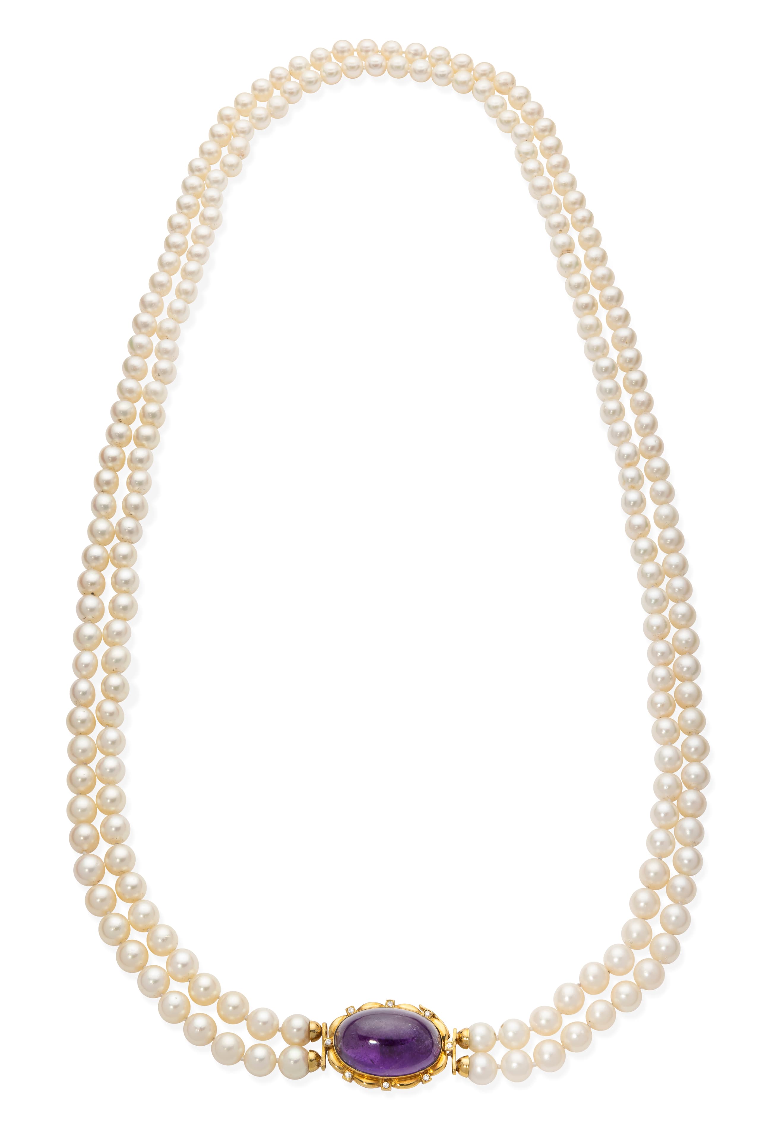 18K yellow gold necklace composed of two strands of pearls measuring approximately 0.9 to 1 cm and a pendant set with a cabochon amethyst weighing approximately 25 cts. ponctuated with brilliant-cut diamonds Hallmark ‘750’ L. approximately 49 cm gross weight: approximately 218 gr.