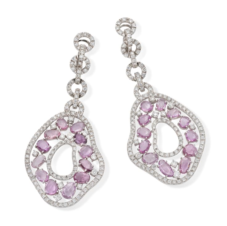 pair of pendant earrings made in 18k white gold set with pink sapphire weighing approximately 16 ct. and brilliant-cut diamonds weighing approximately 6 ct. Hallmarks : ‘750’ L. approximately 8 cm gross weight : 28.37 gr.