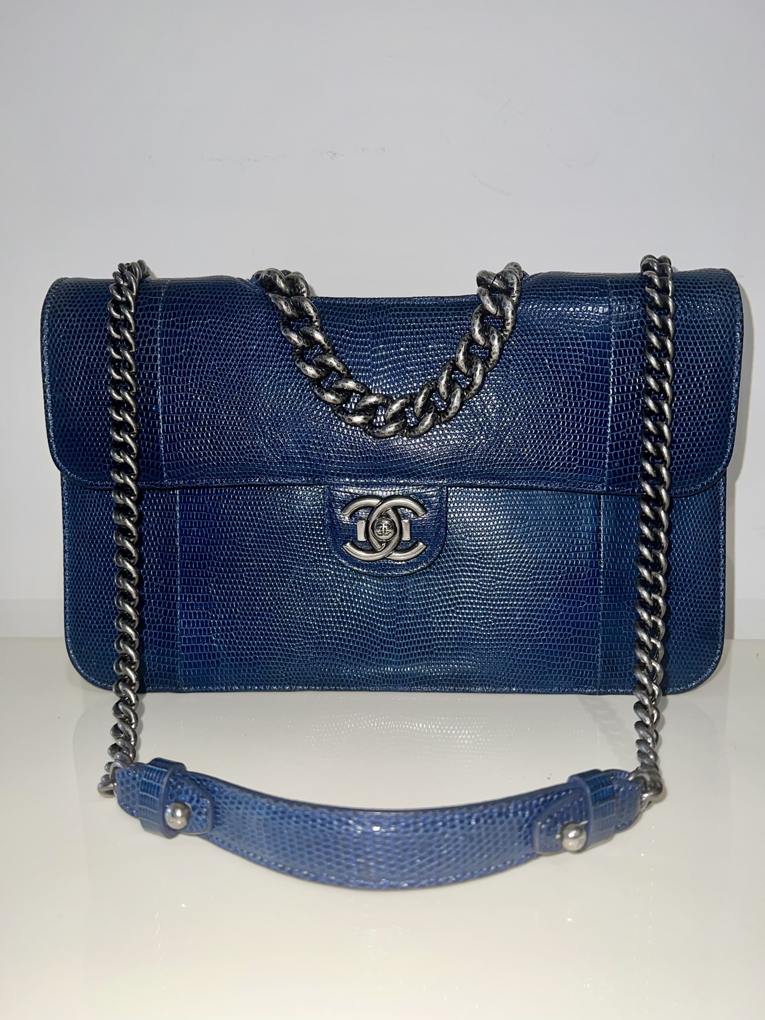 this magnificent flap bag features luxurious lizard and lambskin blue leather, ruthenium chain handle, a shoulder strap that includes a leather shoulder pad for comfort and a ruthenium CC press lock. The flap opens to a royal blue leather interior with two compartments