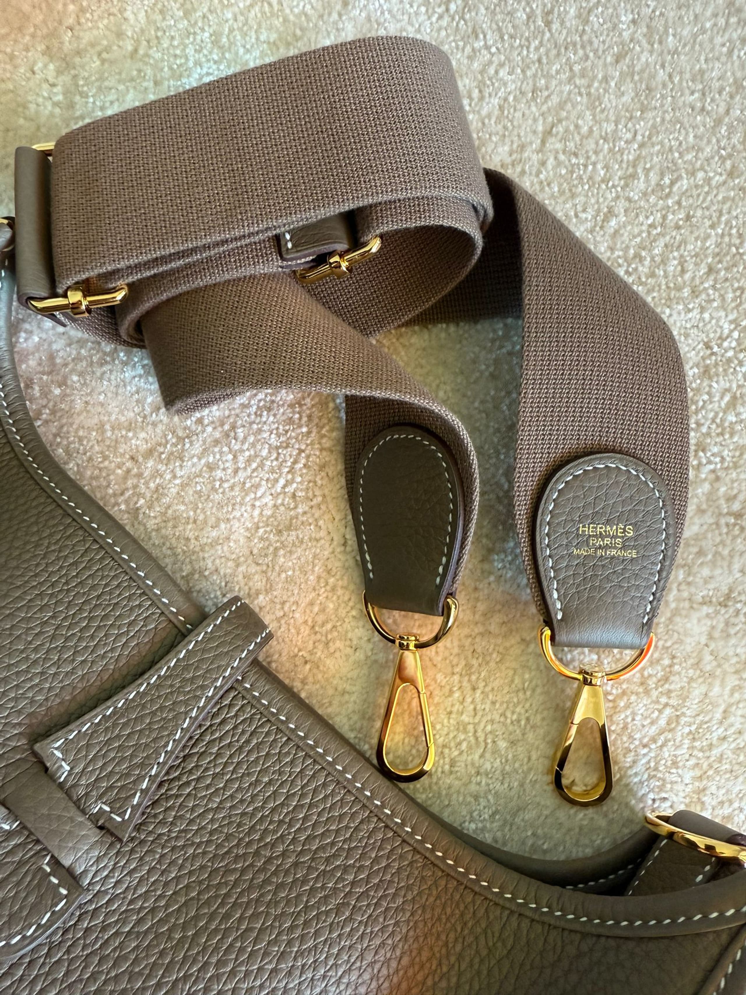 Hermès ‘Evelyne 29’ étoupe taurillon clémence leather bag with gold hardware, adjustable canvas strap, H perforation logo, snap tab closure with its box and dust bag