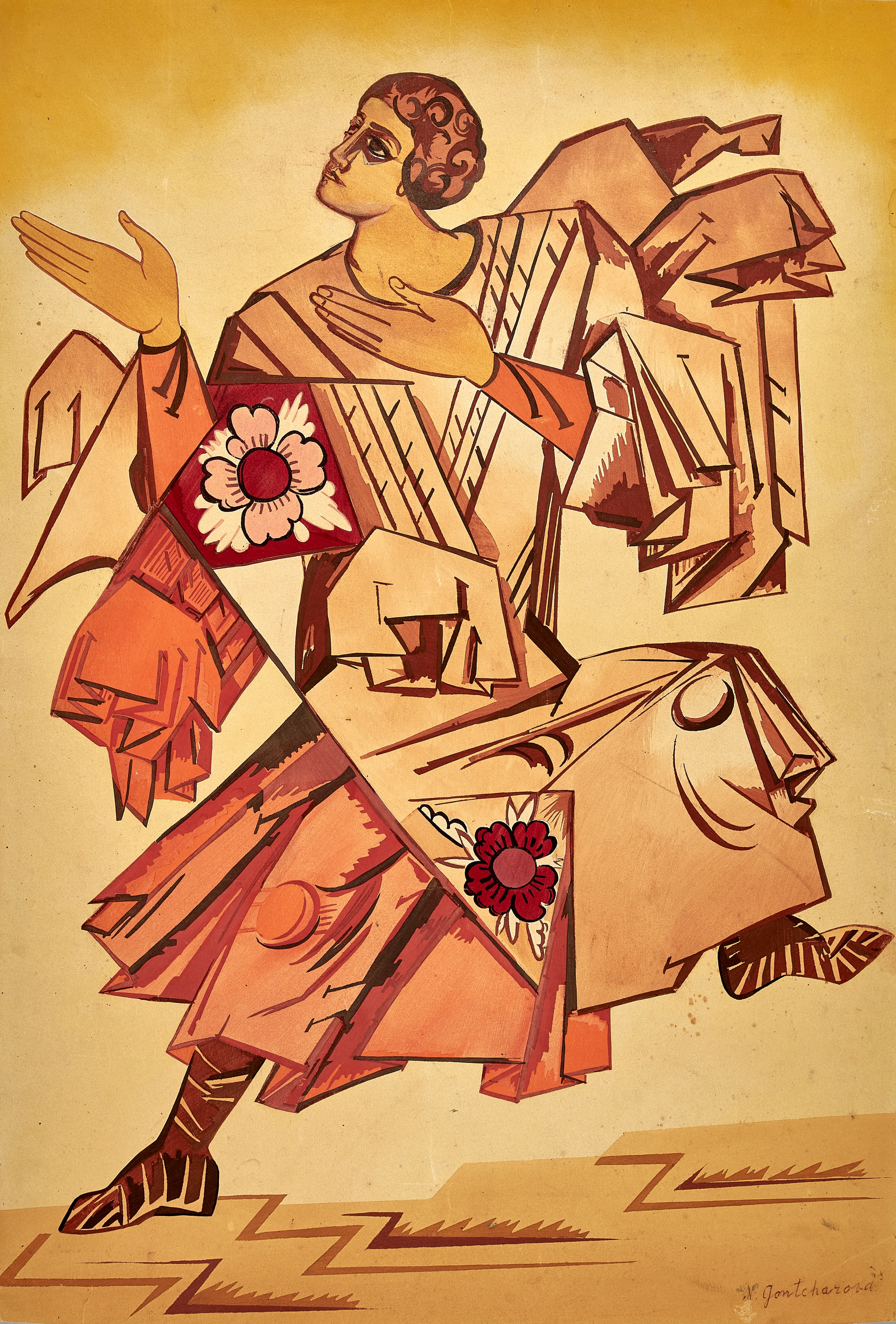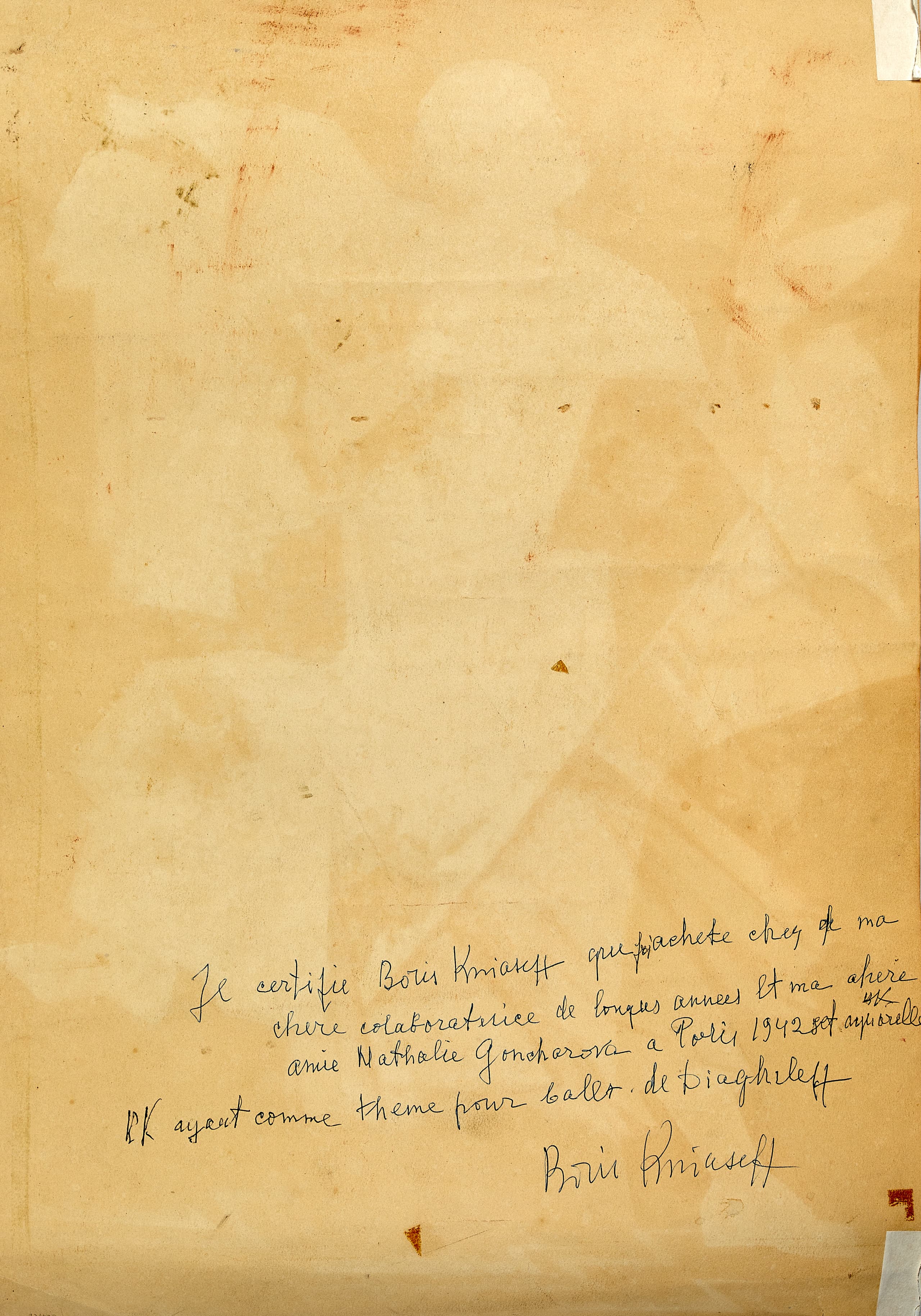 signed ‘N. Gontcharova’ (lower right); inscribed in pen: ‘I certify Boris Kniaseff that I bought from my long-time collaborator and dear friend Nathalie Goncharova in Paris in 1942 this watercolour with the theme of the ballet by Diaghileff/ Boris Kniaseff’ (on the reverse)