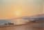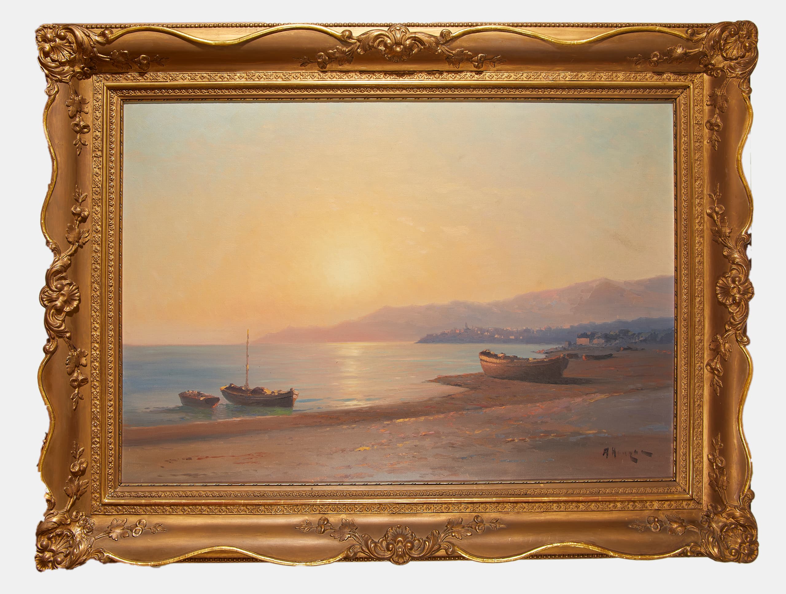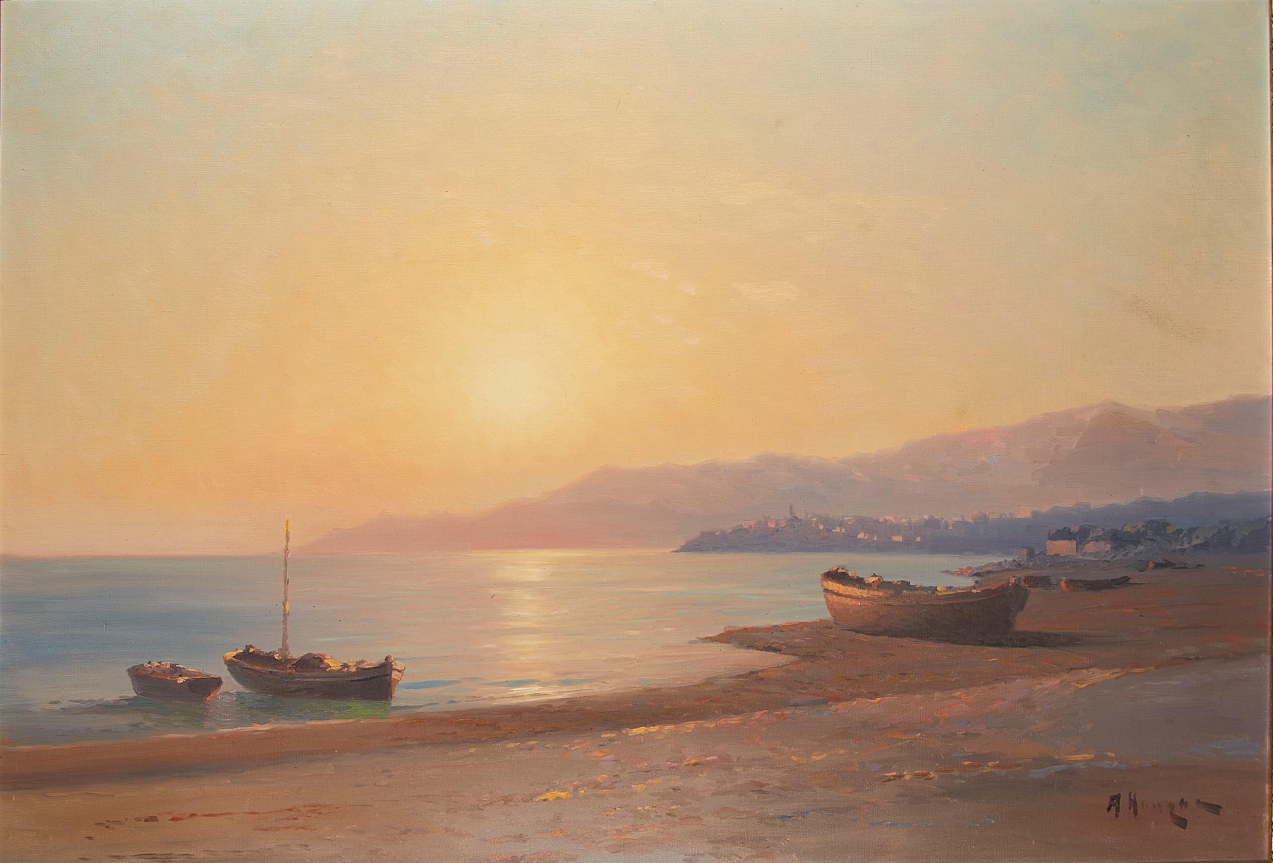 The painting captures a magic time where land meets water. Unlike grand naval compositions or deep-ocean panoramas, these more intimate works highlight everyday coastal life: the glimmering light at sunrise or dusk, weathered fishing boats pulled up on the sands, villages tucked into cliffsides, and waves gently curling along pebble beaches. The Black Sea coastline of his childhood often served as inspiration, and his meticulous observation of its light and colour gives them a gentle realism that never feels cold.