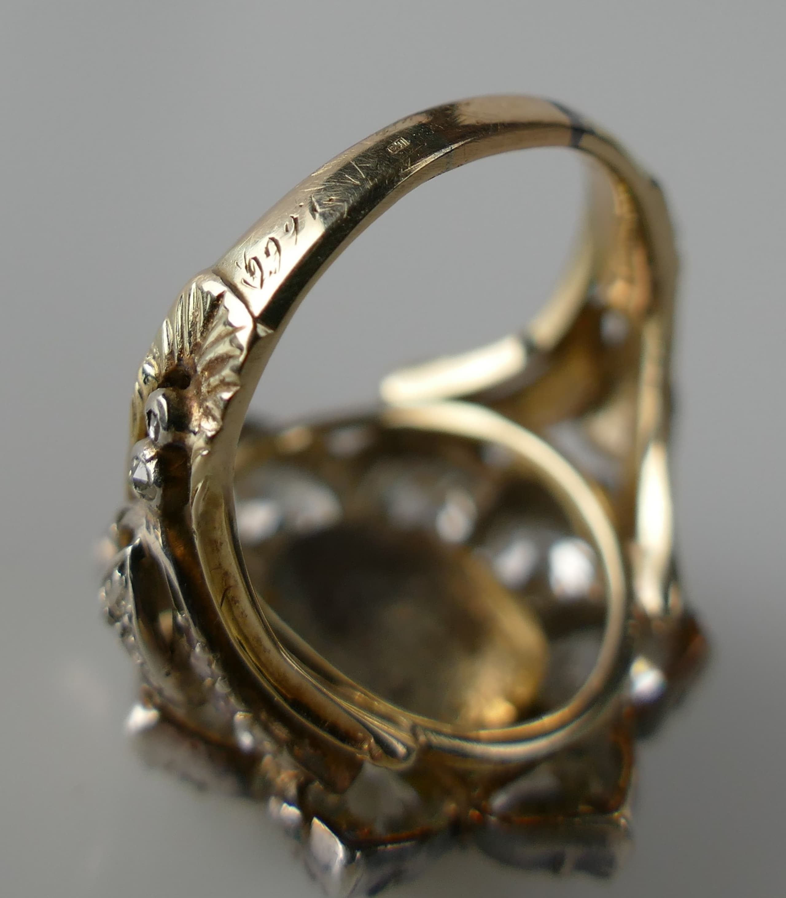The setting is of great finesse, the gold part is finely chased and the silver and diamonds particularly well worked