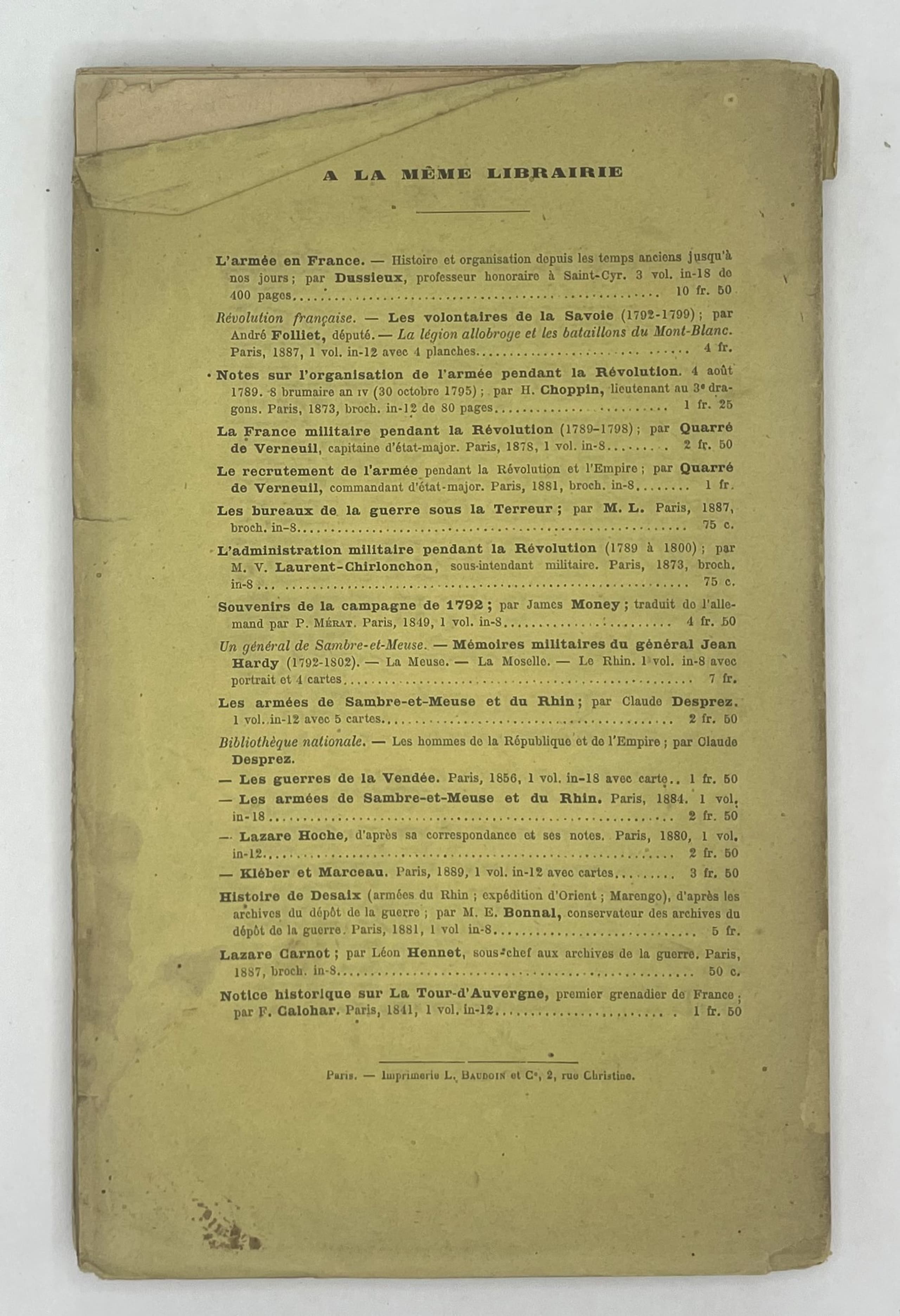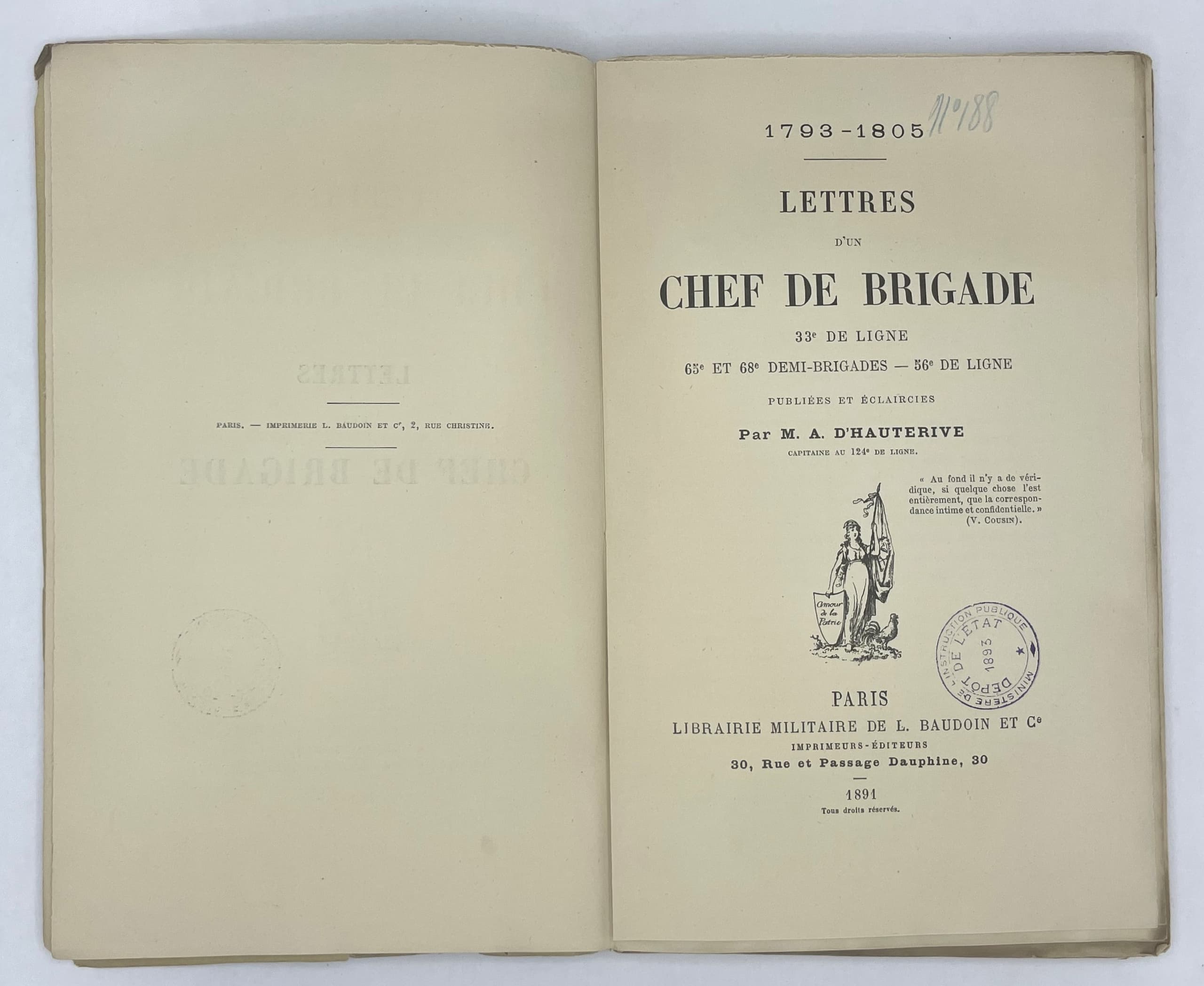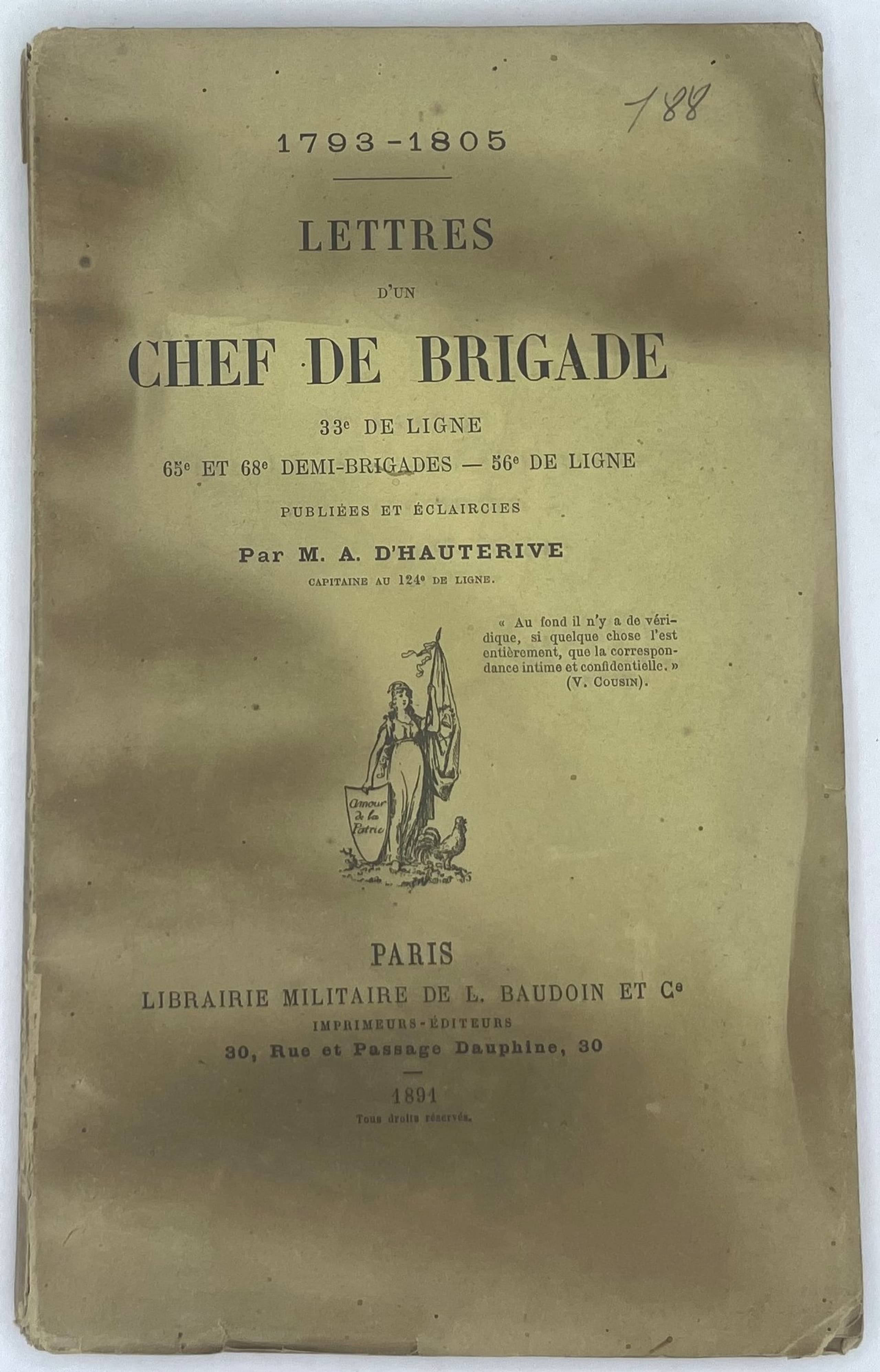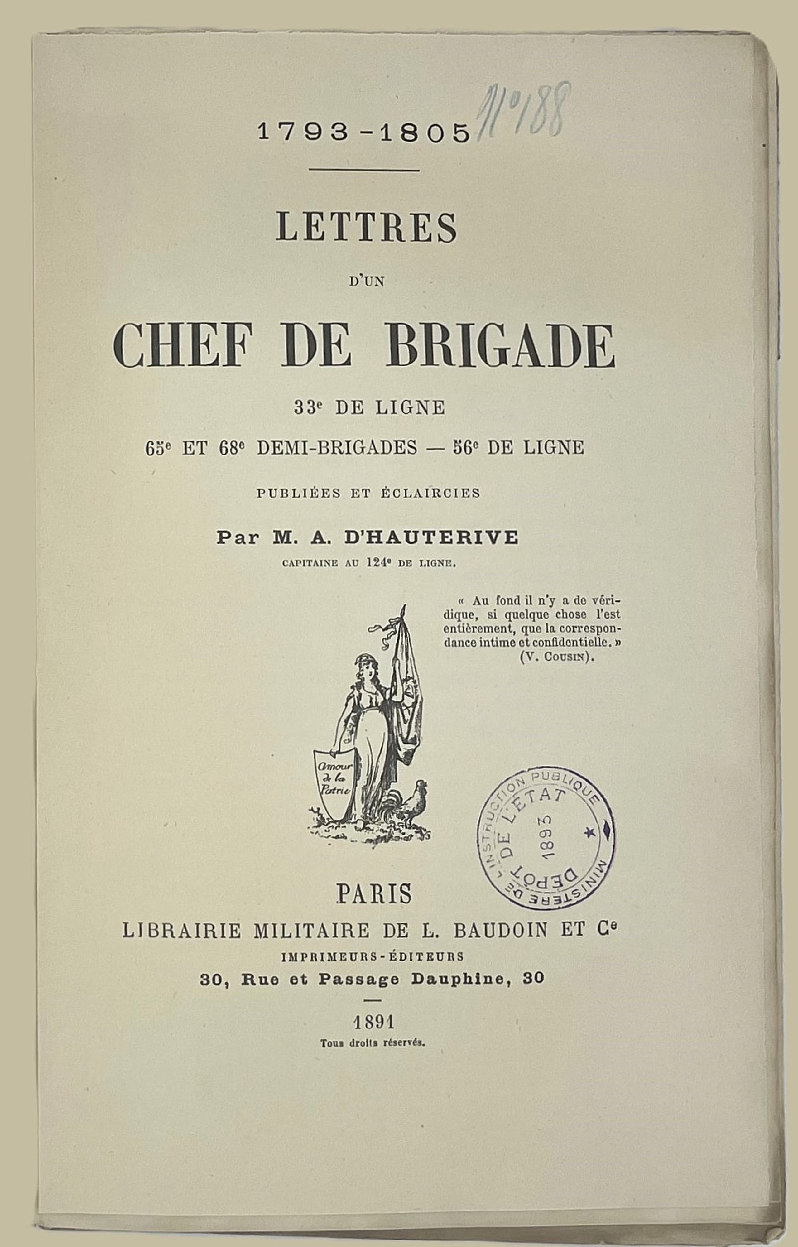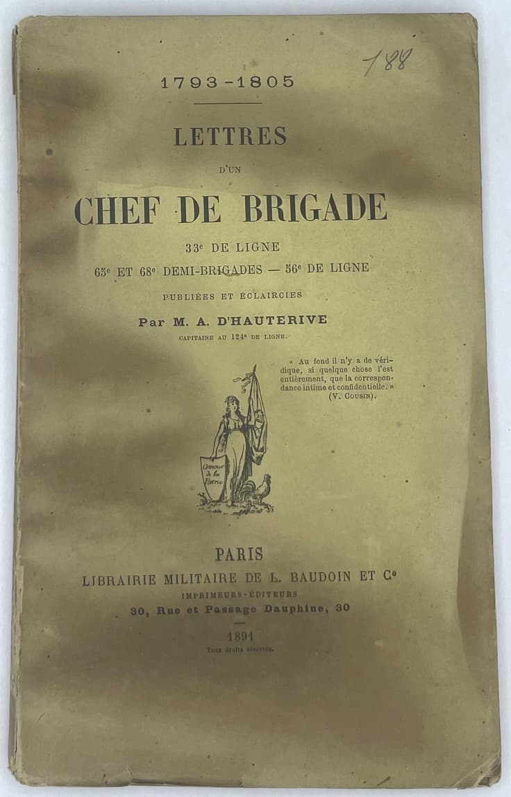 ALEXANDRE BOUTROUË (1760-1805) 1793-1805. LETTRES D’UN CHEF DE BRIGADE, 33e DE LIGNE, 65e ET 68e DEMI-BRIGADES - 56° DE LIGNE, PUBLIÉES ET ÉCLAIRCIES PAR M. A. D’HAUTERIVE, CAPITAINE AU 124e DE LIGNE. [LETTERS FROM A BRIGADE LEADER, 33rd LINE, 65th AND 68th HALF-BRIGADE - 56th LINE, PUBLISHED AND LETTERED BY M. A. D’HAUTERIVE, CAPTAIN OF THE 124th LINE] ORIGINAL EDITION. 1891. 1 VOLUME. IN FRENCH. Paris, Librairie Militaire de L.Baudoin et Cie, Imprimeurs-Éditeurs, 1891.