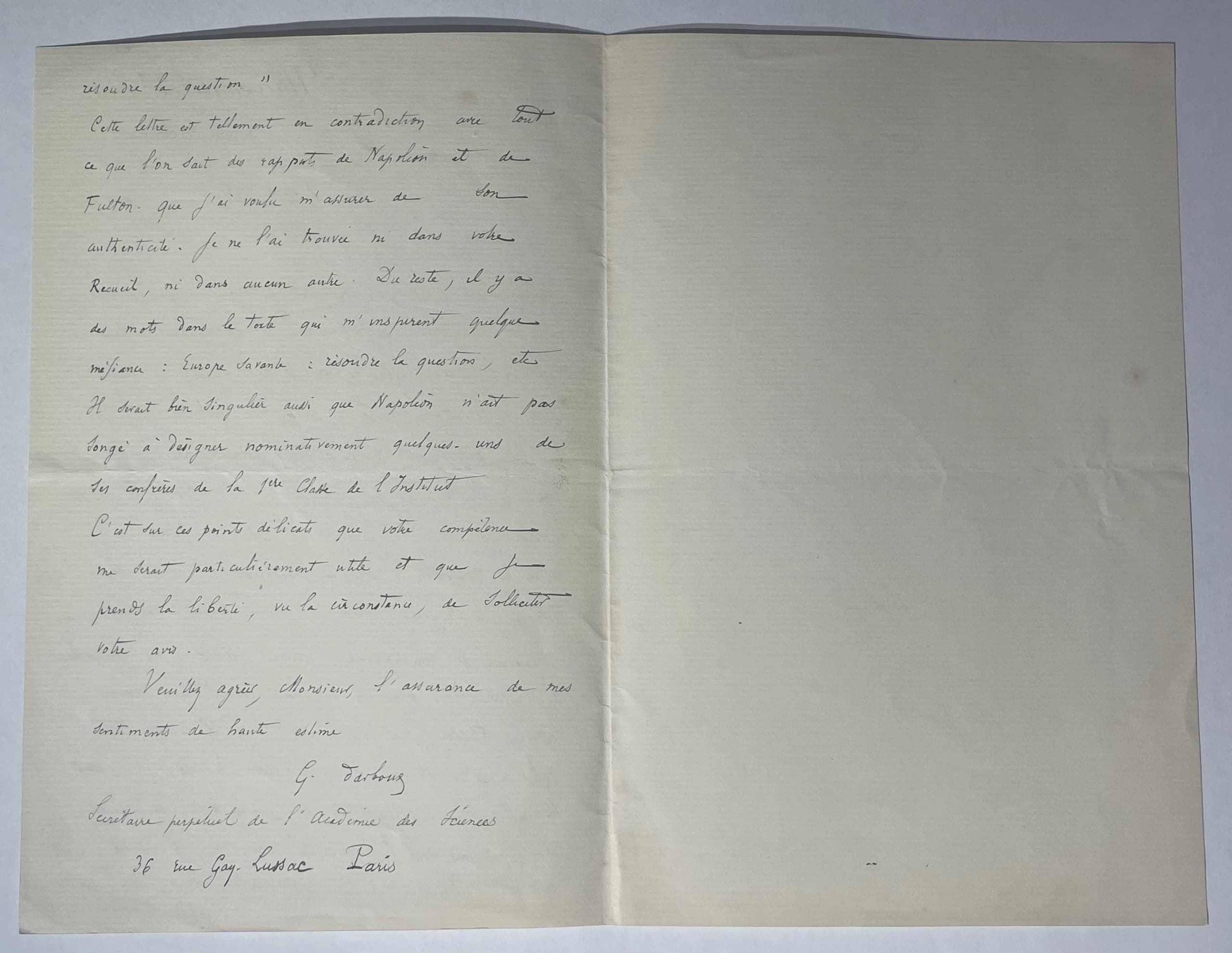 On the advice of Mr de la Roncière, he consulted him, as a specialist in Napoleon’s correspondence, on a letter from the latter to Mr de Champagny dated Bologna on 21 July 1804, which reads as follows: ‘...I have just read the proposal by citizen Fulton which you sent me much too late in that it could change the face of the world. You will immediately entrust it to a committee of members chosen by you from the different classes of the Institute. It is there that learned Europe must seek judges to resolve the question’. This letter was so at odds with what we know of the relationship between Napoleon and Robert Fulton that he wanted to be sure of its authenticity. He was suspicious of some of the words: ‘Europe savante’ (learned Europe), ‘résoudre la question’ (resolve the question)... - His expertise would be very useful to him as he was to represent France at the Fulton Centenary in New York.
