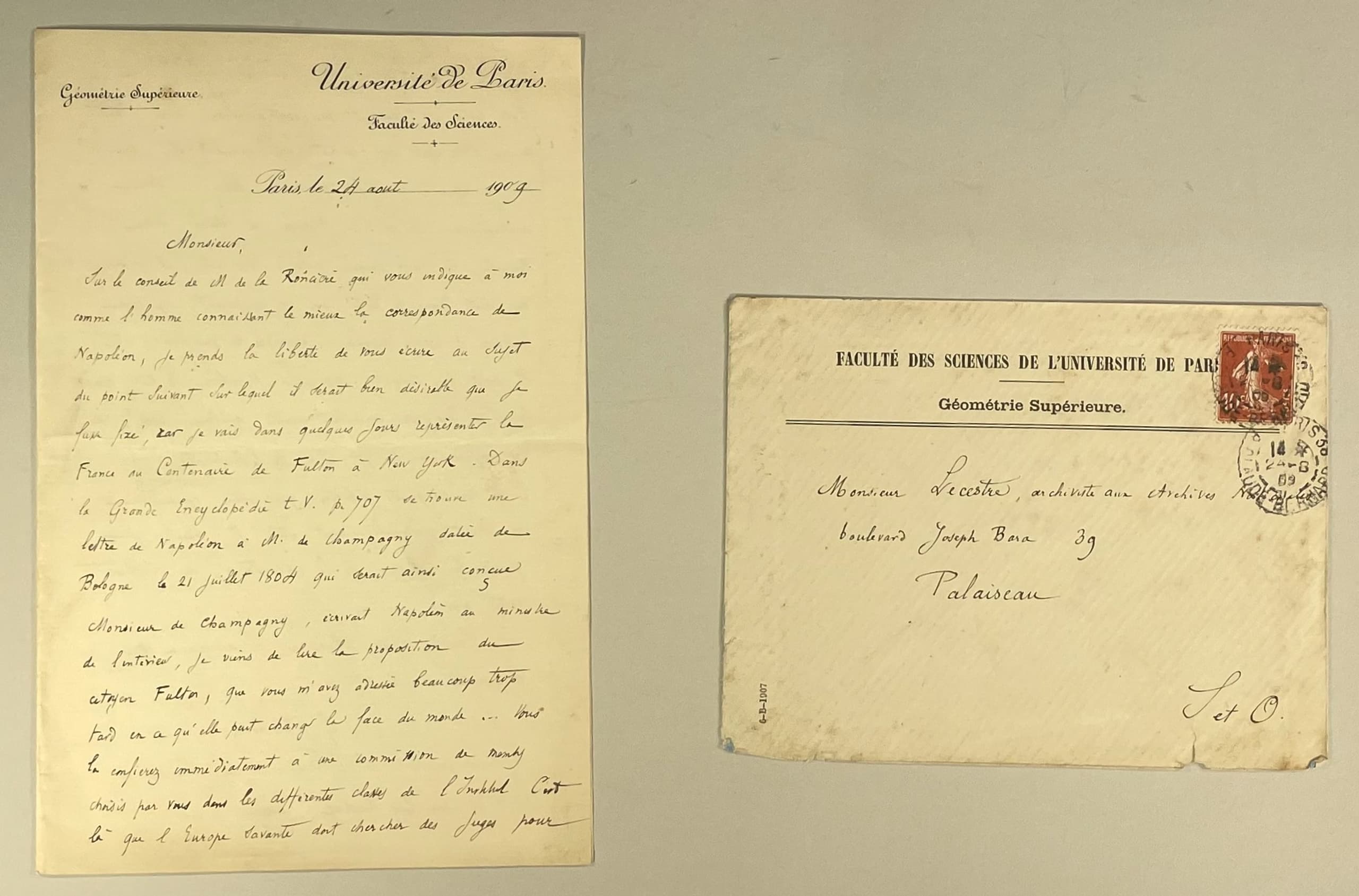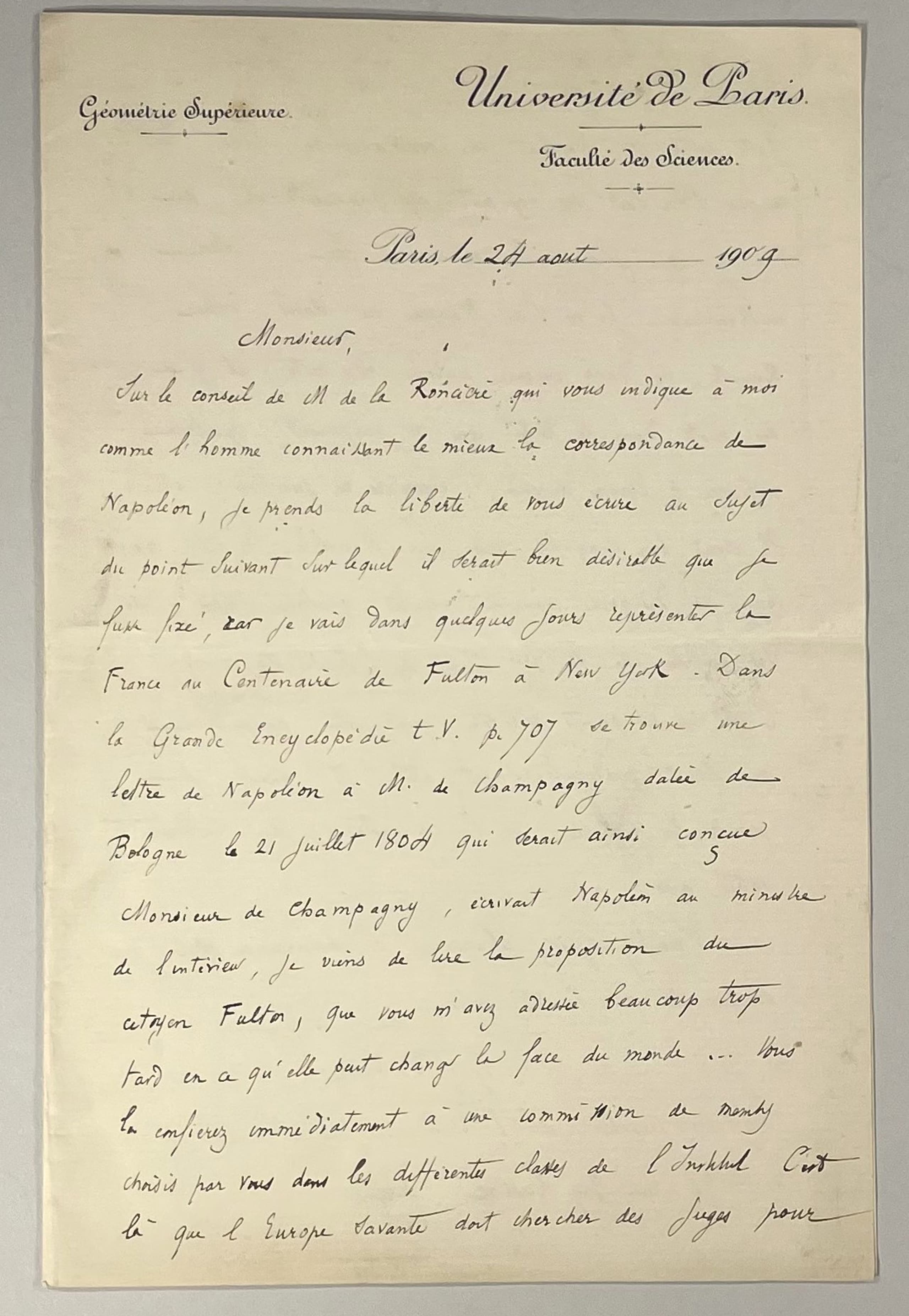 GASTON DARBOUX (1842-1917) Autograph letter signed to Monsieur Lecestre, archivist. Paris 24 August 1909.