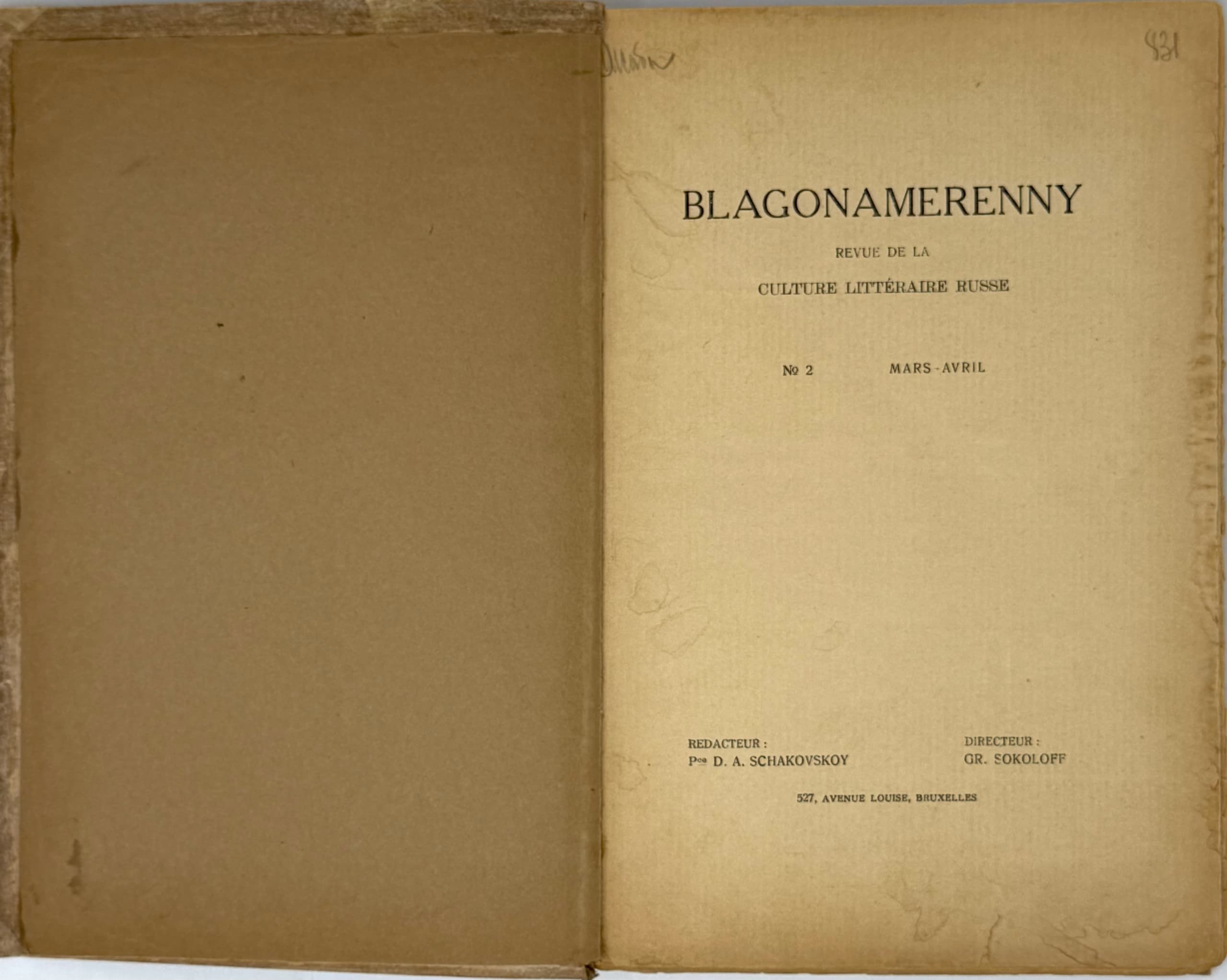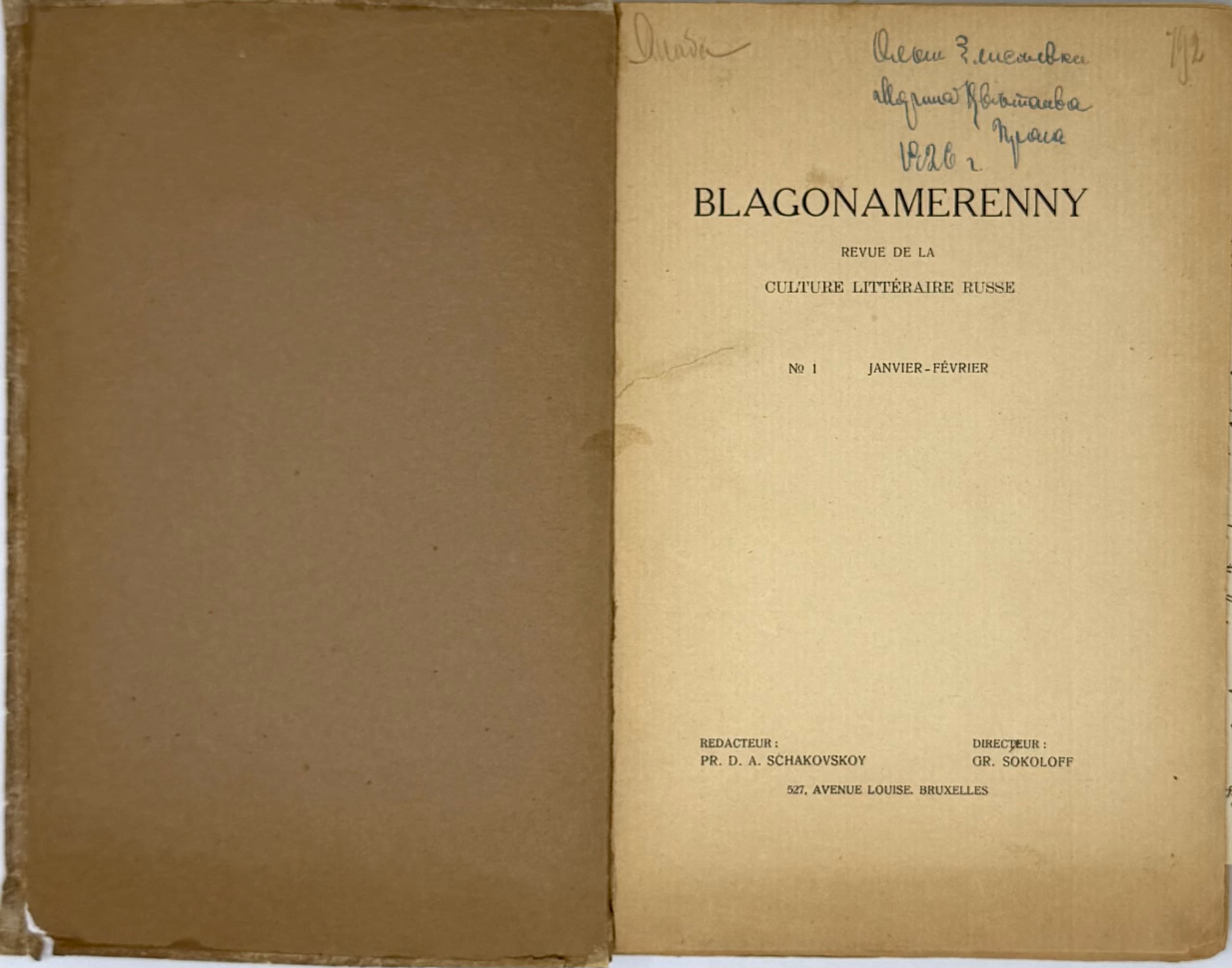 In book 1, after the title page, there is a handwritten letter from the publisher of the magazine, D.A. Shakhovskoy, addressed to V.B. Sosinsky. Brussels, September 9, 1925.