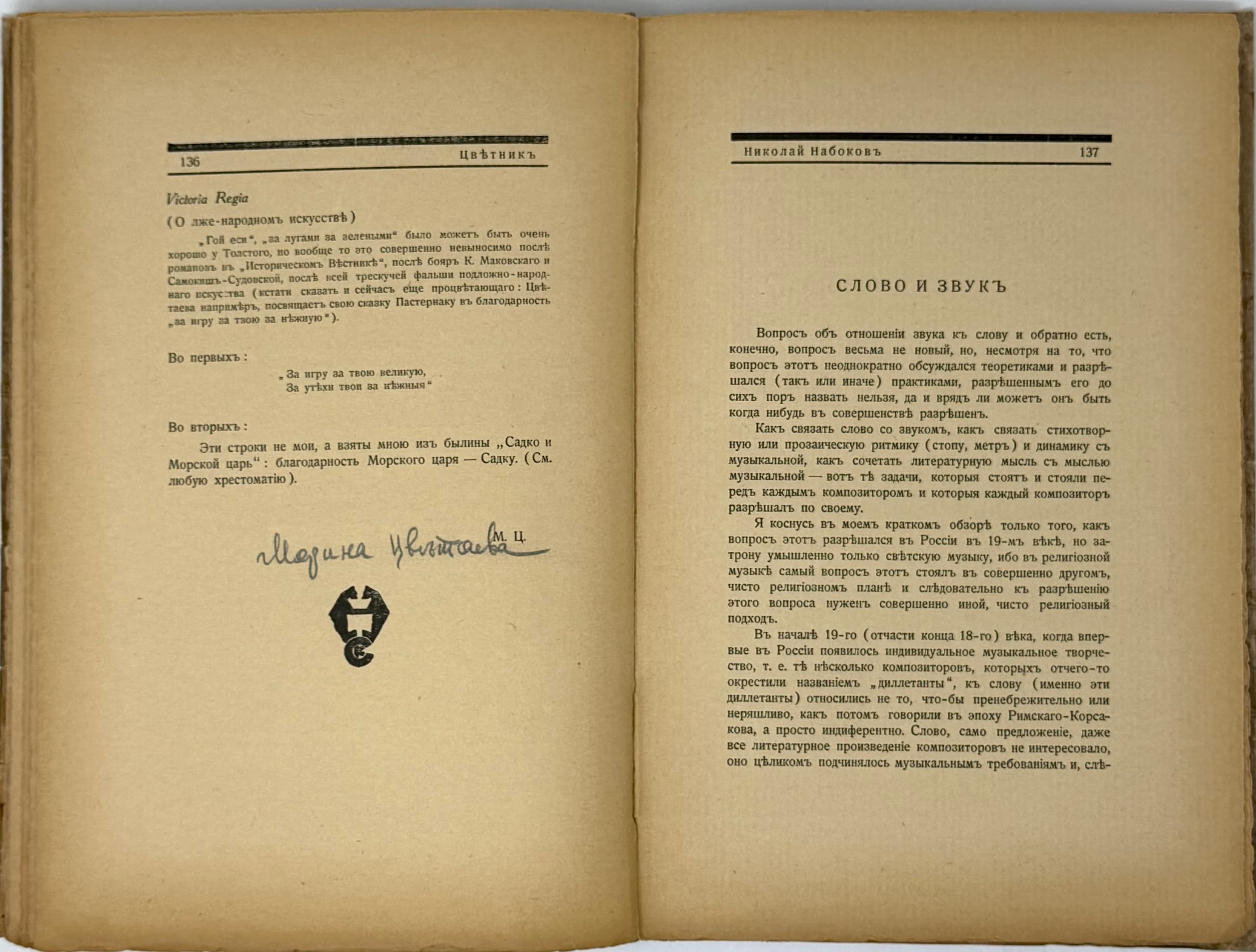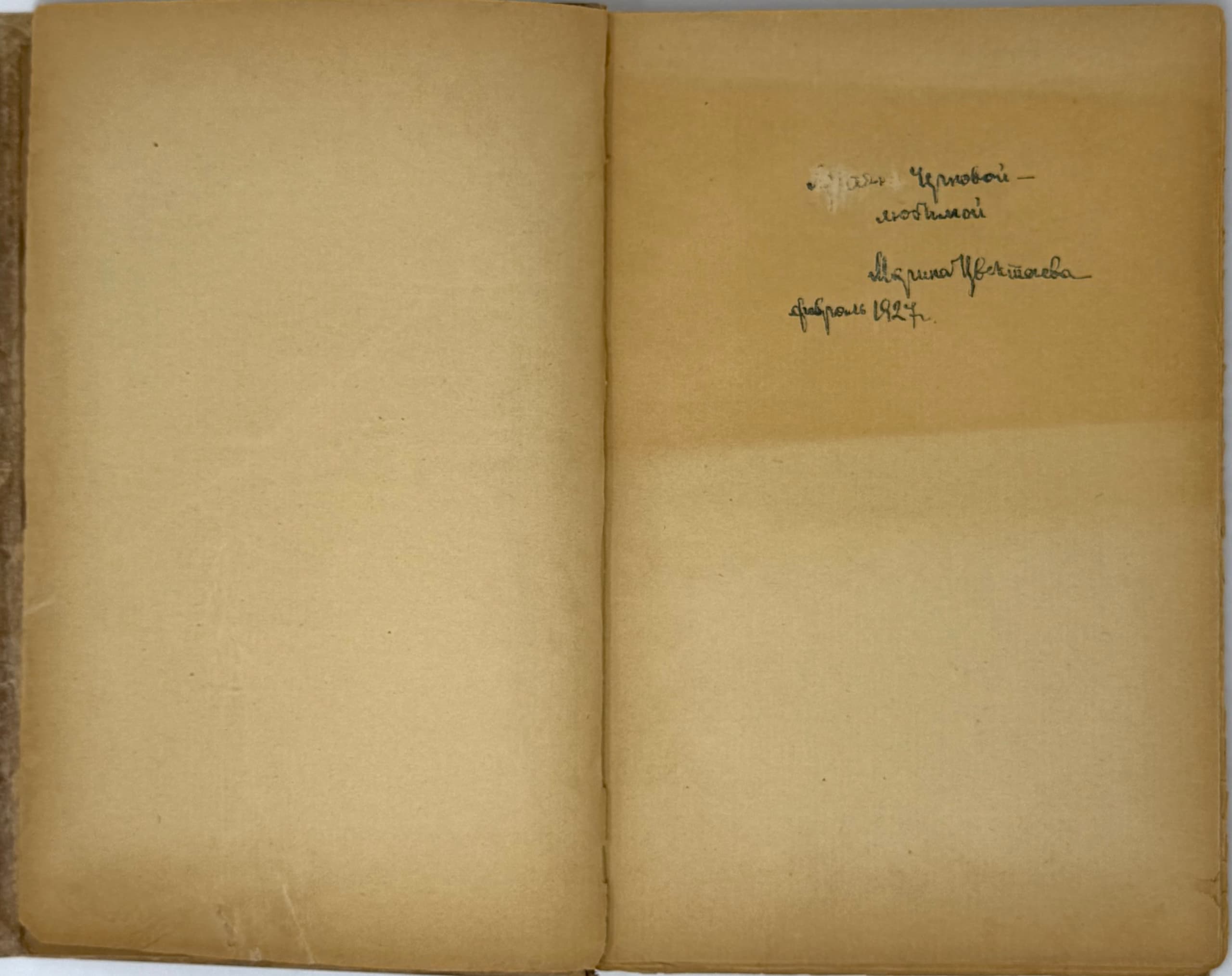 On the first blank page of book 2: ‘Ariadne Chernovoi – liubimoi Marina Tsvetaeva fevral’ 1926’ [‘To Ariadna Chernova — with love, Marina Tsvetaeva, February 1926’]; The name has been erased. There are several marks in the text; on p. 136, above the printed initials in Cyrillic “M.Ts.,” there is an inscription reading “Marina Tsvetaeva.”