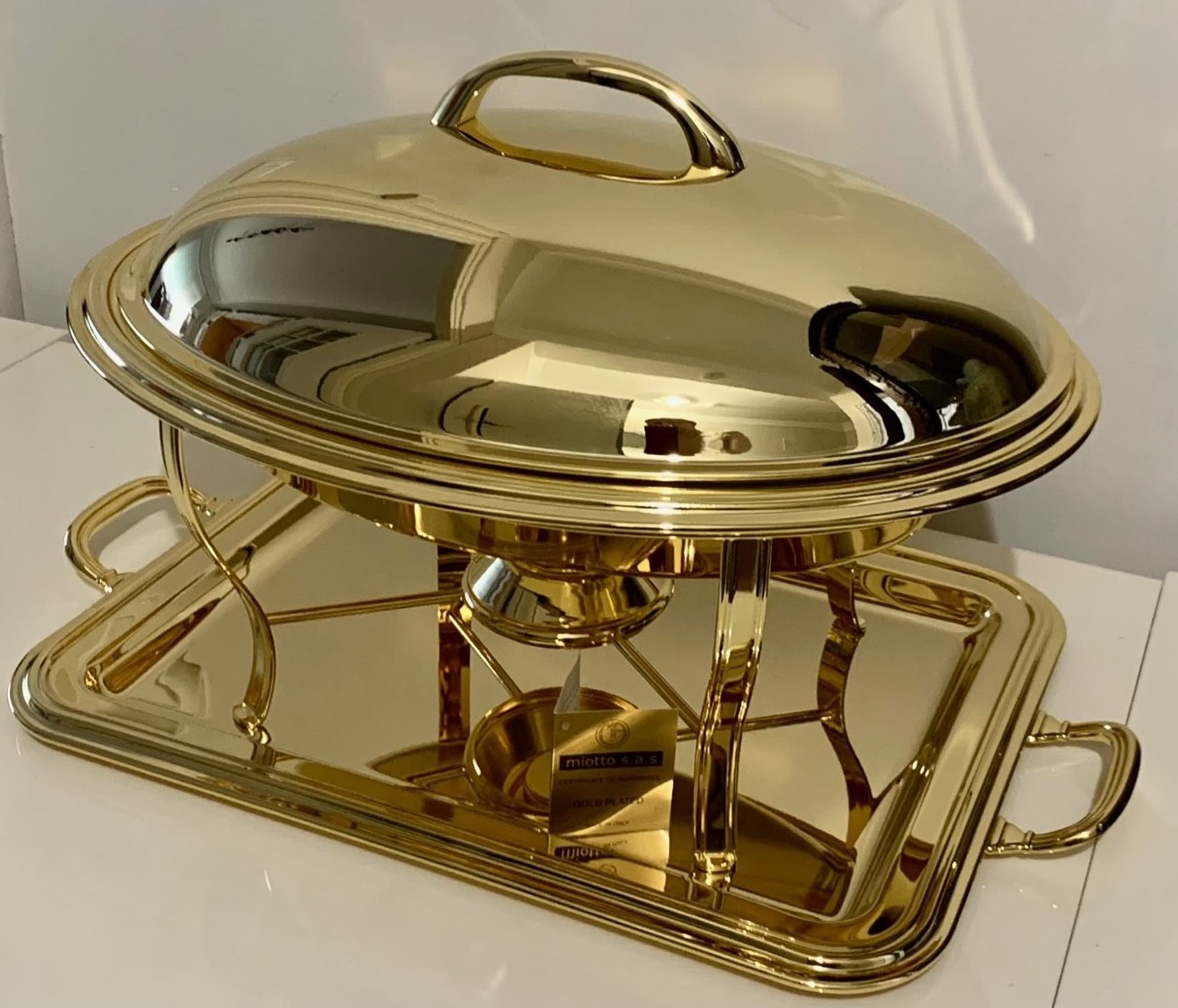 MIOTTO 24K GOLD PLATED OVAL FOOD CONTAINER WITH COVER 24k gold-plated oval chafing dish with support, cover and ceramic inside