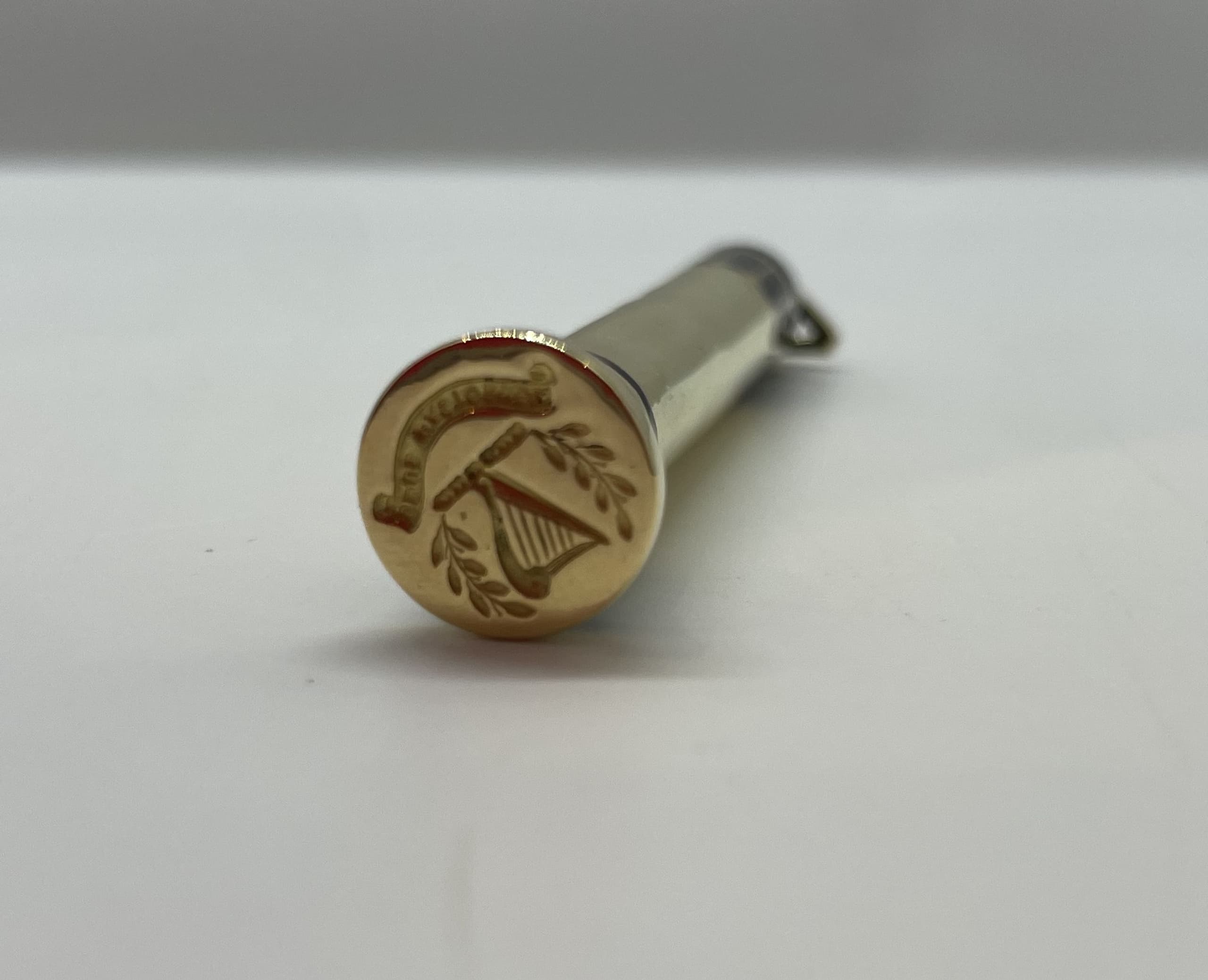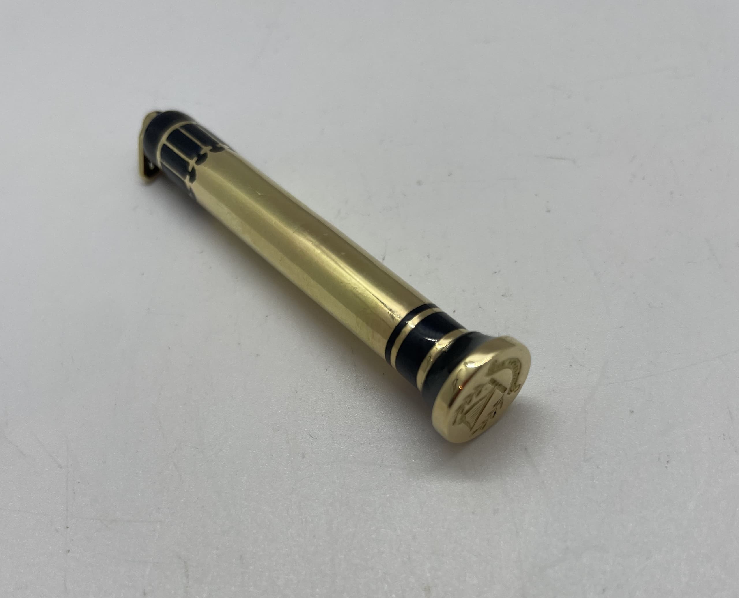 Cylindrical telescopic pencil, the gold cover with an Art Deco design enameled black, one end terminating in a seal engraved with a coat-of-arms and the motto ‘EU PASTORME’ (I am a shepherd), the other with an enameled loop and a stylized Art Deco triangular-shaped ringlet