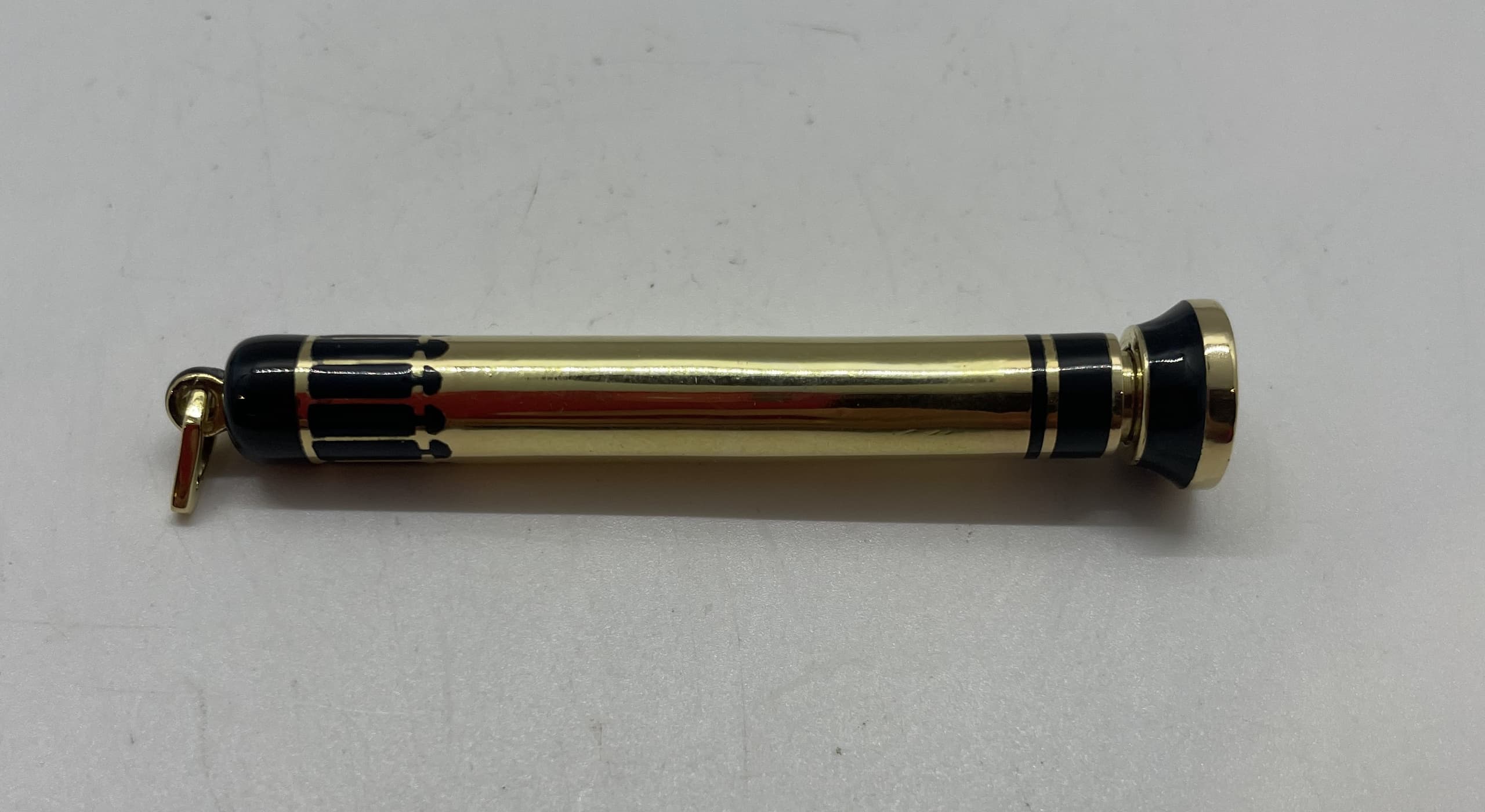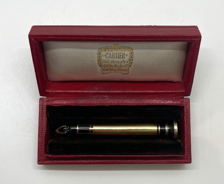 Accessories such as writing instruments entered Cartier’s inventory early after the opening of Cartier at 13 rue de la Paix. Following the evolution of style from the Belle Epoque to Art Deco, these accessories were no longer decorated in guilloche enamel but with champlevé enamel with geometric designs. The ringlet permitted the pencil to be placed on a chain around one’s neck, man or woman, for use at the races, or at the end of a watch fob or a watch chain with a vesta case, a cigar-cutter, or a penknife. The seal function was an added ‘gimmick’ in an era when many people still sealed letters with molten wax.