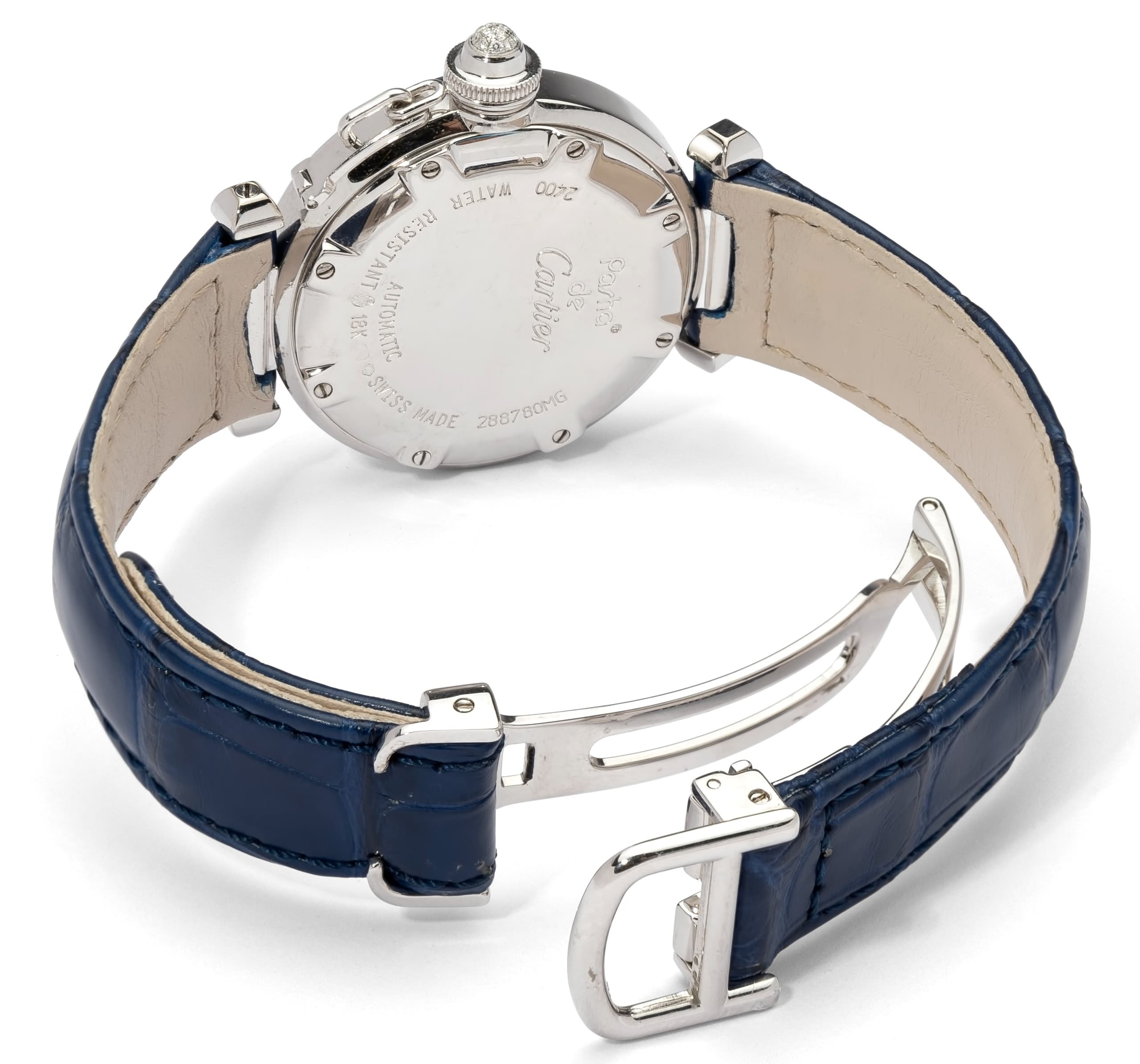 Case: round, 18k white gold, caseband and winding crown set with 72 brilliants weighing approximately 0.30 ct., screw lock, signed 'Pasha de Cartier', no. 2400