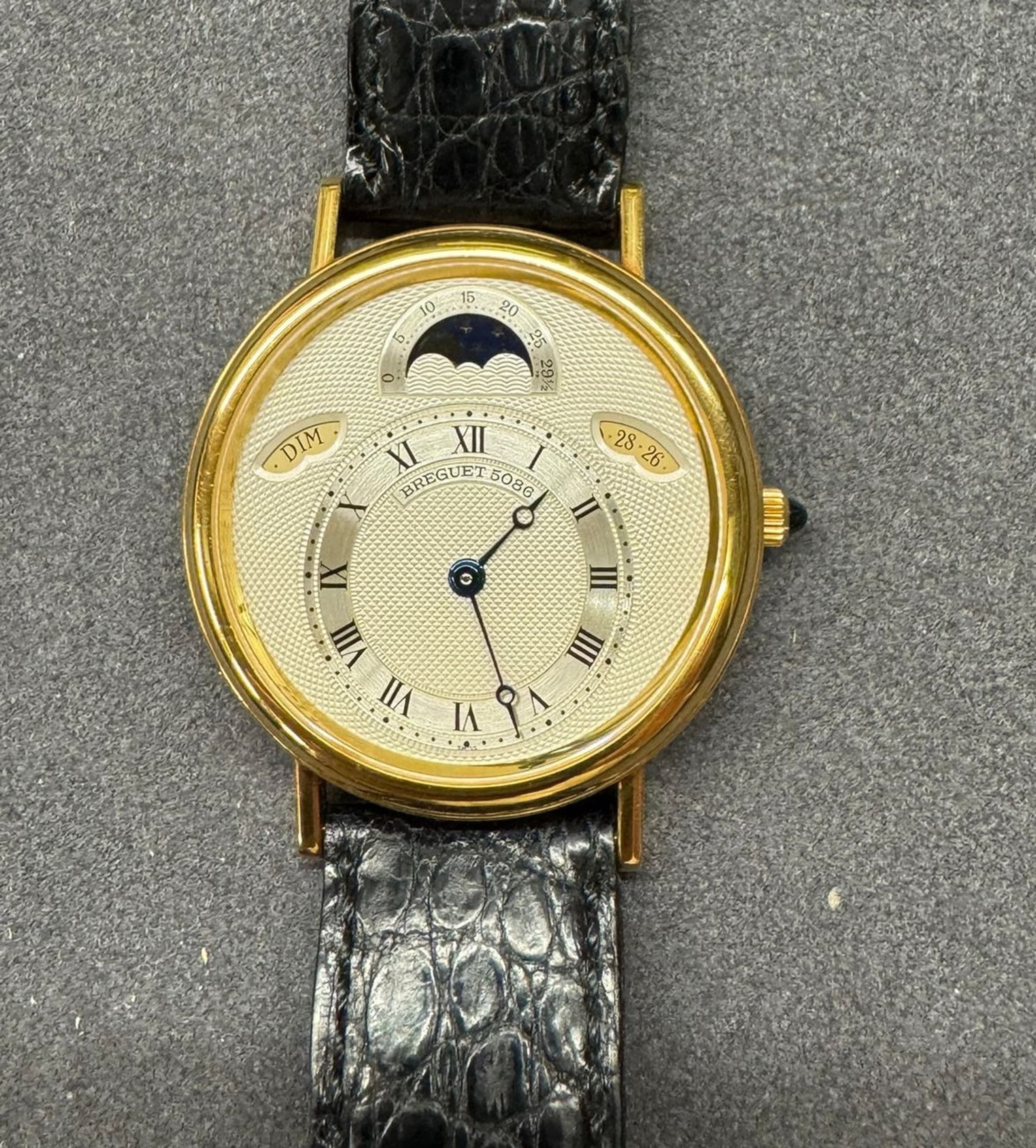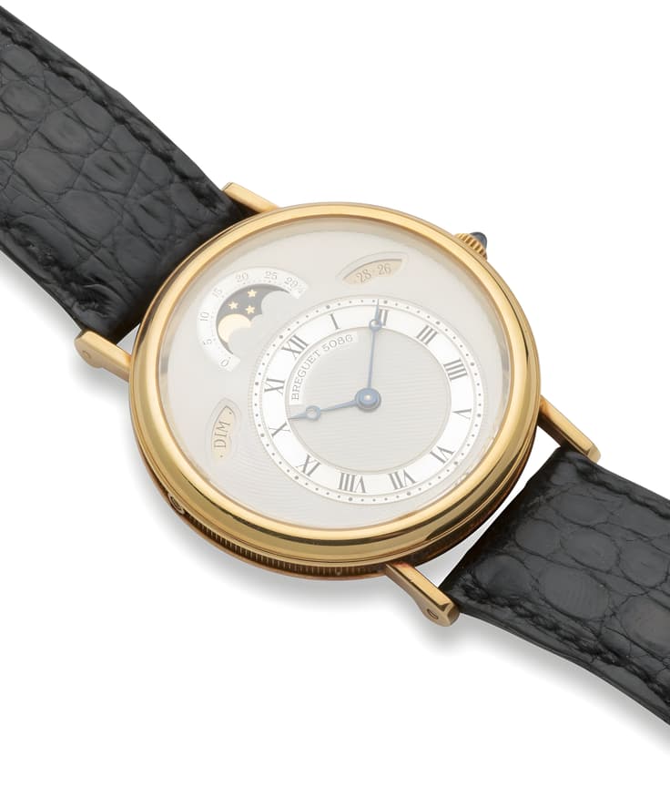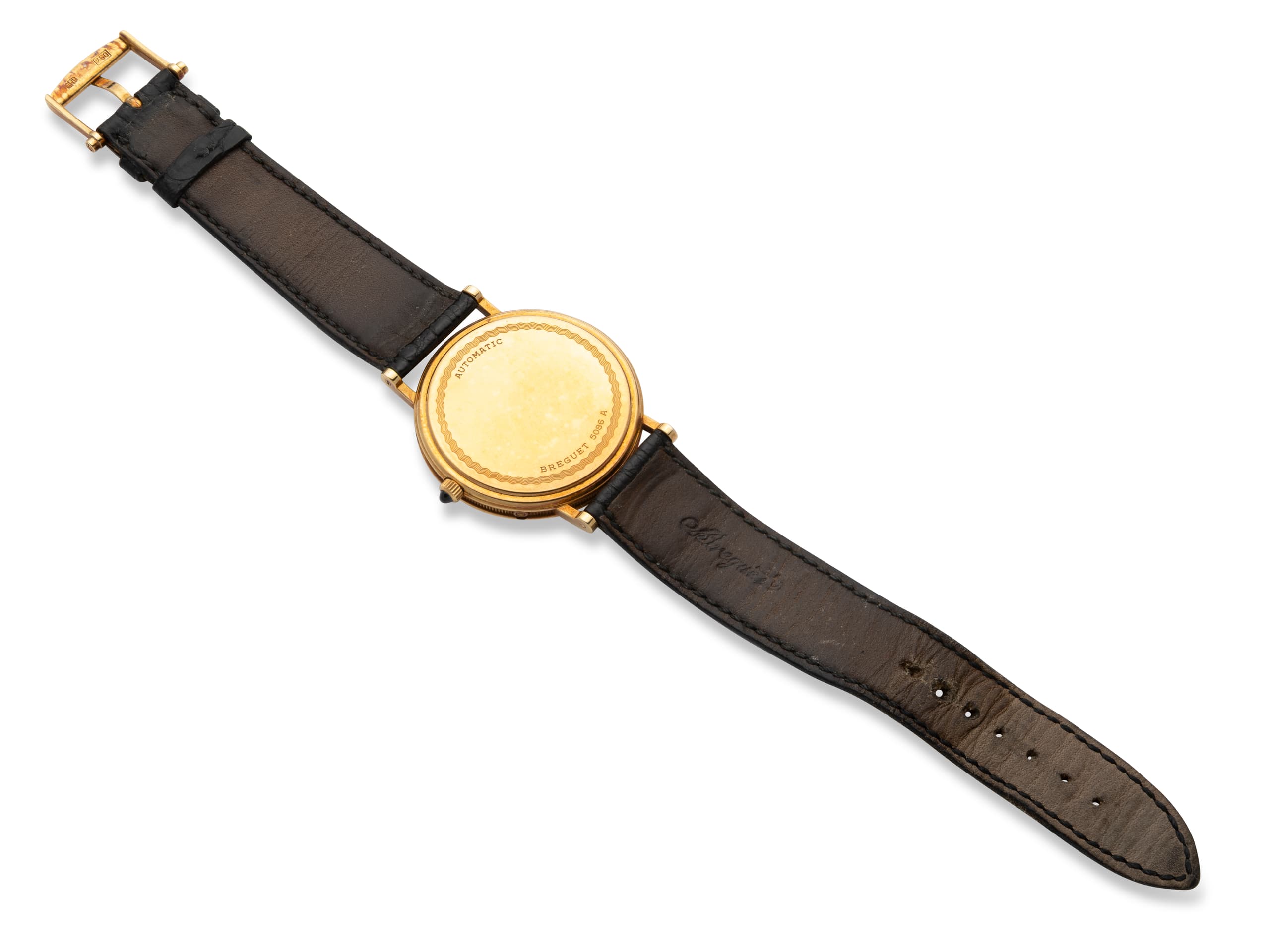 Reference : 3330BA Case: 18k yellow gold Dial: hand guilloche, Roman numerals, date display at 2 o'clock, day display in French at 10 o'clock, moon phase display at 12 o'clock Movement : automatic Diameter: 35.5 mm Strap: black alligator leather Buckle: gold pin buckle Hallmarks: '750' Dial, case and movement signed ‘Breguet’ gross weight : 57 gr. circa 2000