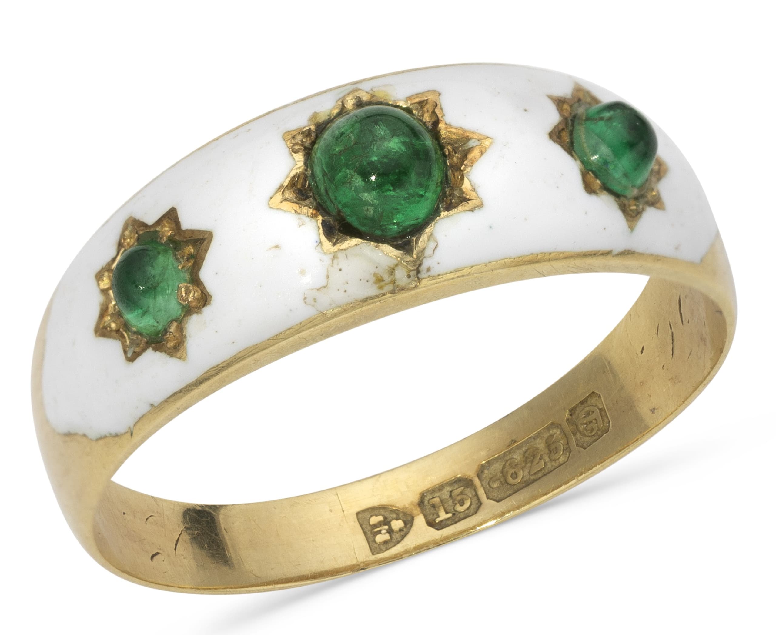 15k yellow gold and white enamel ‘Jarretière’ ring set with cabochon emeralds weighing in total approximately 0.25 ct. Hallmarks: ‘15’ ‘625’ english gold hallmarks prior to 1932 size: 58 gross weight: 3.02 gr. condition: overall good condition, small accident on enamel