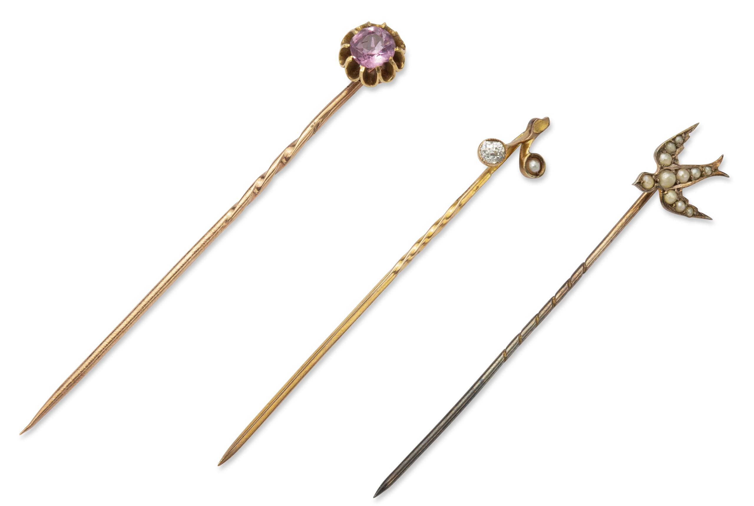 including one pin decorated with a diamond and a natural pearl, one bird-shaped pin decorated with natural pearls, and one pin decorated with amethyst. total gross weight: 4.07 gr.
