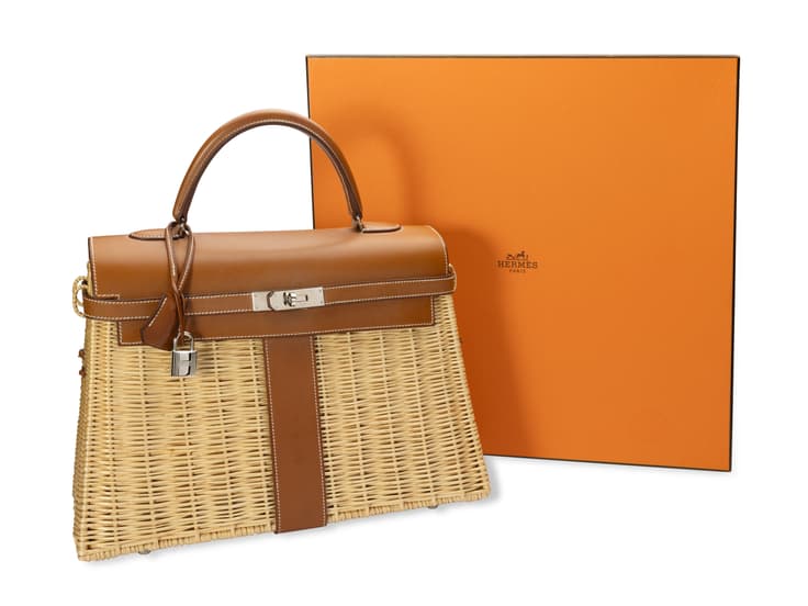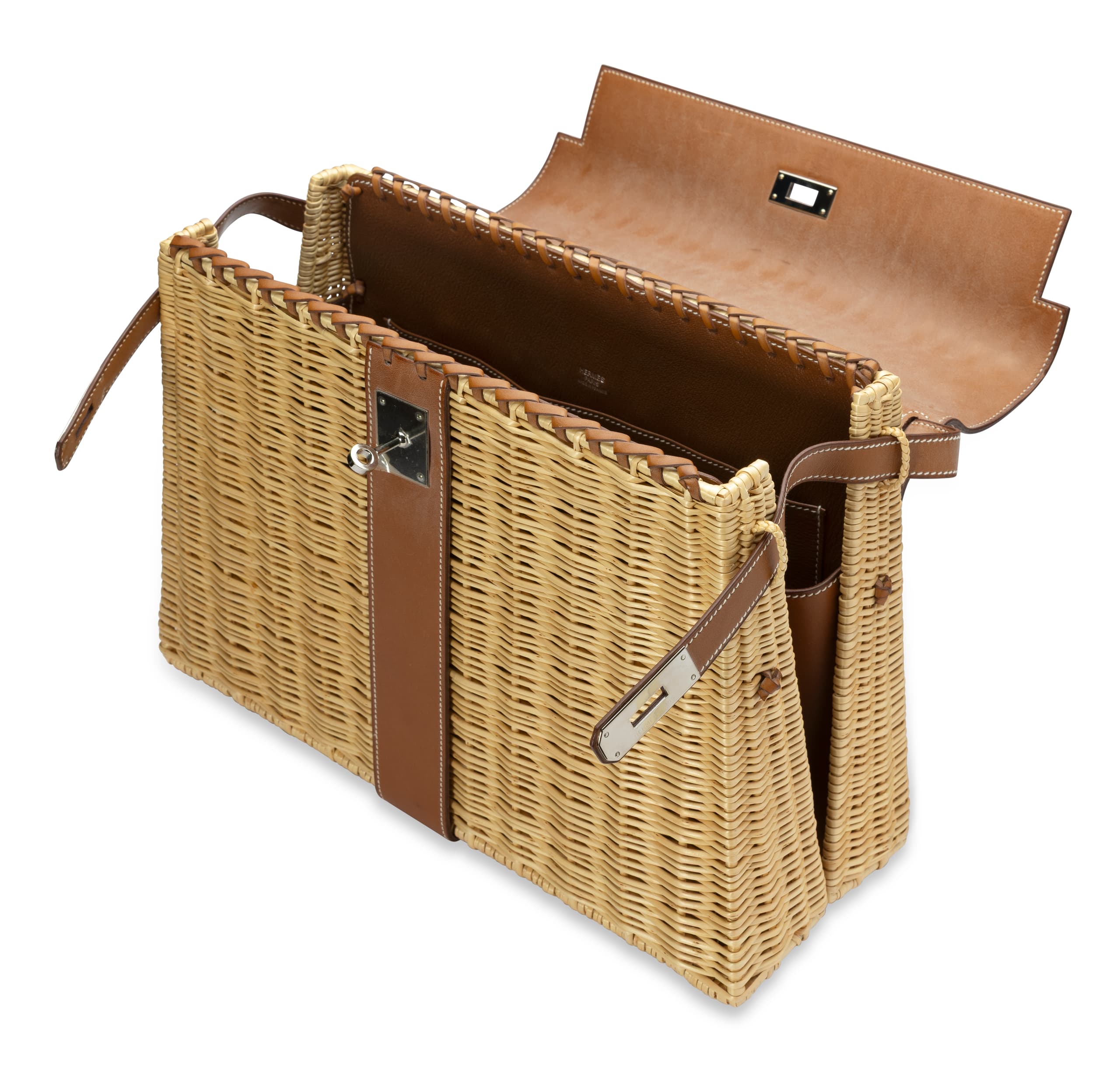 Picnic bag Kelly in osier wicker with a front flap of barenia leather with palladium hardware single rolled handle
