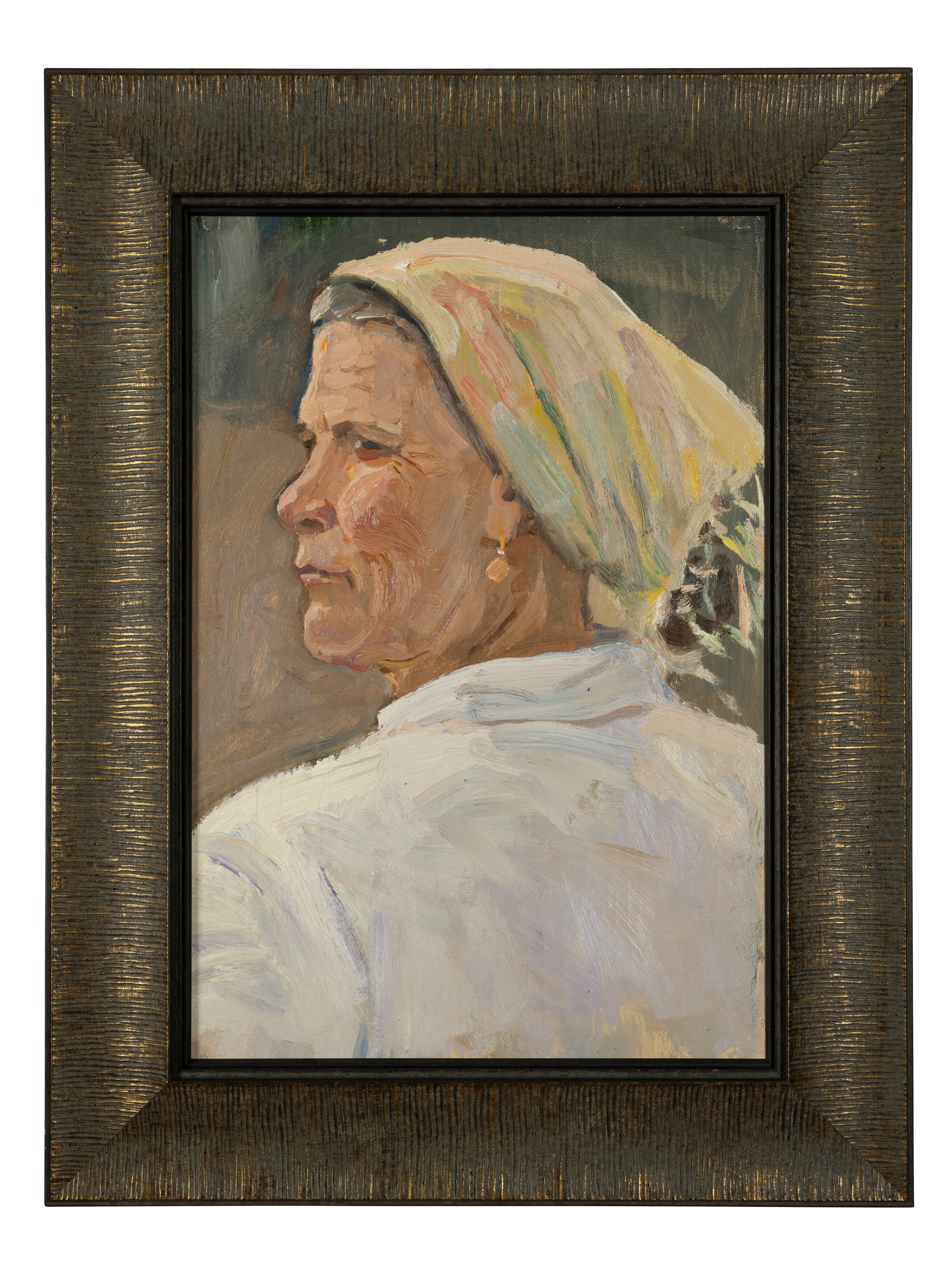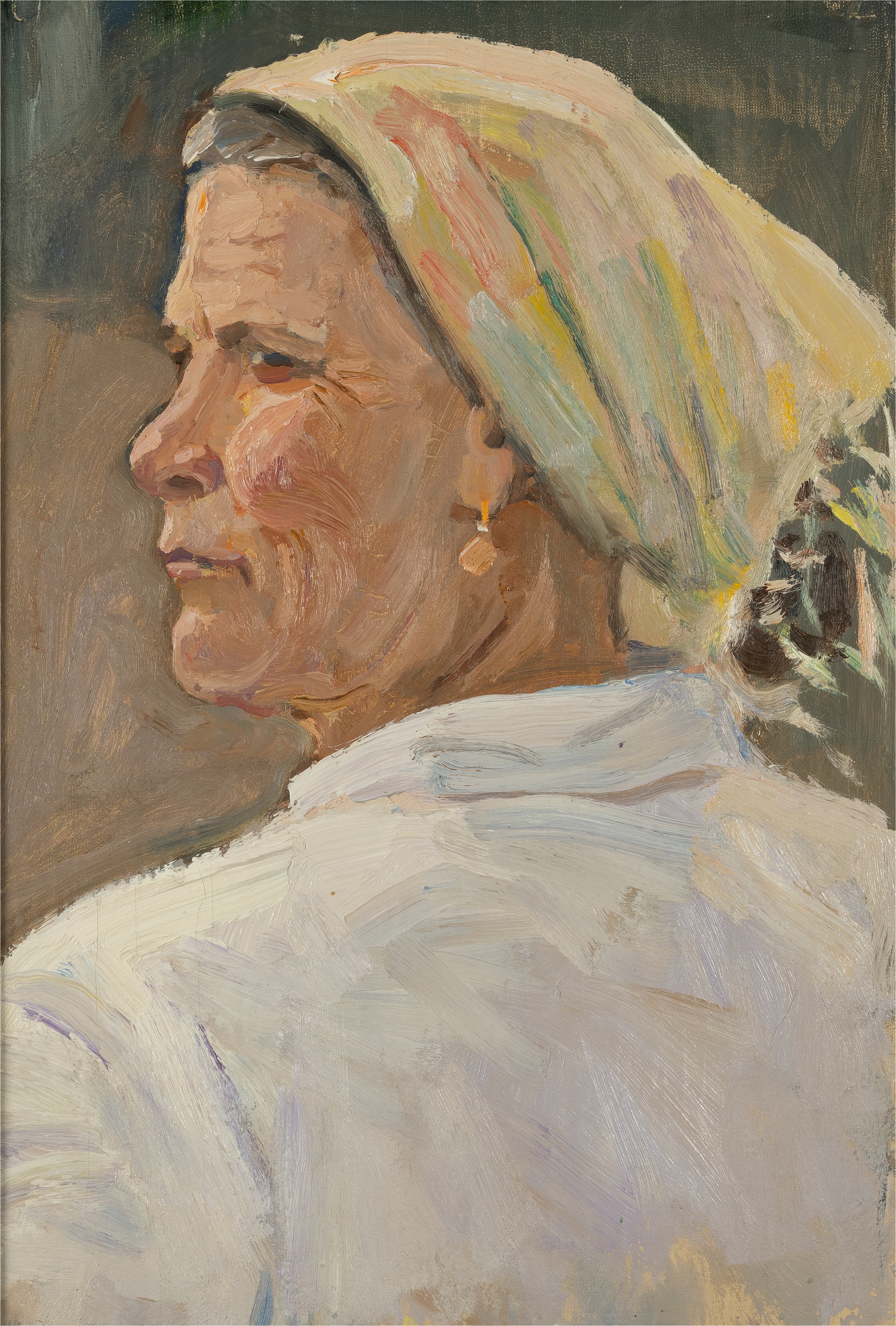 Depicted with sculptural clarity, sunlit, wind-burnished cheeks and a bold posture, the subject conveys both physical strength and inner calm. This portrait of a collective farmer radiates moral integrity and robust health — hallmarks of Deineka’s mature style. In Kolkhoznitsa, the artist creates a typical image that encapsulates the ‘spirit of the era’, and the enduring optimism of the post-war years.
