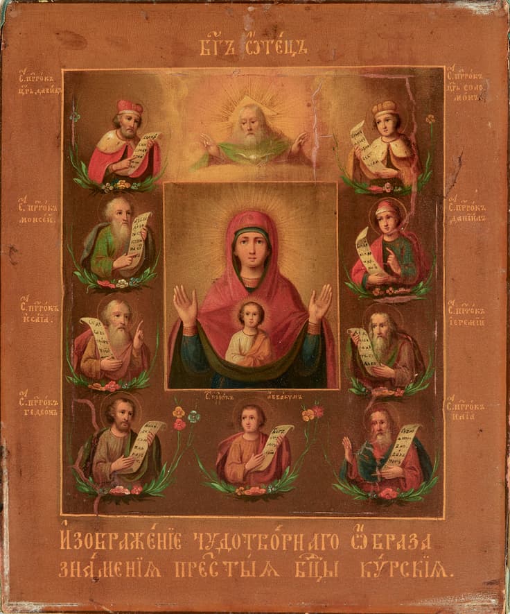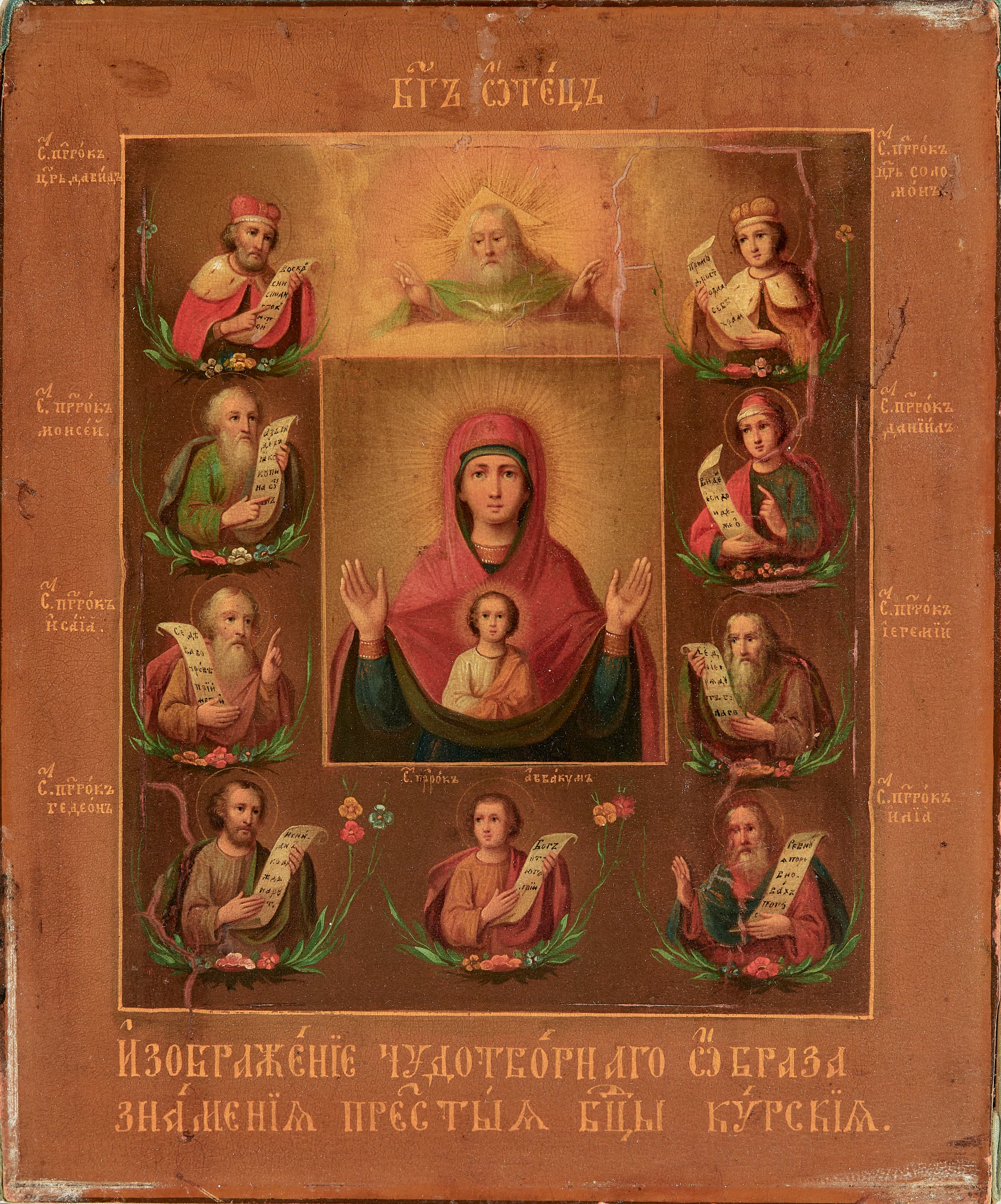 The Icon 'The Mother of God Kurskaya Korennaya' depicts the Mother of God carrying the Christ Child, surrounded at the edges by the image of God Sabaoth, Lord of Hosts, and the prophets of the Old Testament. The icon is venerated as miraculous and wonder-working. In 1812, a copy of the icon was sent to Kutuzov's army. The original was found in 1295 not far from Kursk, burnt by the Tatars. Until 1918, it was kept in the Znamensky monastery in Kursk, now in the Znamensky cathedral in New York. In 1880-1883, the painter Ilya Repin used 'The Religious Procession in the Province of Kursk' as the subject of one of his best-known paintings.