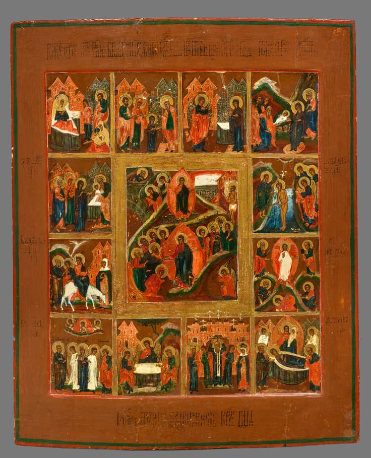 Condition: multiple retouches on the painting of the ‘facial’ part and clothes, halos and leaf background ‘stained’ with bronze paint. Composition of the icon is performed in traditions of Russian iconography with two events united in center into one scene, supplemented by images of The Twelve Great Feasts, the twelve most important feasts in Orthodoxy, placed into separate stamps.