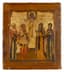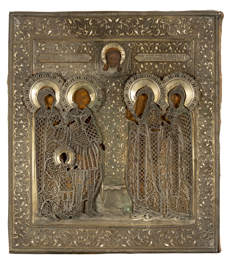 ICON ‘SELECTED SAINTS BEFORE ‘THE HOLY FACE OF JESUS (SPAS NERUKOTVORNY)’ IN SILVER OKLAD Russia, early 19th century (icon), late 19th century (oklad)