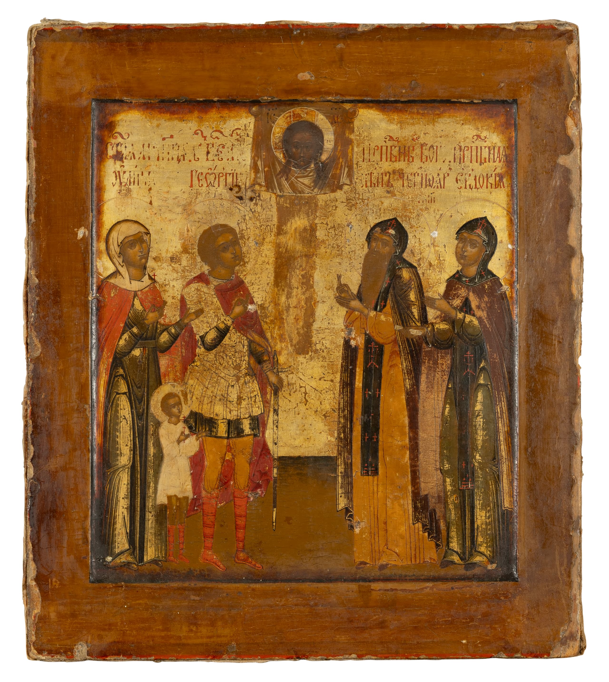 The image of the Holy Face of Christ is flanked by Saints martyrs Cyricus and Julitta, George, Bogolep of Chorny Yar and Eudokia. Saint Bogolep was a young monk who lived in the 17th century, died at the age of 7 and was canonized in the early 20th century. In this icon, he is depicted as an adult monk, which is a mystery and an iconographic rarity.