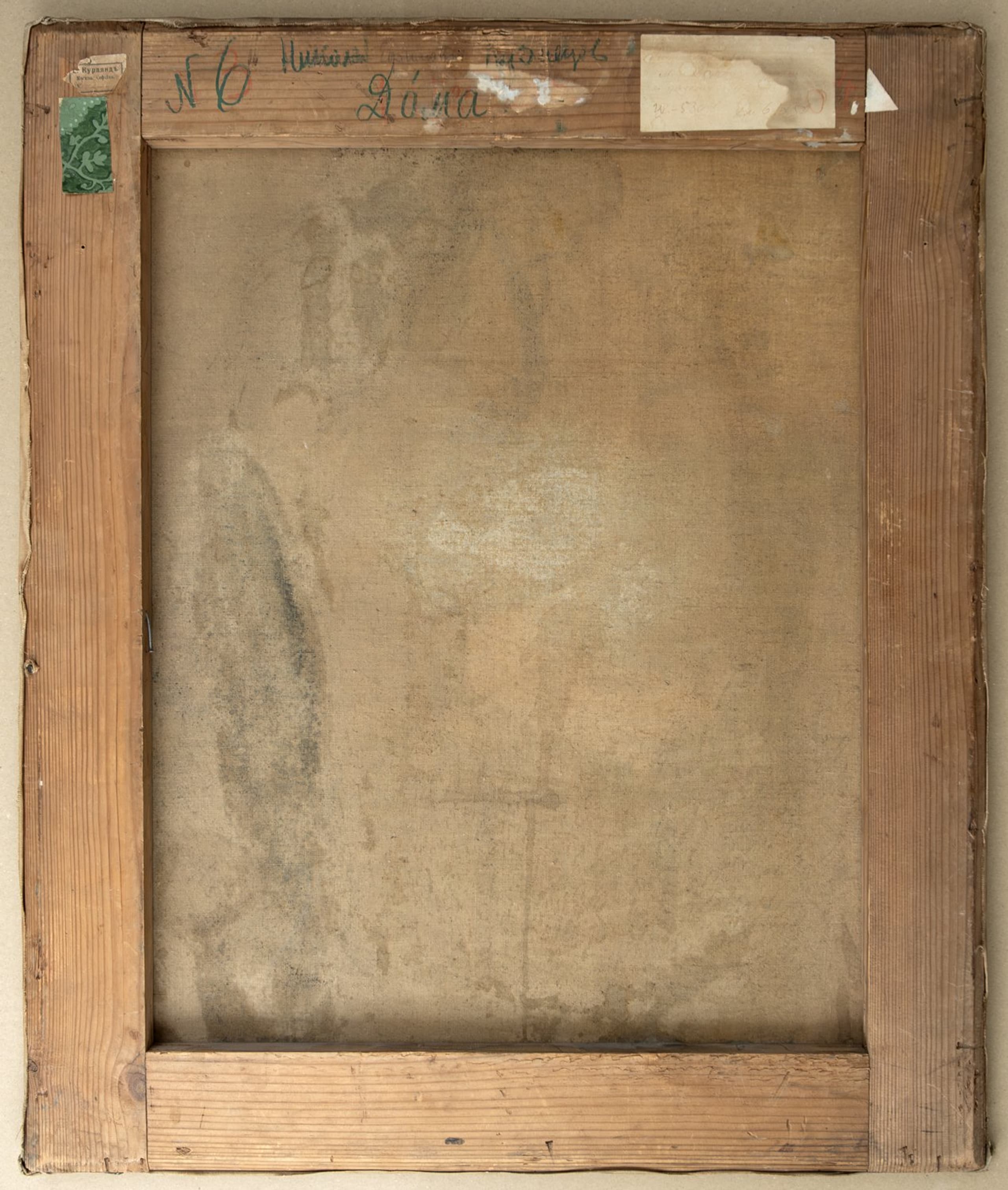 signed in Cyrillic ‘N Kuznetsov’ (lower left), signed and titled in Cyrillic (on the reverse of the stretcher), an old label in Cyrillic ‘Kurland. Moskva. Sofiyka’ affixed to the reverse of the stretcher