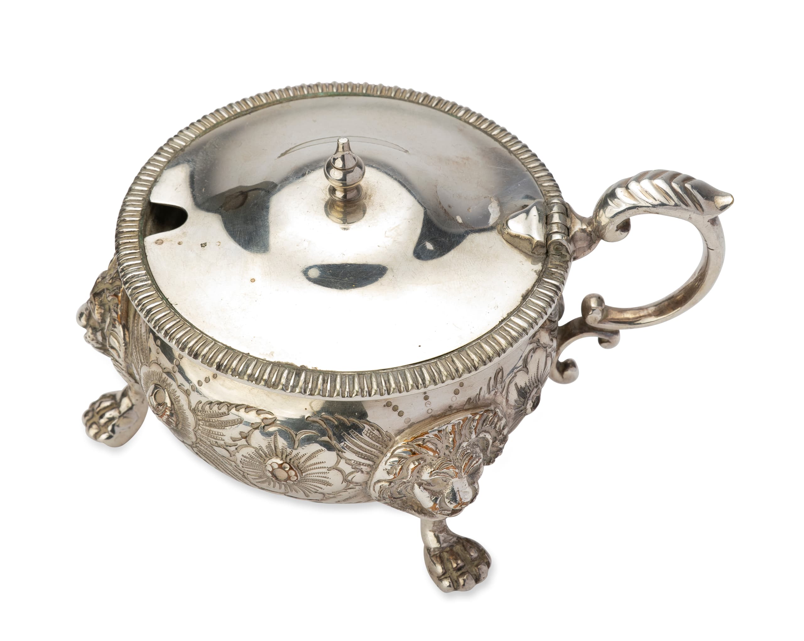 silver-plated metal sugar bowl featuring decorative lion-head feet and chiselled floral motifs