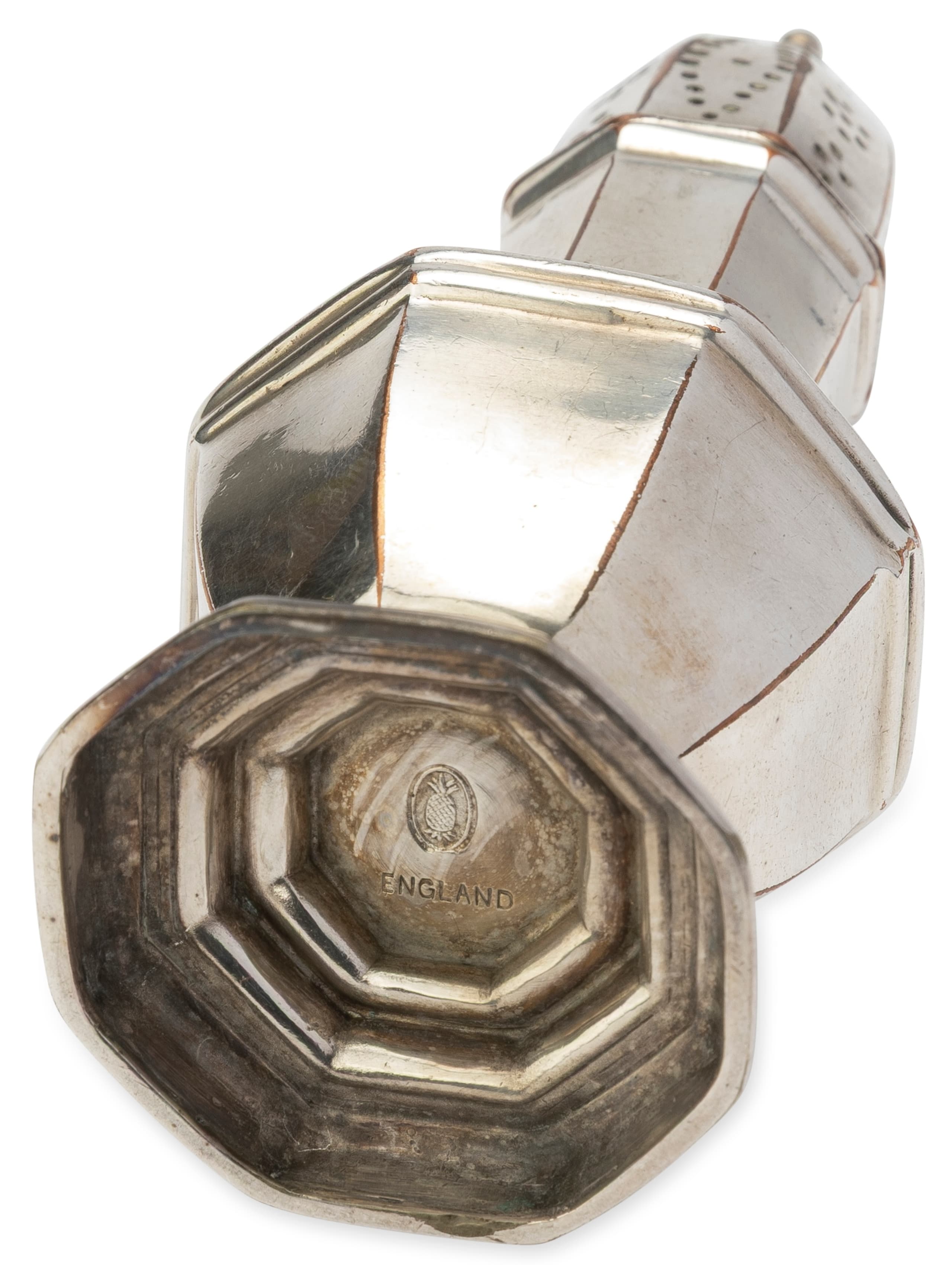 Mark: maker’s mark ‘pineapple symbol’ (for the Barker-Ellis firm of Birmingham, from 1906), ‘England’ (high-quality silver-plated metalwork intended for export, particularly to the United States)