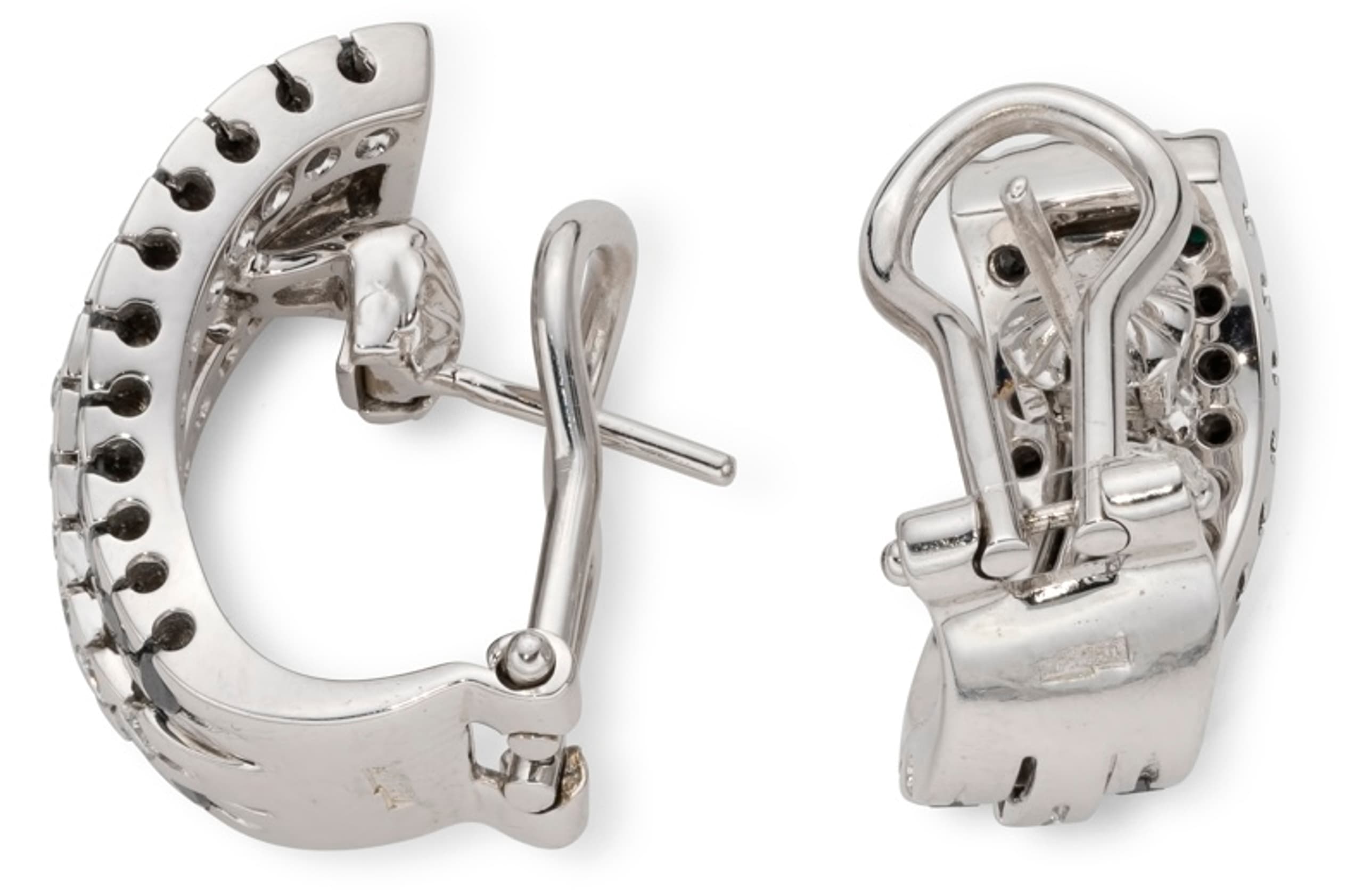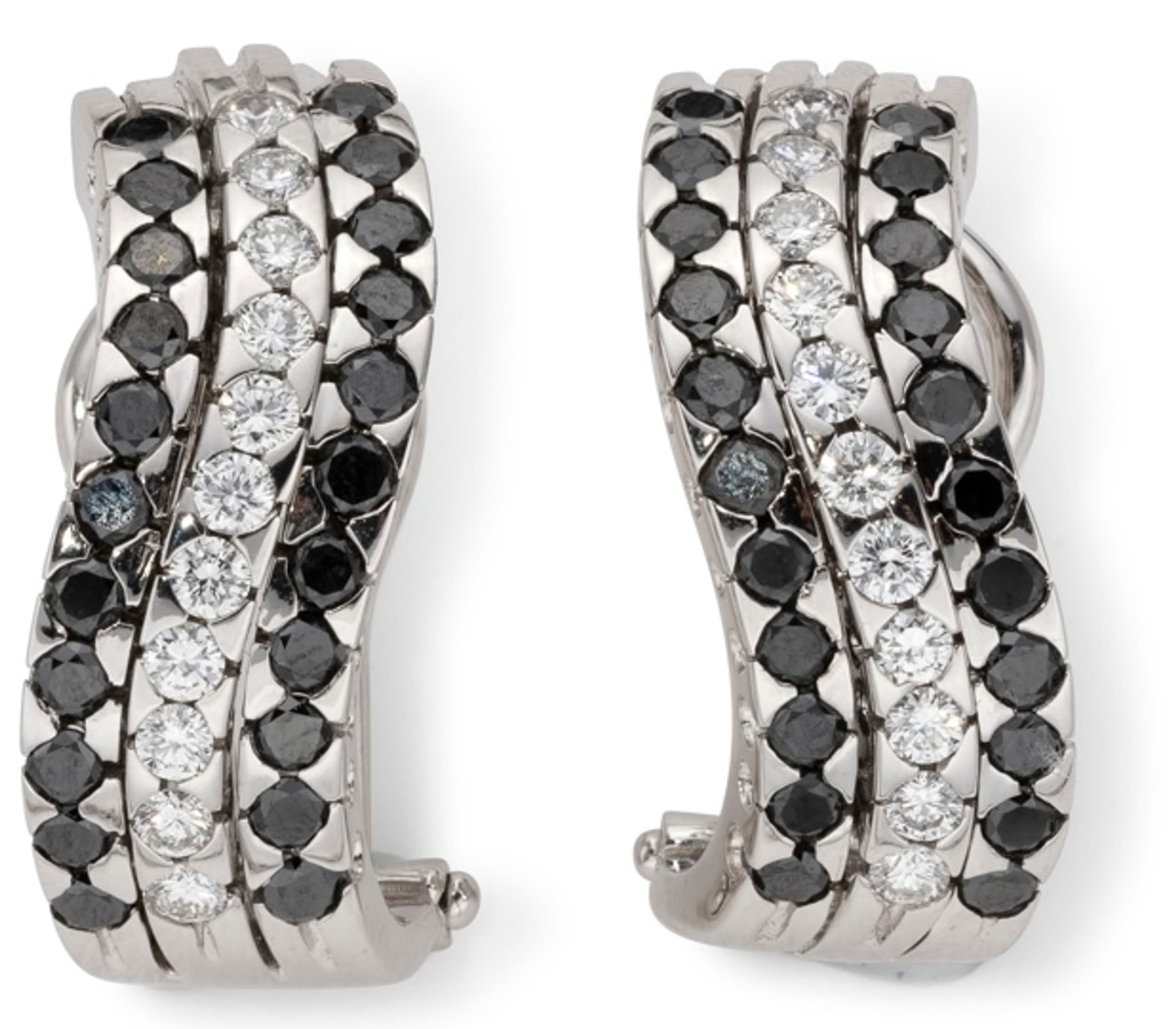 pair of 18k white gold earrings set with black diamonds weighing approximately 1.36 ct. and white diamonds weighing apB244proximately 0.60 ct.