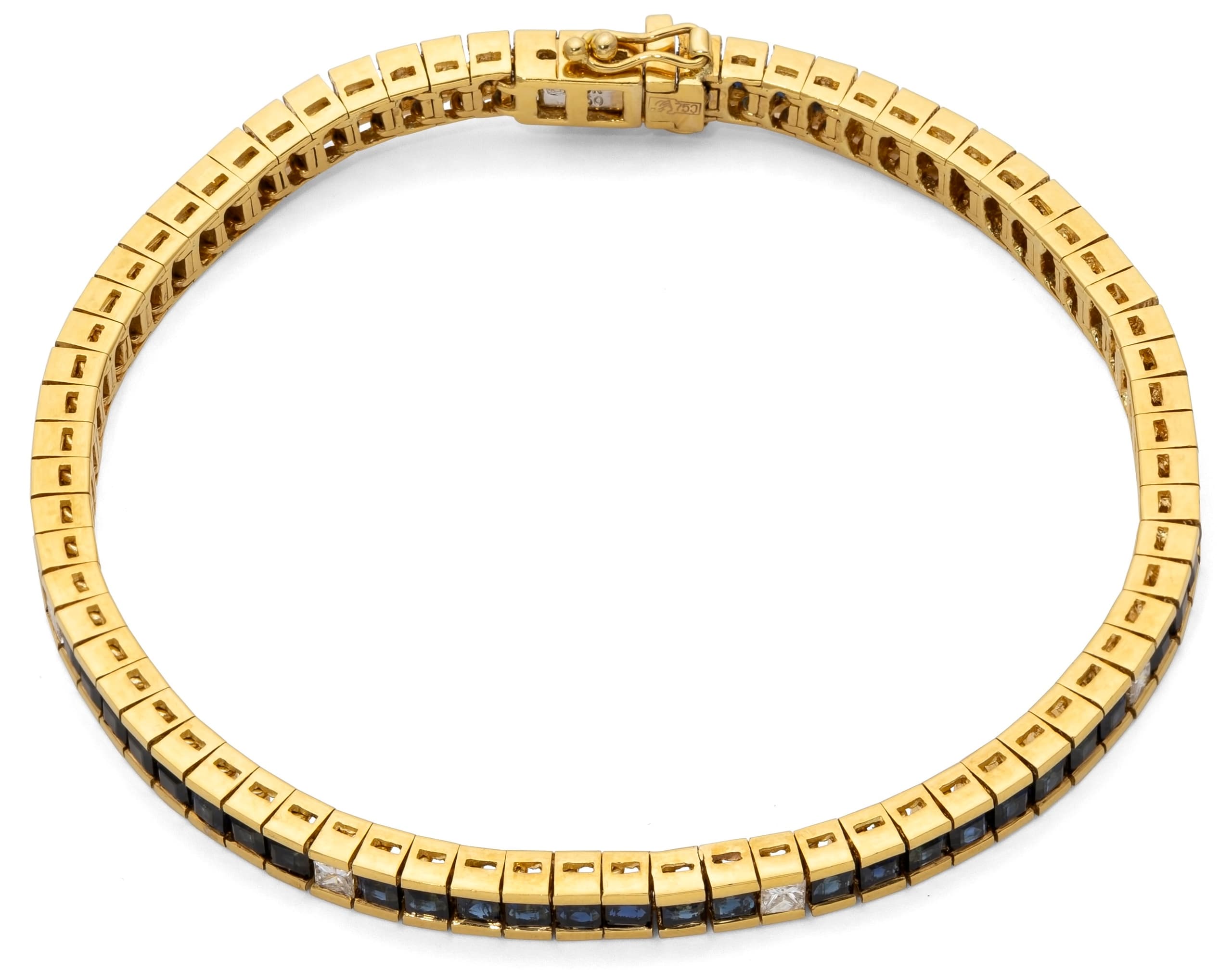 18k yellow gold bracelet set with 8 princess cut diamonds weighing approximately 0.64 ct. and 64 calibrated sapphires weighing approximately 7.68 ct.