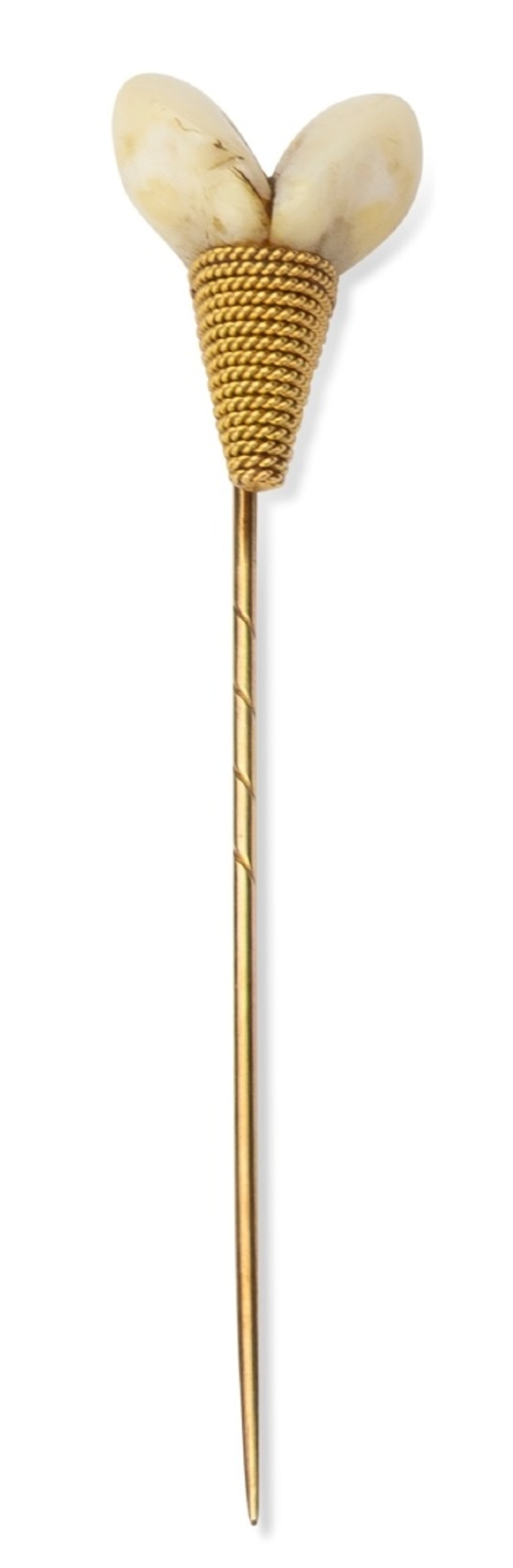 14K gold tie pin set with warthog tusks, likely a hunting trophy Hallmarks: ‘585’, ‘14K’ L. circa 8 cm gross weight: 4.45 gr.