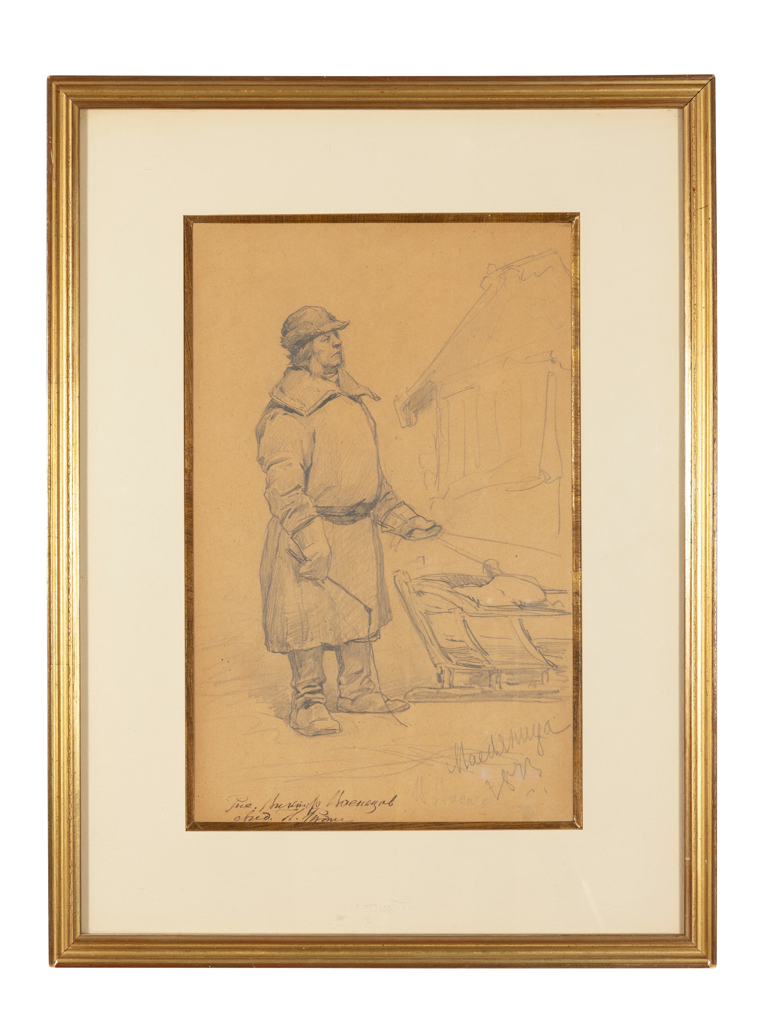 signed, titled in Cyrillic and dated in pencil ‘V. Vastets/ Maslenitsa/ 1873’ (lower right), inscription by Ilya Efimovich Repin in Cyrillic ‘Ris. Viktor Vasnetsov… Ilya Repin’ (lower left)