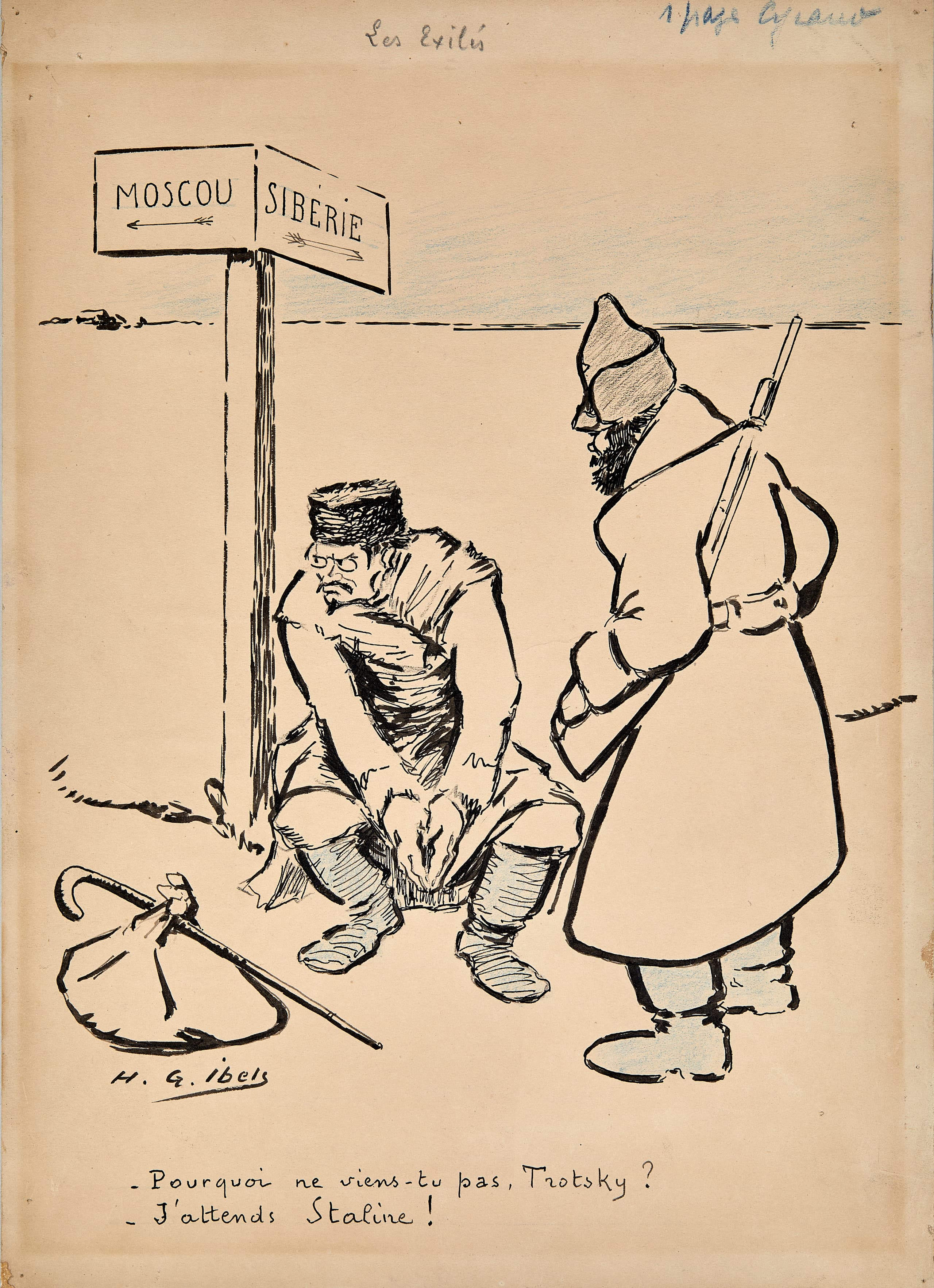 signed 'H.G.Ibels (lower left), inscribed 'Pourquoi ne viens-tu pas Trotsky ? / J'attends Staline!' ink, graphite and blue pencil on paper 35 x 26 cm