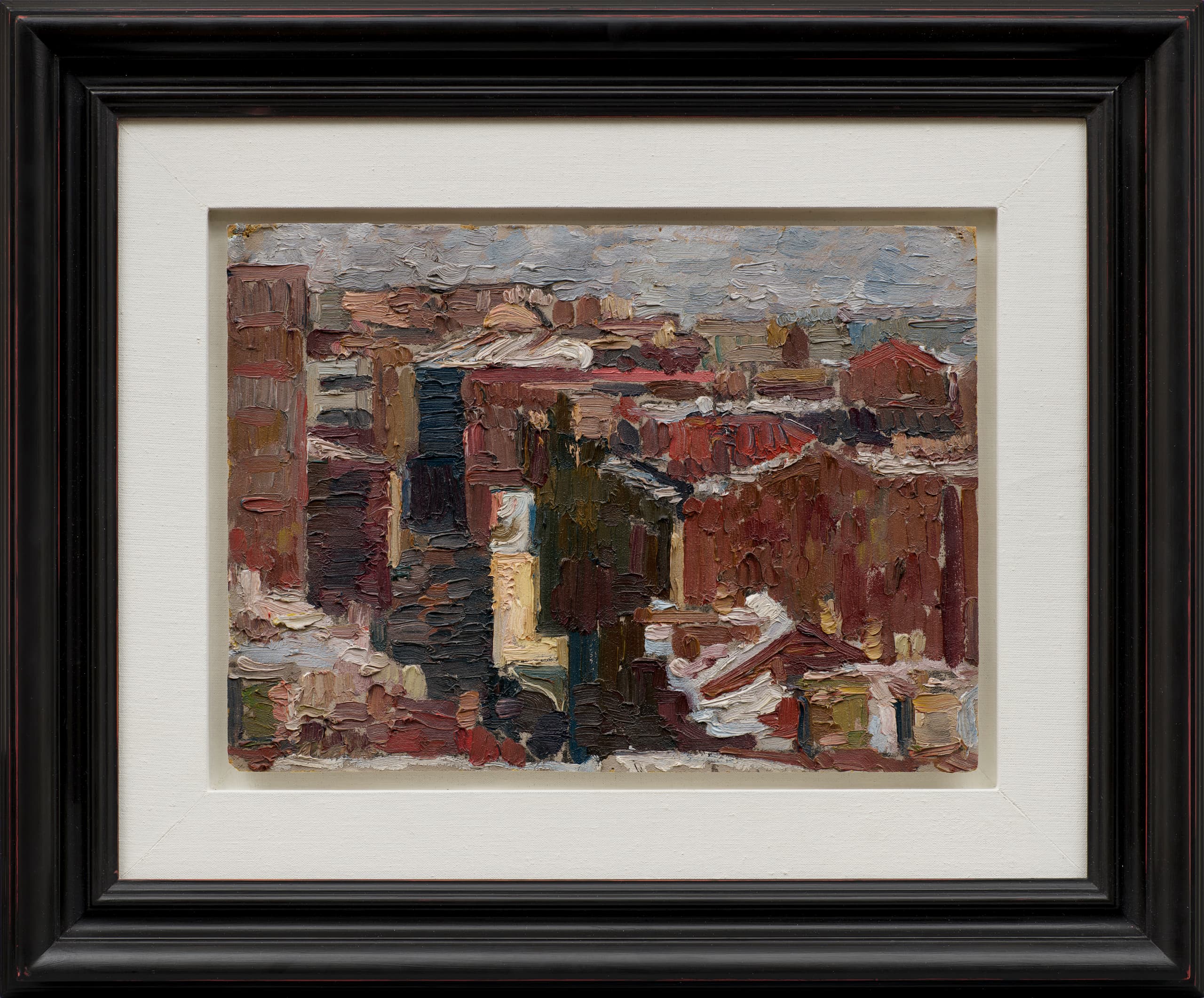 The present painting by Varvara Stepanova belongs to the late period of the artist’s career. After 1934, when Joseph Stalin proclaimed the primacy of Socialist Realism, Stepanova’s artistic activity significantly declined amid increasingly strict censorship. During this period, she focused primarily on design and editorial work. Although she returned to studio painting in the late 1930s, her approach had markedly changed. Moving away from the experimental and constructivist language that had defined her earlier work, she adopted a more restrained style, gravitating toward a form of realism infused with subtle impressionistic qualities. Among her final works are the ‘Moscow Views’ (1938), executed in a more classical manner. These compositions depict bright rooftops rendered with a strong sense of perspective, while a calm, soothing atmosphere is conveyed through delicate greenish and pastel tones.