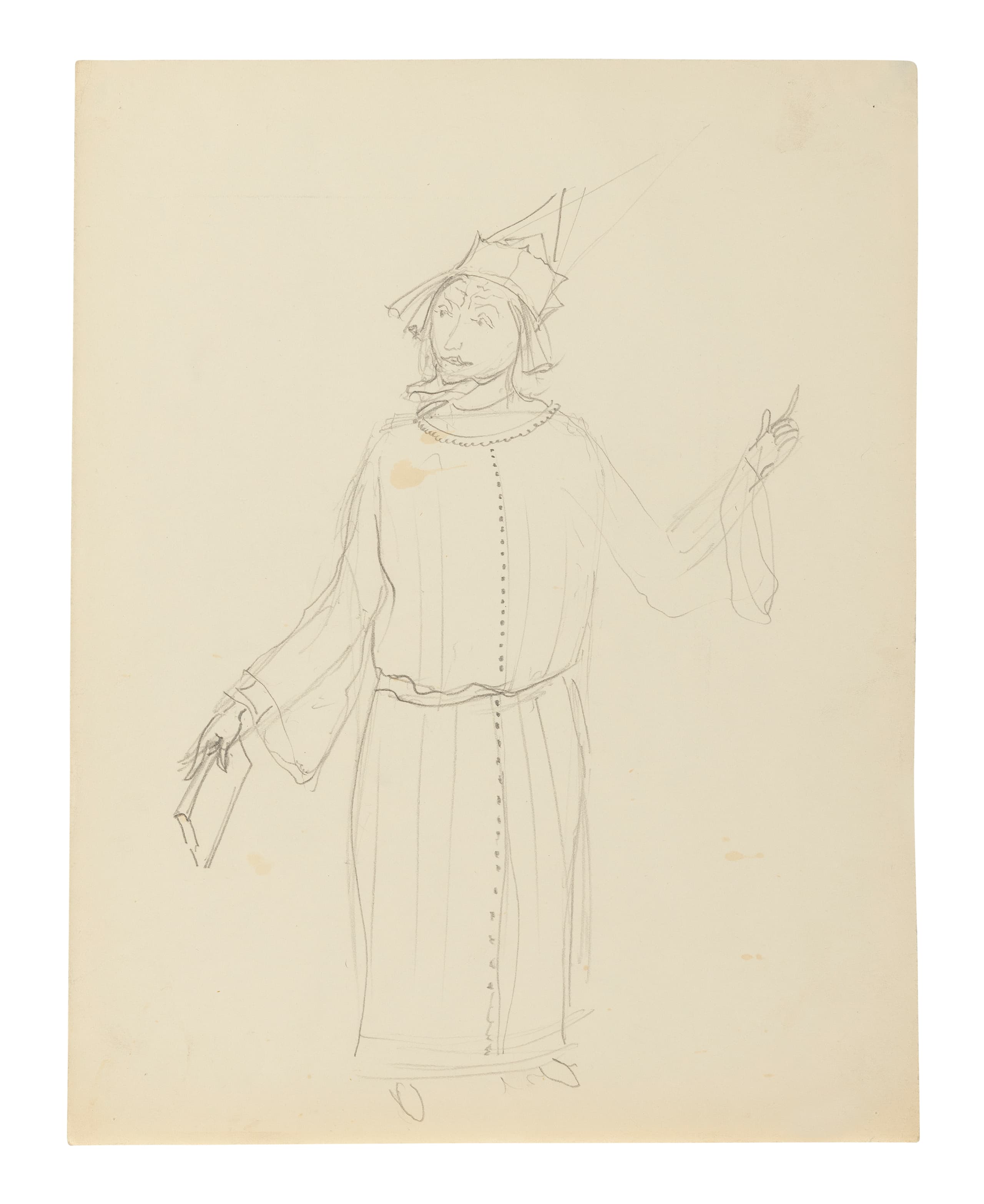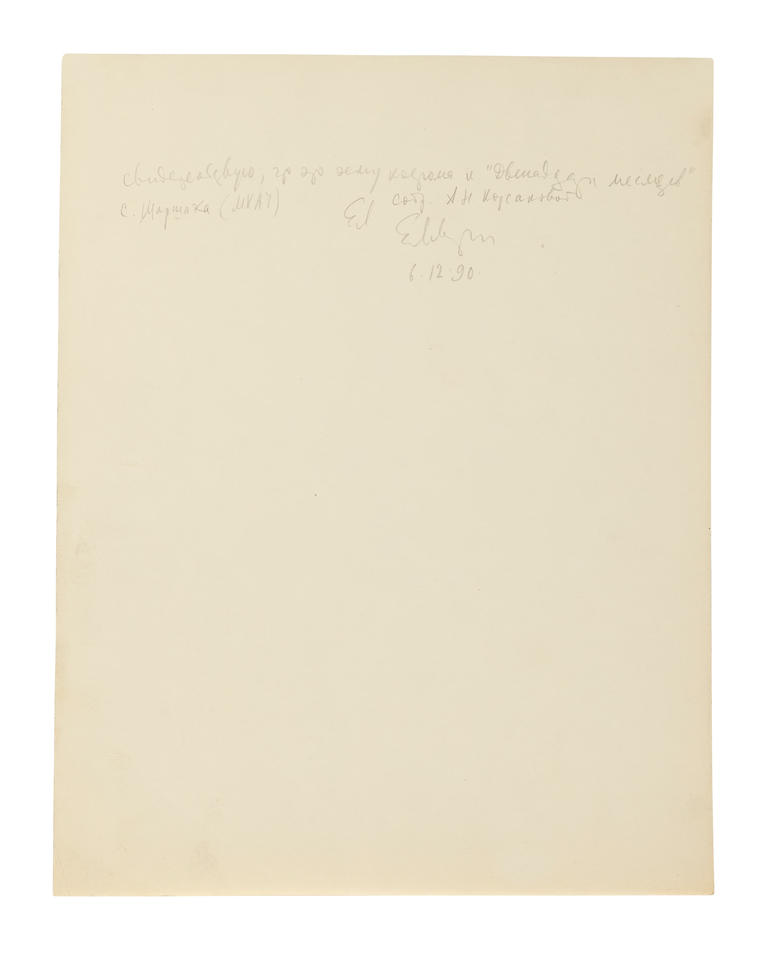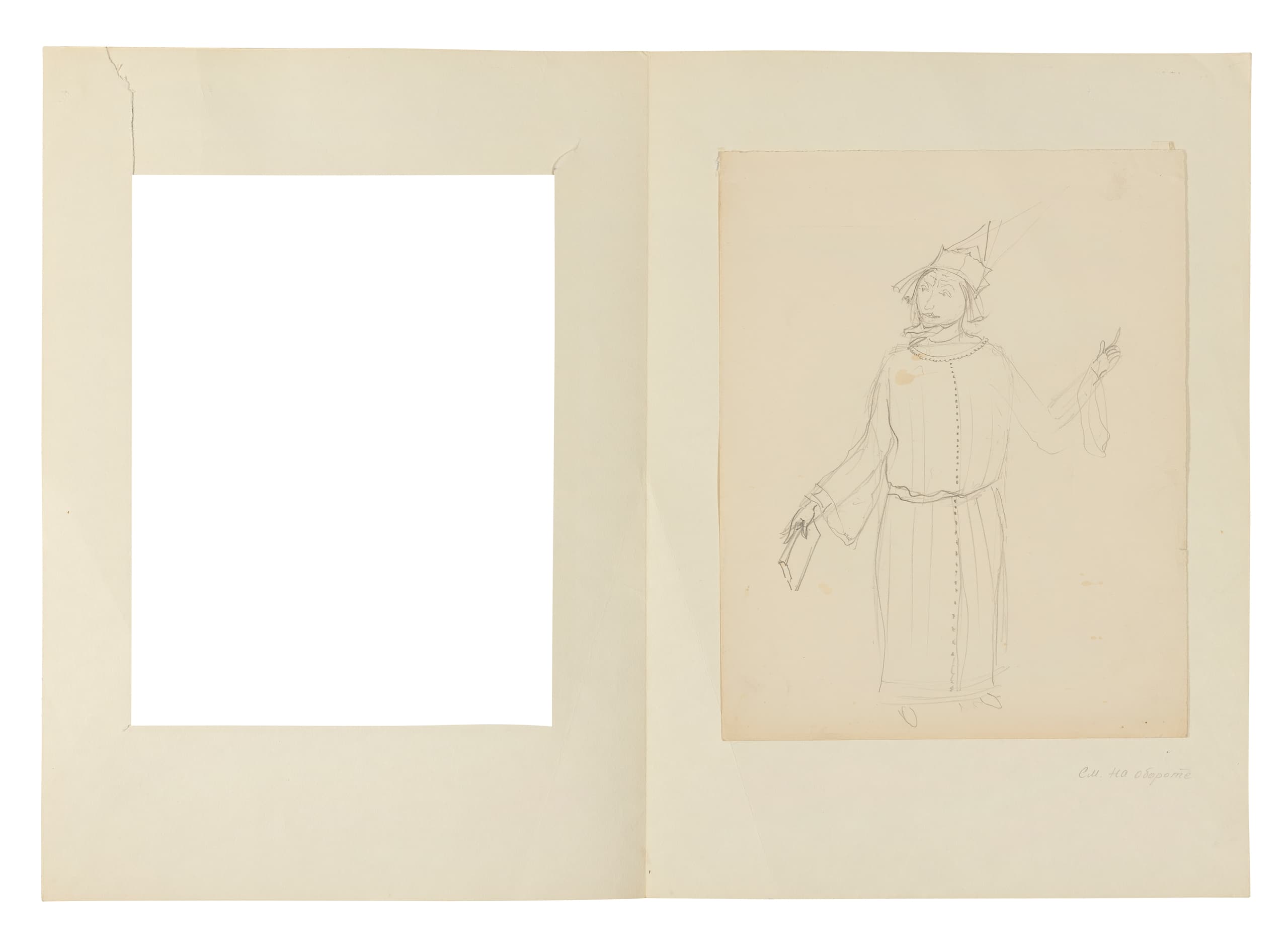 expert’s inscription in Cyrillic by Elena Lvova dated 1990 [I confirm that this is a costume sketch for S. Ya. Marshak’s ‘The Twelve Months’ (Moscow Art Theatre) from the collection of A. N. Korsakova.’ Signed Elena Lvova, dated 6 December 1990.] (on the reverse)