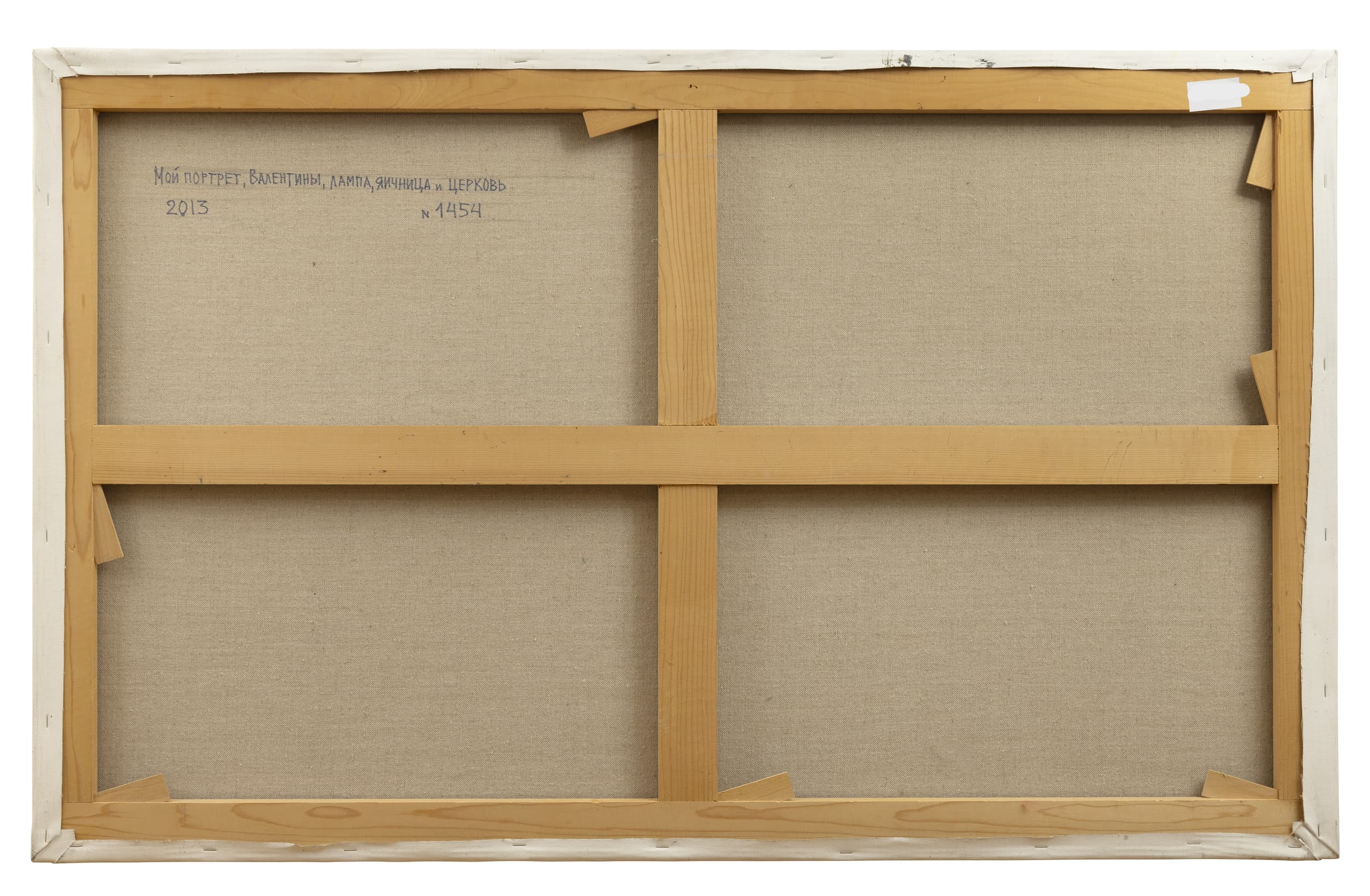 signed and dated ‘OSCAR RABINE 2013’ (lower right); titled in Cyrillic, dated and numbered ‘Moy portret, Valentiny, lampa, yaitchnitsa i tserkov’ (Мой портрет, Валентины, лампа, яичница и церковь)/ 2013/ № 1454’ (on the reverse)